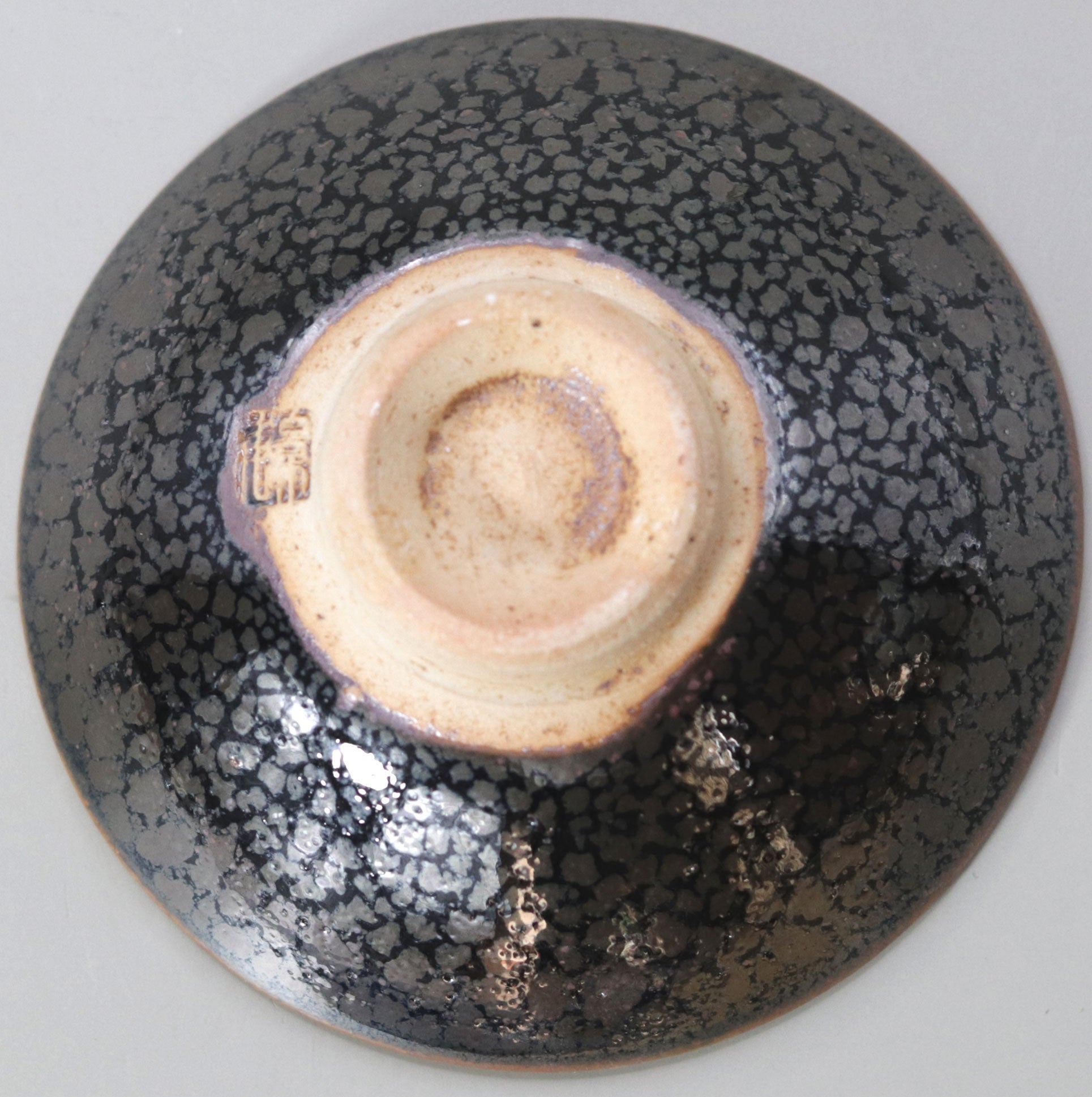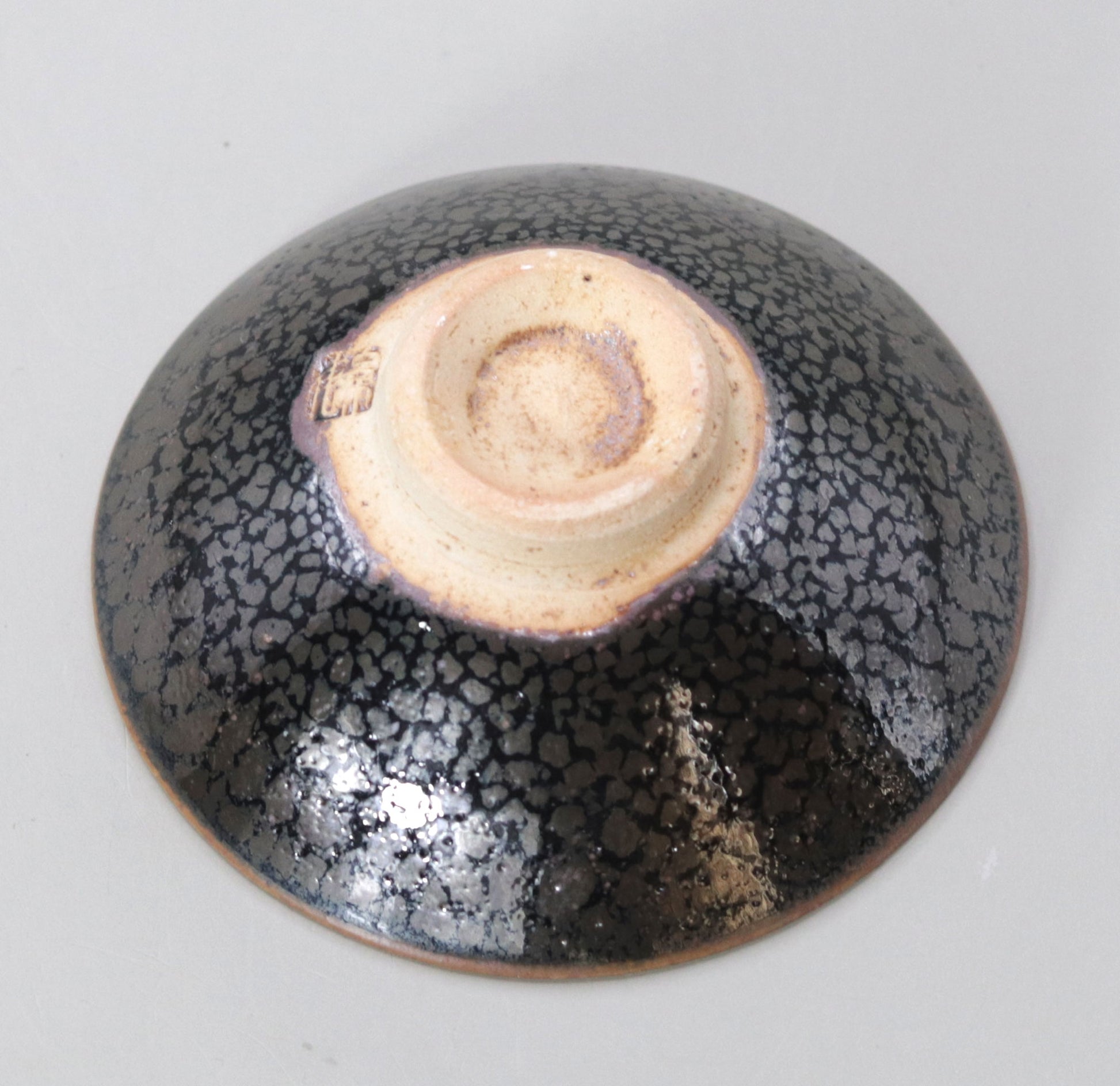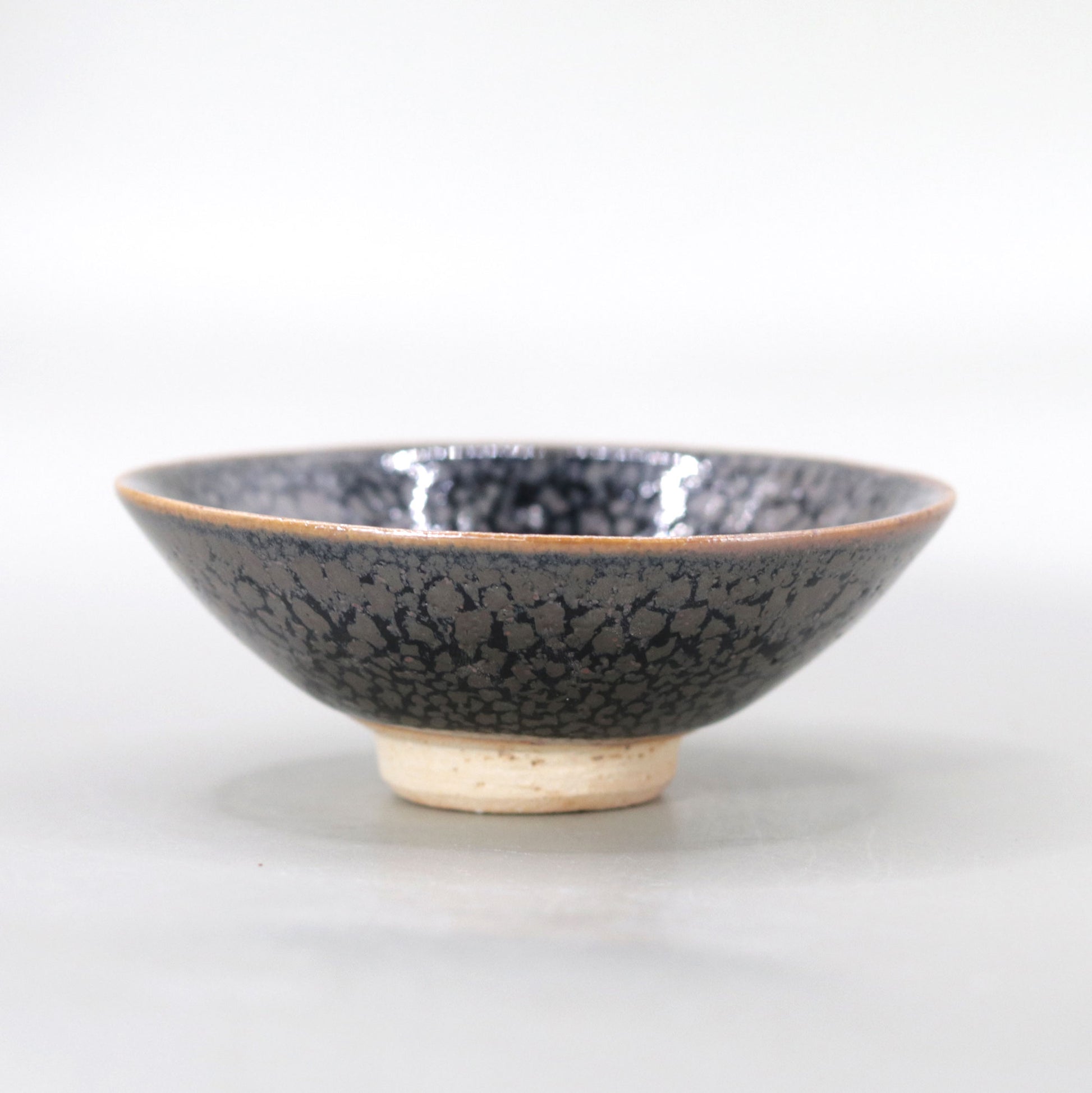 " Yuteki " refers to the phenomenon in which metallic components contained in the iron glaze rise to the surface of the glaze during firing, forming a speckled pattern. When this pattern shines with rainbow colors, it is called "Yohen" and is especially prized. Silver speckles appear on the inside and outside of this cup, which is coated with a jet-black glaze, and when light hits it, they emit a unique beauty, hence the name "Yuteki." The pattern resembles drops of oil, and the dreamy glow that shines on the vessel continues to hold special meaning for Japanese tea masters and art lovers.