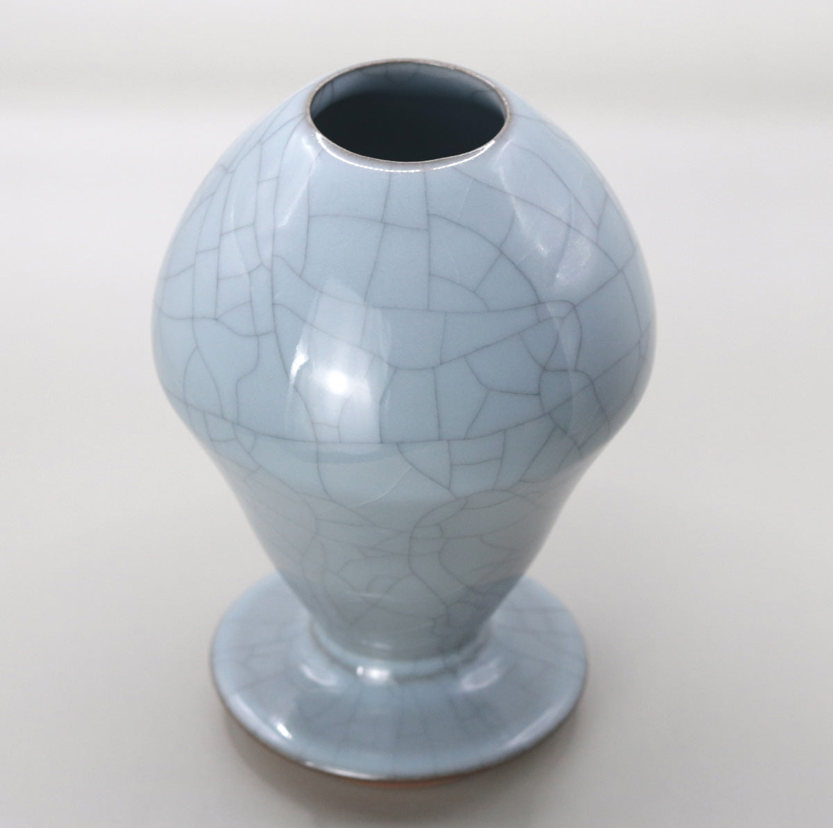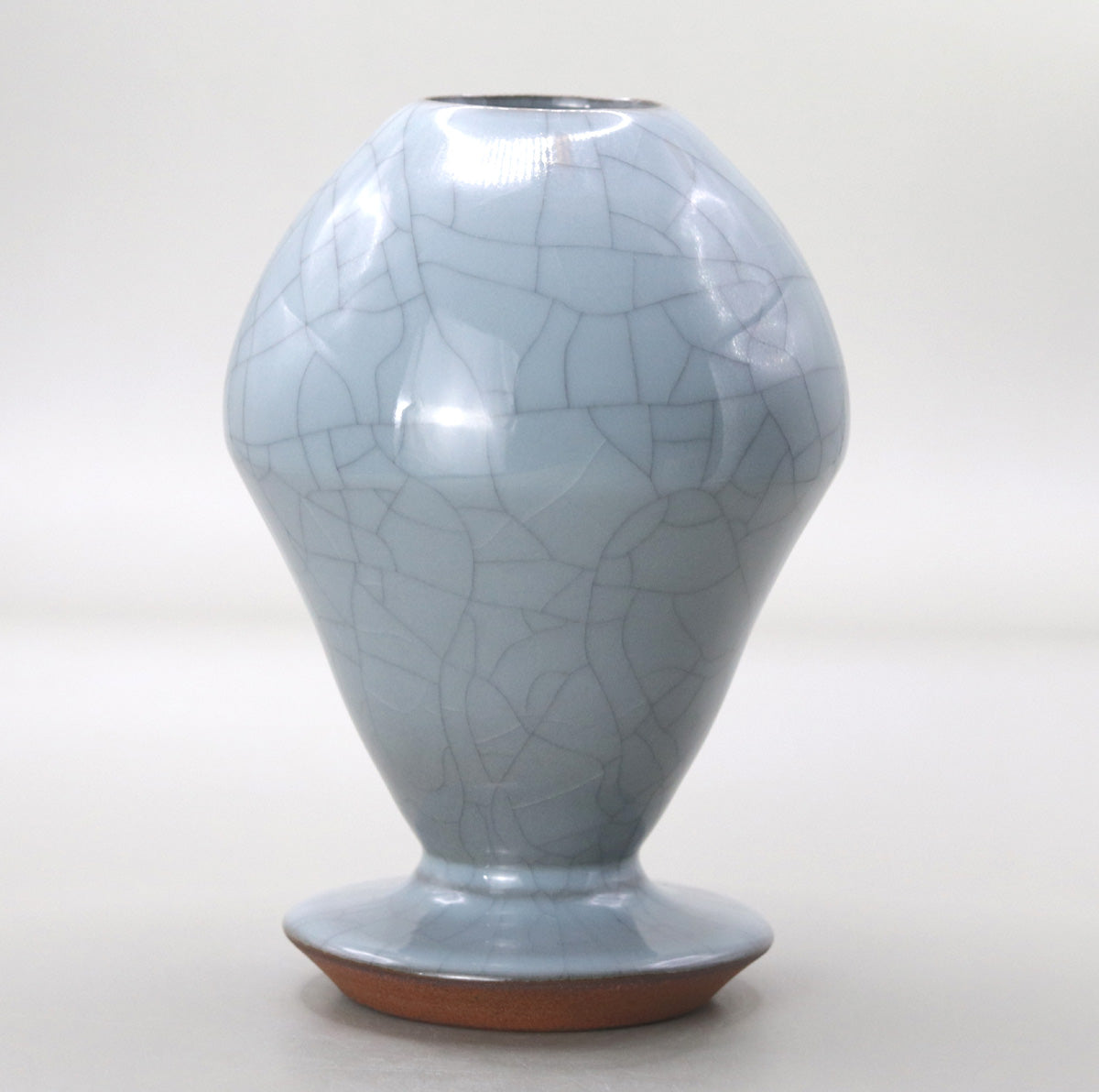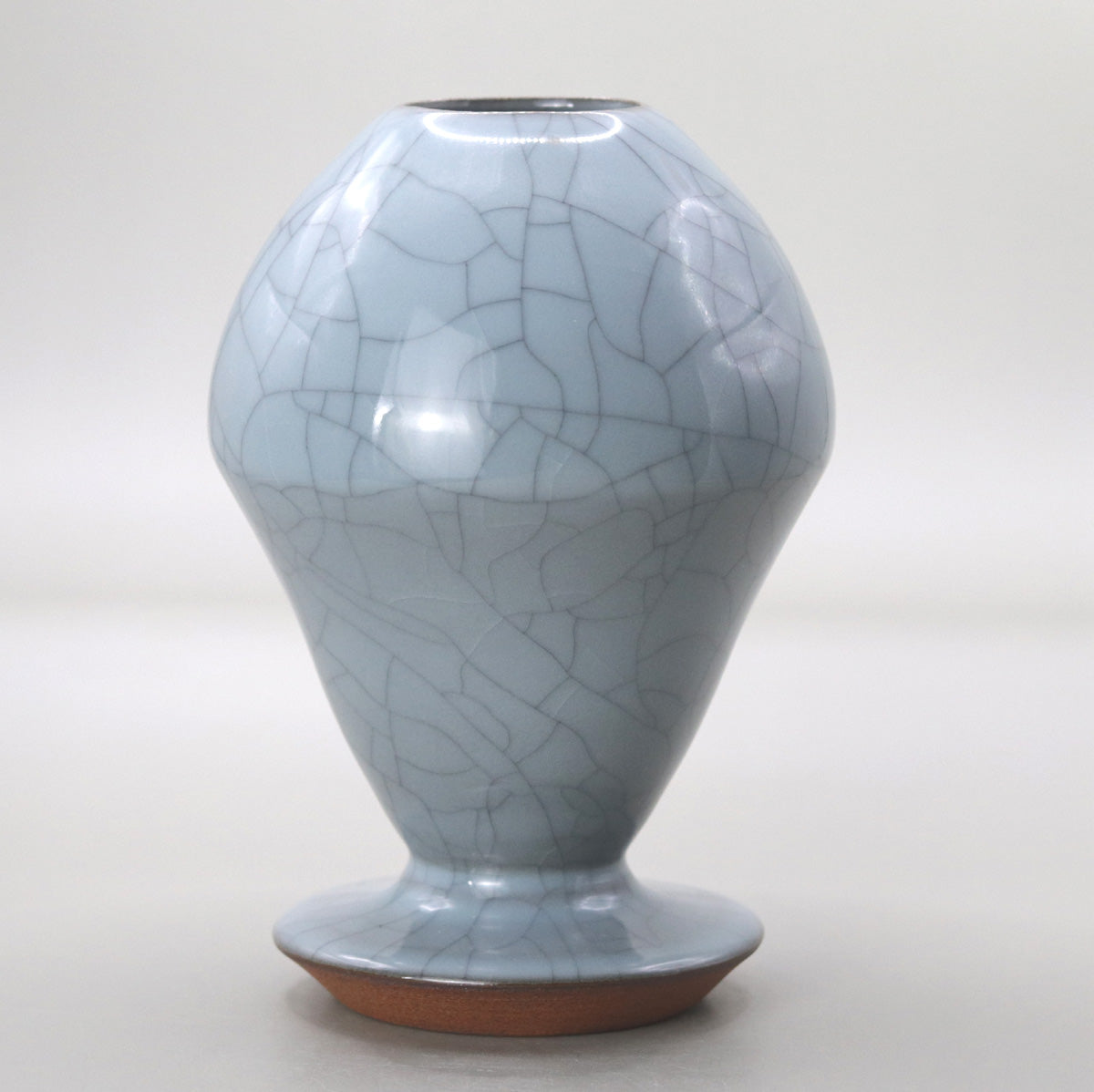 This celadon vase has a strong presence, with large "mesh cracks" running leisurely across the pale, clear, sky-blue glaze. Its shape, which starts from a bulging body and then narrows to a disk-shaped base, is reminiscent of ancient Greek kylixes and eggplant-shaped vases from the Song Dynasty's Cizhou wares, while the wider base at the bottom gives it both stability and a modern lightness. The glaze reflects light like a mirror, with ink-dyed cracks intertwining like cobblestones, adding a sense of dynamism to the tranquil blue world.