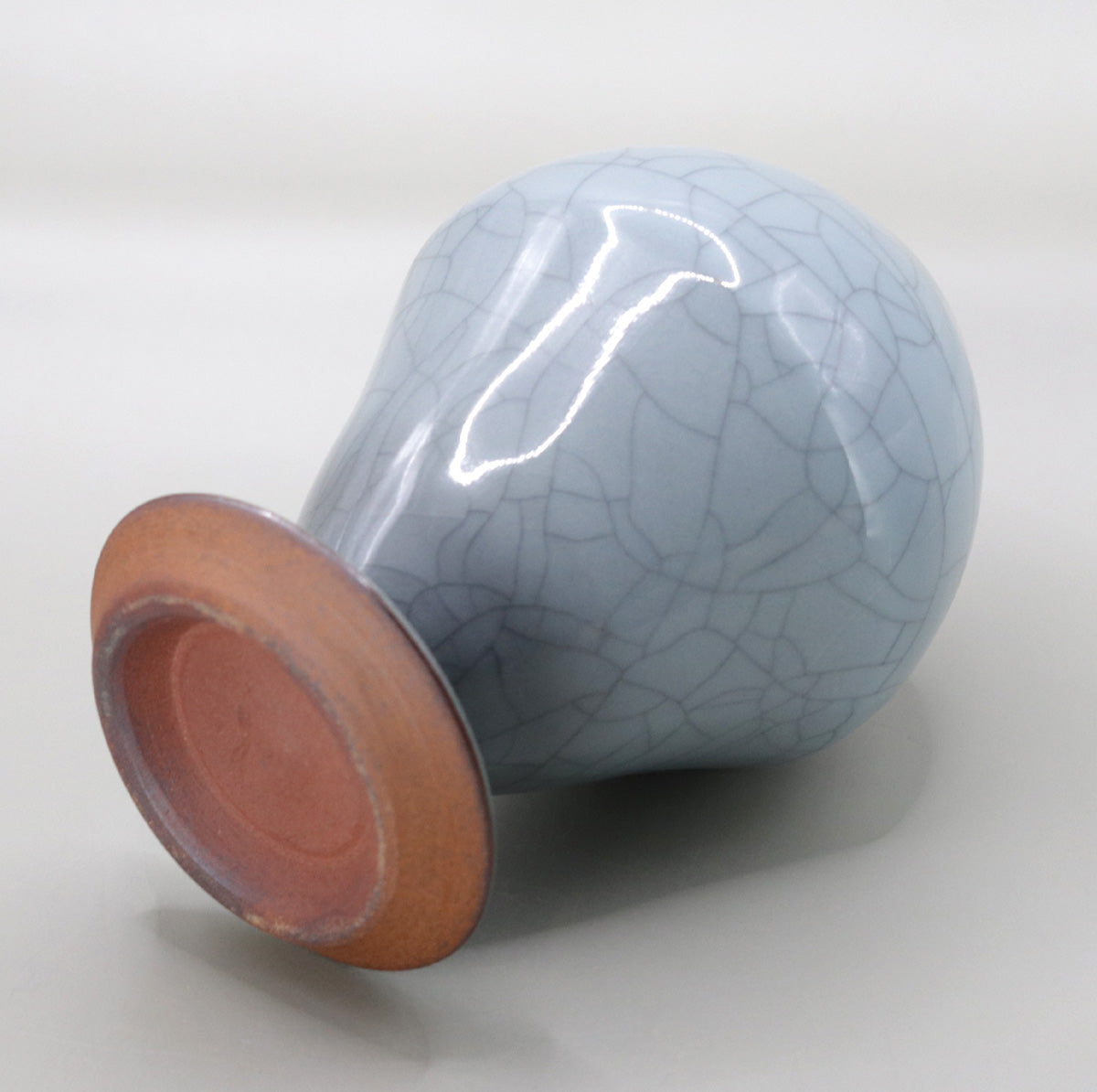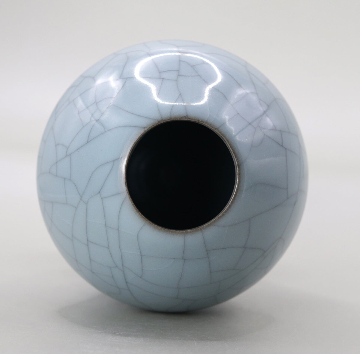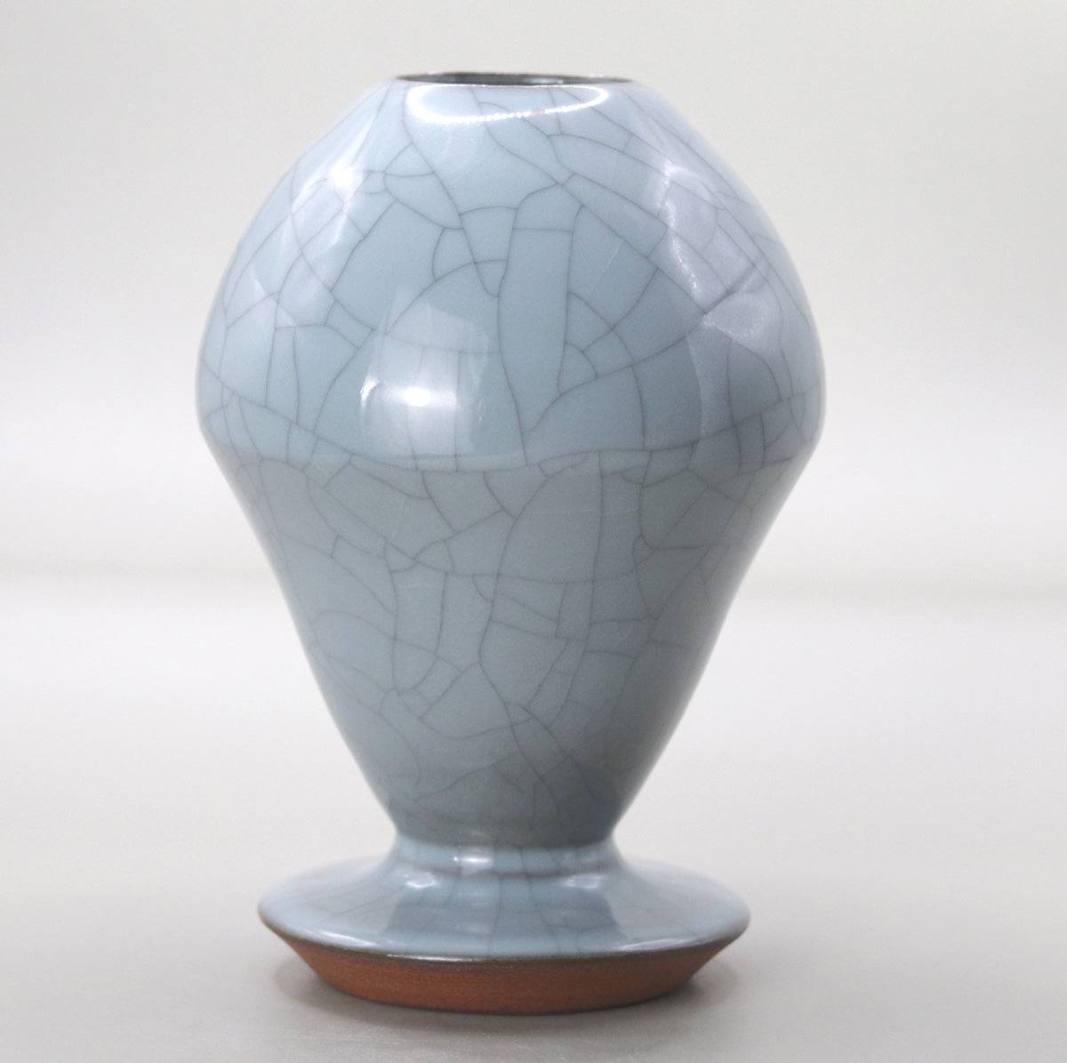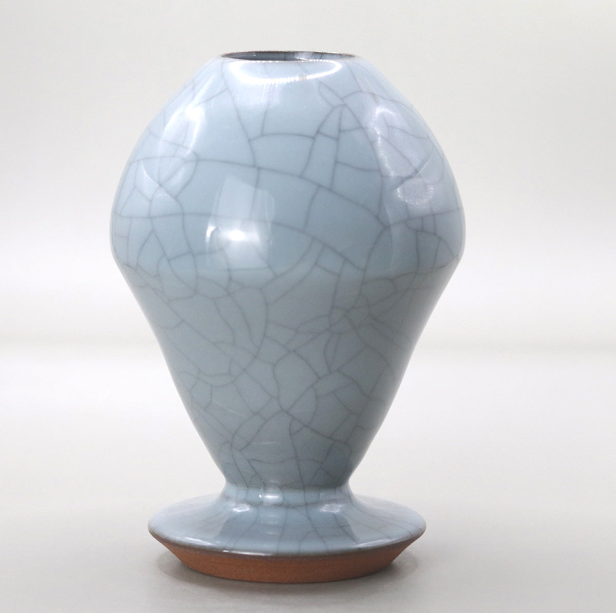This celadon vase has a strong presence, with large "mesh cracks" running leisurely across the pale, clear, sky-blue glaze. Its shape, which starts from a bulging body and then narrows to a disk-shaped base, is reminiscent of ancient Greek kylixes and eggplant-shaped vases from the Song Dynasty's Cizhou wares, while the wider base at the bottom gives it both stability and a modern lightness. The glaze reflects light like a mirror, with ink-dyed cracks intertwining like cobblestones, adding a sense of dynamism to the tranquil blue world.