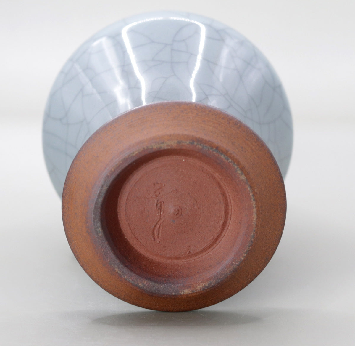 The design of the vase, with its lower part set on a circular base, is reminiscent of the bases of bronze vessels such as "son" and "shaku," and has long been associated with ceremonial significance as a vessel that connects heaven and earth. The mysterious blue of the celadon from the Song Dynasty official kilns was praised by Zen monks as the "color of the sky" and "color of water," and is a symbol of wabi in the Japanese tea ceremony. This piece respects this tradition while incorporating a modern design for the base, elevating it to an appearance that will stand out not only in tea ceremonies but also in modern living rooms and gallery spaces.