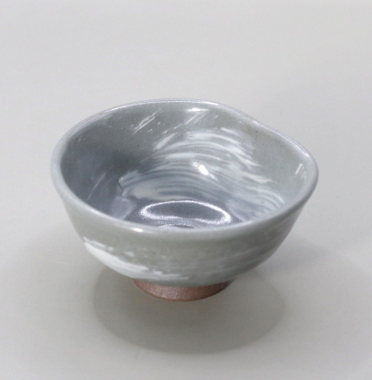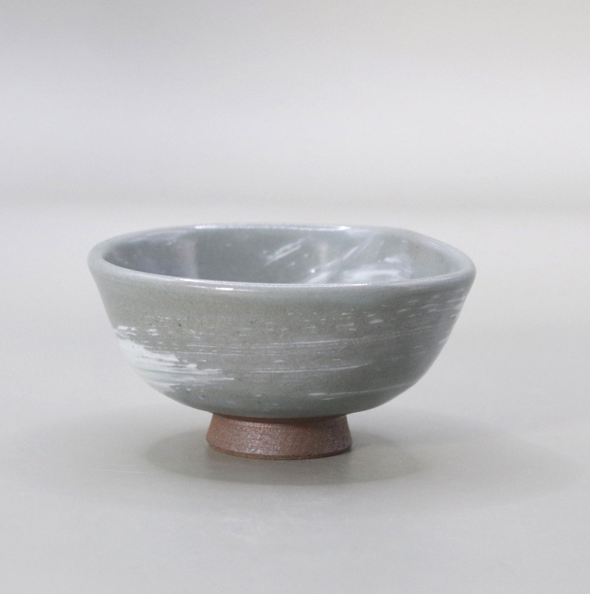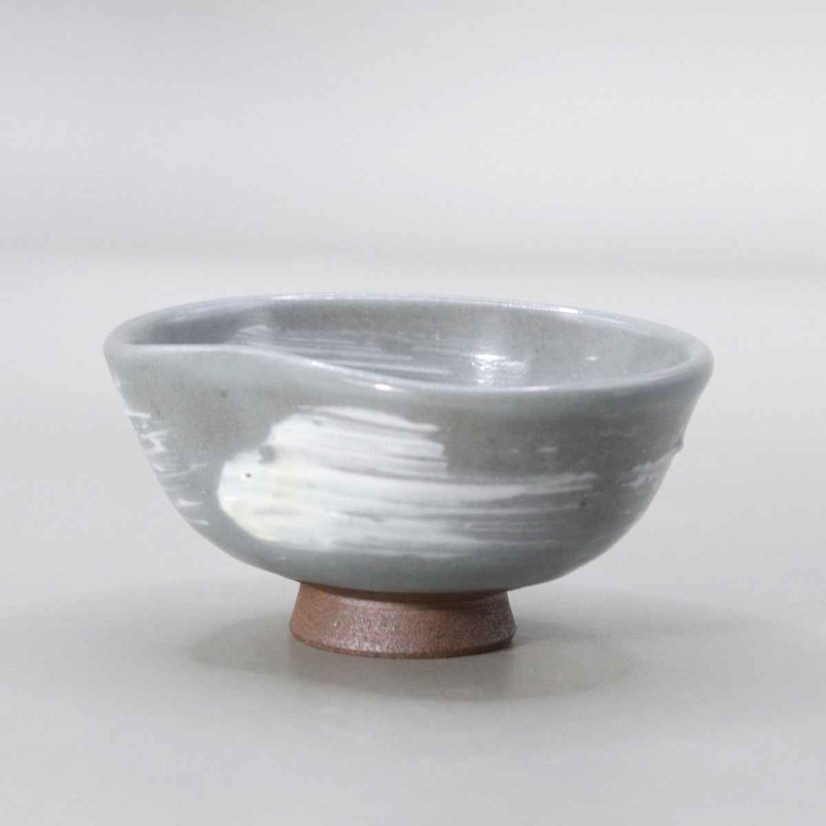 The entire body is covered in a moist, semi-gloss gray ash glaze. The calm gray tones characteristic of gray glaze take on a slight bluish tinge depending on the angle of the light, adding a feeling of coolness when cold sake is poured into it. The white brush marks on top of it were drawn in one go with a thick brush over semi-dried white mud. The dynamic brushstrokes speak of improvisation, and combined with the quiet gray glaze, they create a scene full of movement.