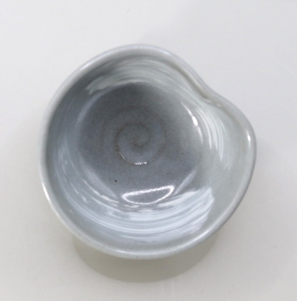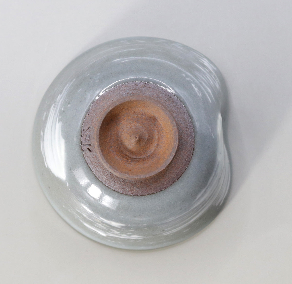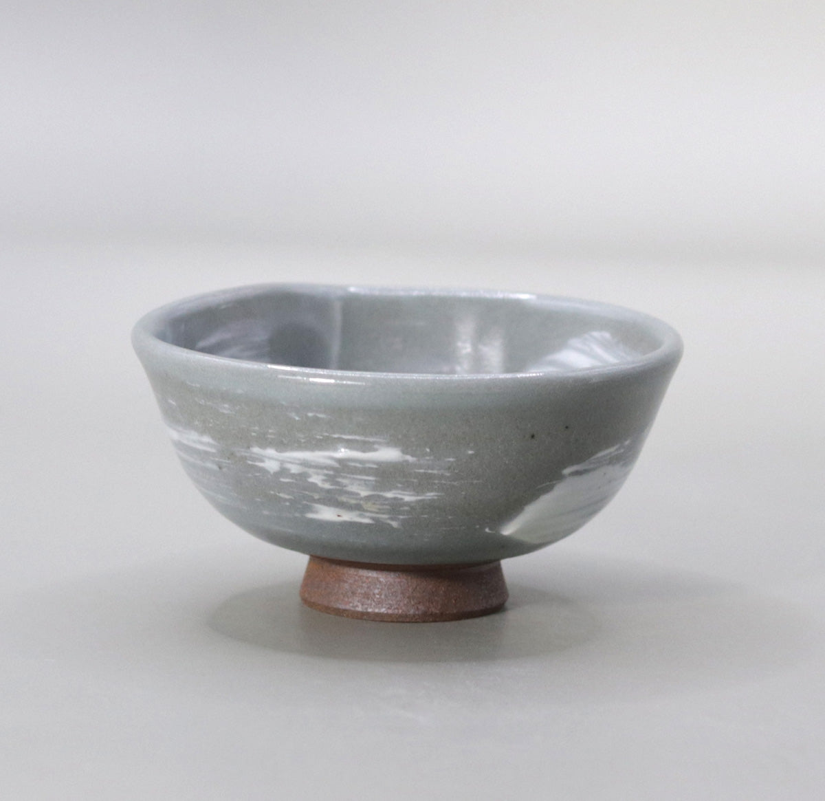 The entire body is covered in a moist, semi-gloss gray ash glaze. The calm gray tones characteristic of gray glaze take on a slight bluish tinge depending on the angle of the light, adding a feeling of coolness when cold sake is poured into it. The white brush marks on top of it were drawn in one go with a thick brush over semi-dried white mud. The dynamic brushstrokes speak of improvisation, and combined with the quiet gray glaze, they create a scene full of movement.