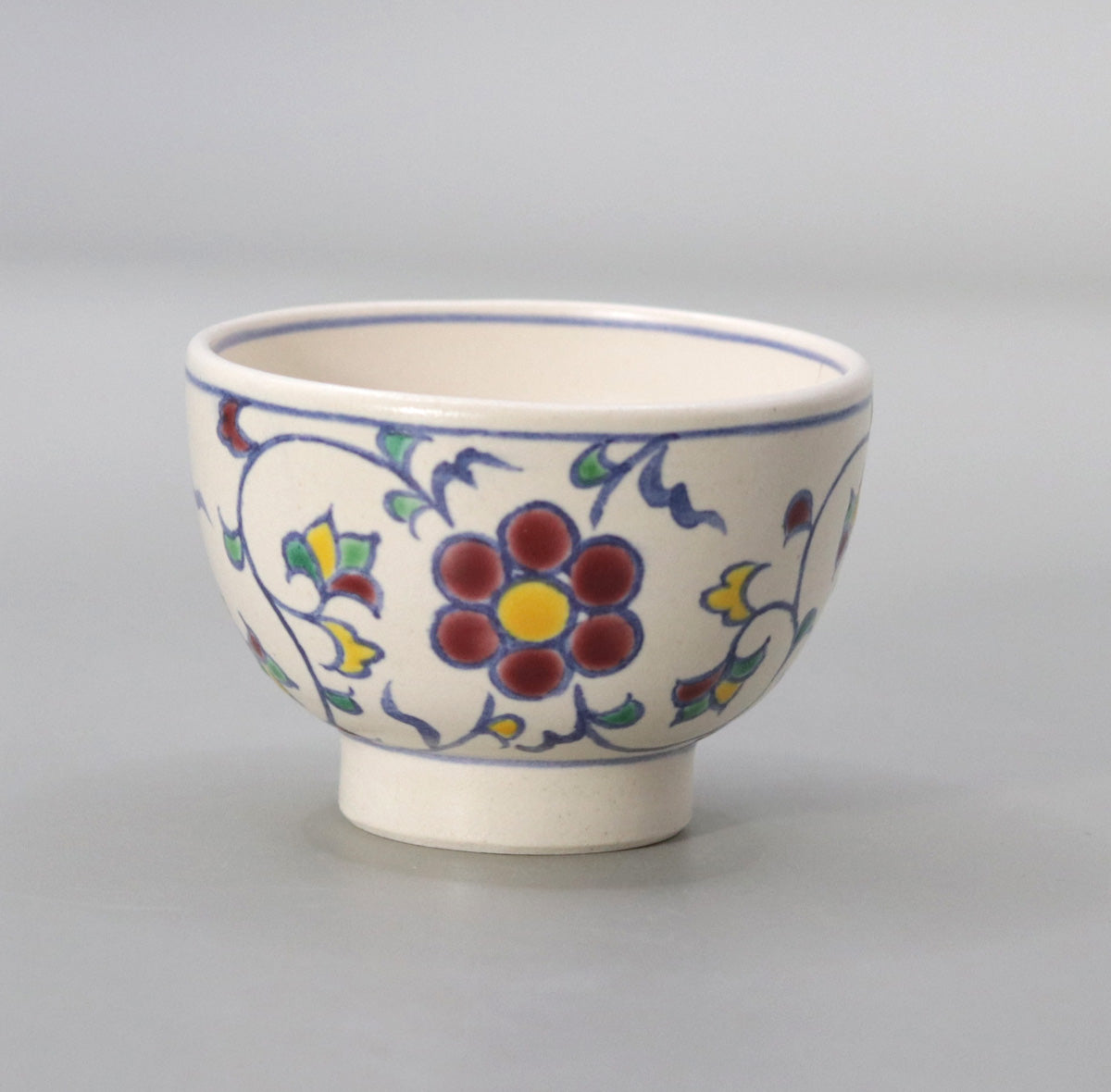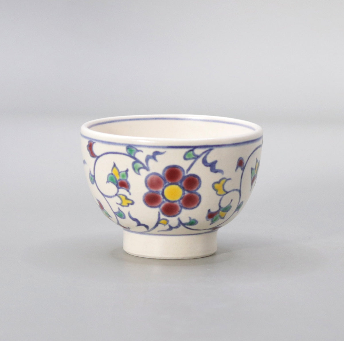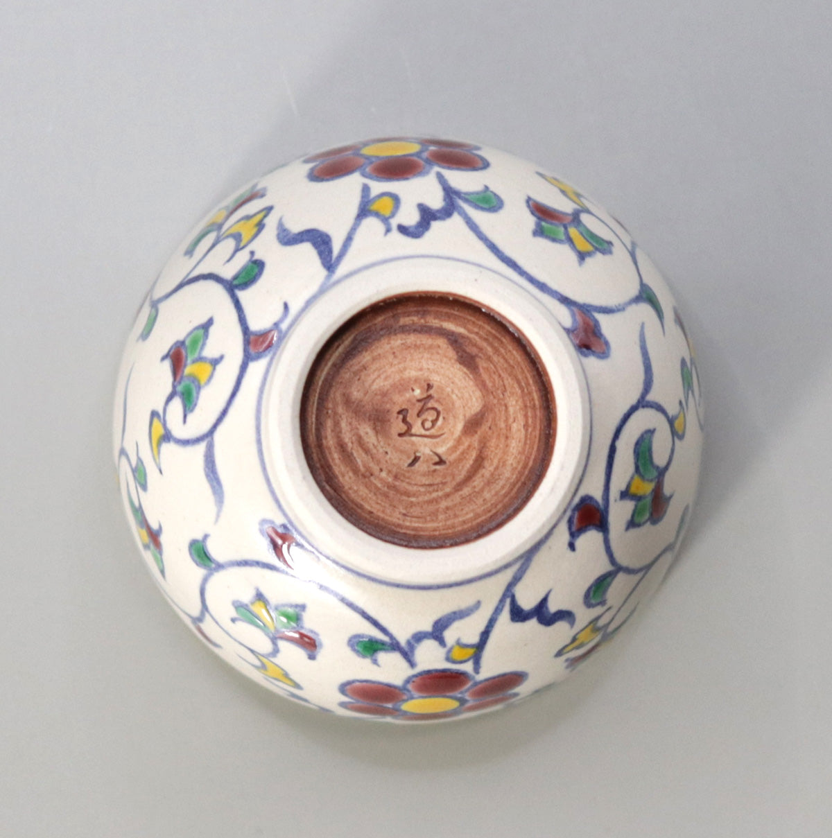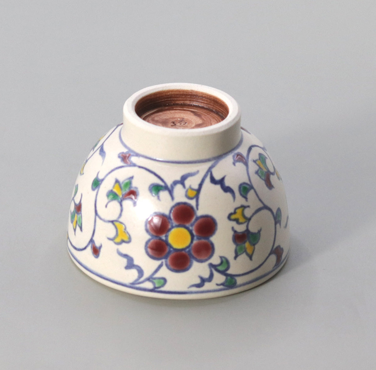After bisque firing, the outline is drawn with cobalt pigment, and then a milky white glaze is applied and the piece is fired. This is a two-stage process, followed by re-firing at a low temperature to set the red, yellow, and green mineral-based topcoats. Takahashi Michihachi inherits the family tradition of colored painting, while carefully managing the balance of color development and the thickness of the paint, achieving an exquisite balance between bleeding and clarity.