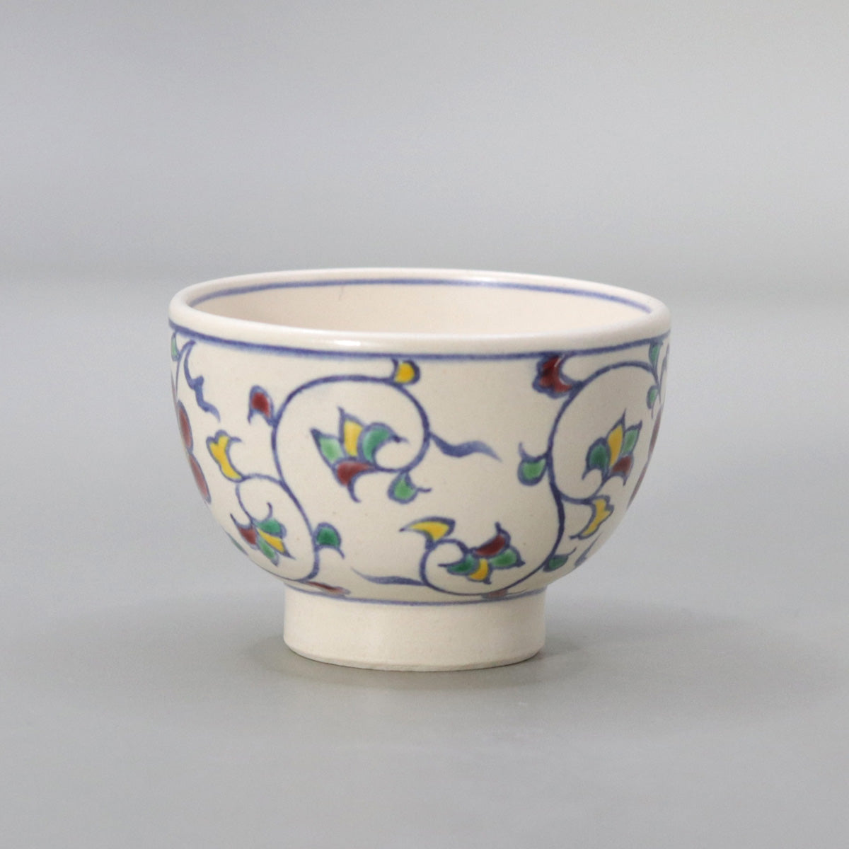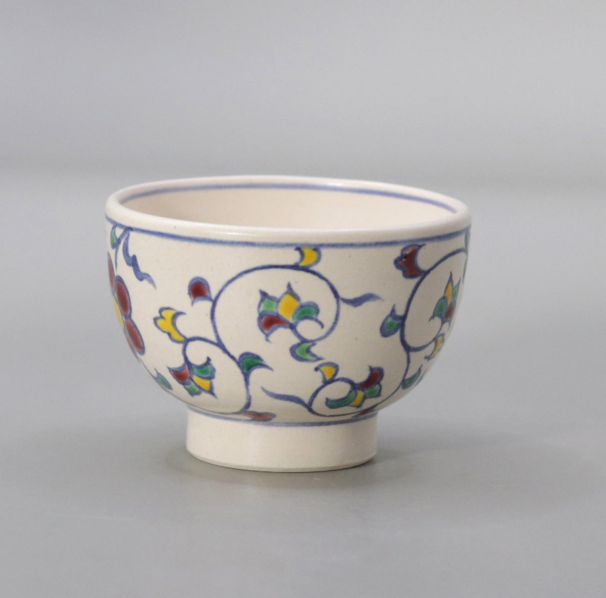 The arabesque pattern around the body is typical of "Holland copy," which originated from the designs of 17th century Dutch Delftware and Persian pottery. The eight-petal flower in the center contrasts crimson and yellow, and the four-petal flowers and buds scattered around it create rhythm. The slight wavering of the vine lines creates a light and playful feel to the hand-drawn design.
