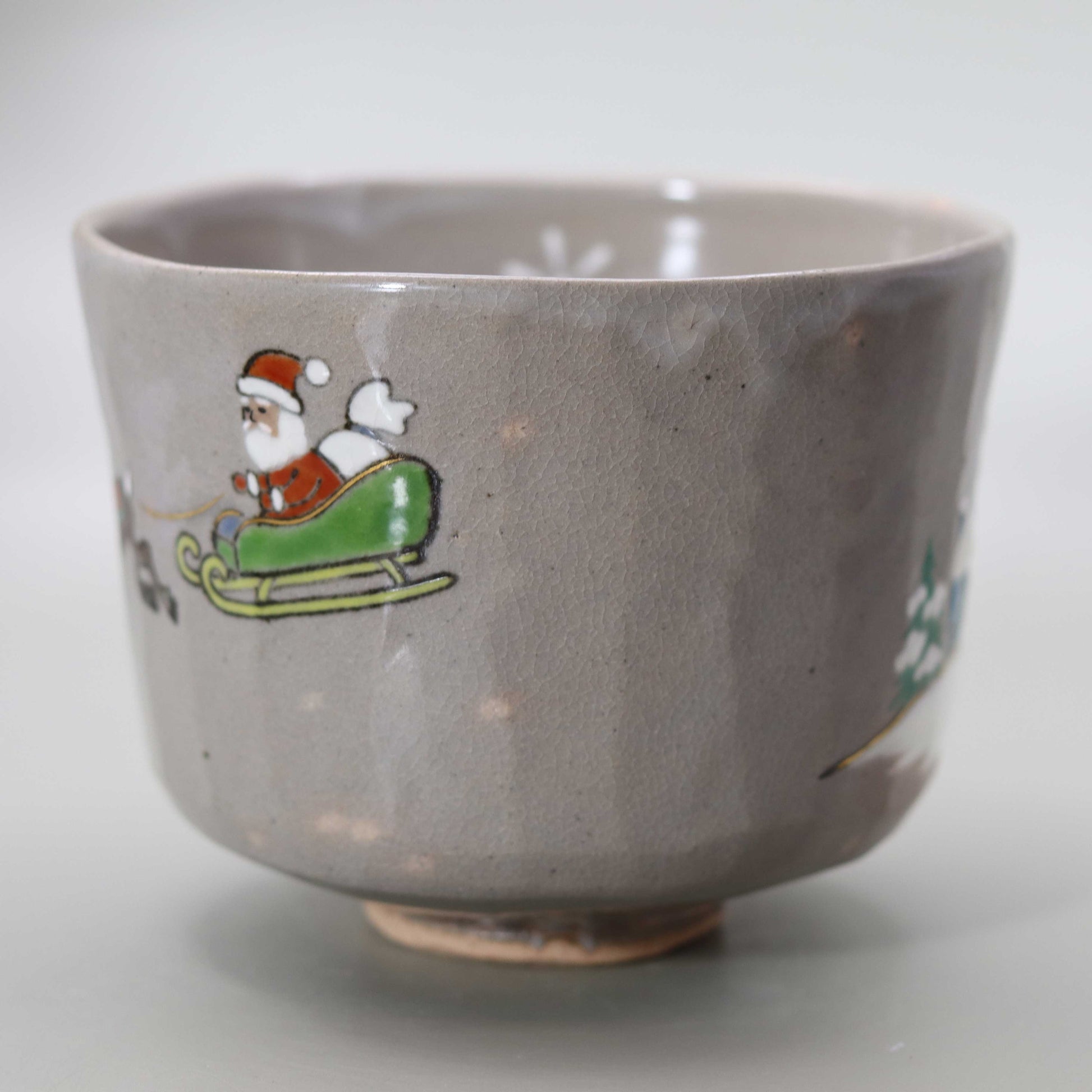 "Kenzan Copy" refers to a technique that imitates the style of Ogata Kenzan, a famous Edo period potter, and revives it in modern times. Kenzan brought revolution to pottery with his innovative designs and free ideas. Kenzan copies are reproduced using traditional techniques while respecting his originality. This tea bowl by Miyagawa Kosai inherits Kenzan's spirit while also taking on a new challenge by incorporating a modern Christmas theme. In particular, the motifs of snow and Santa Claus' sleigh painted on the tea bowl are elements not seen in traditional Japanese tea utensils, and give it a sense of originality.