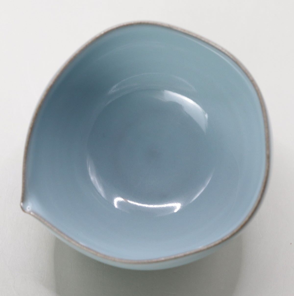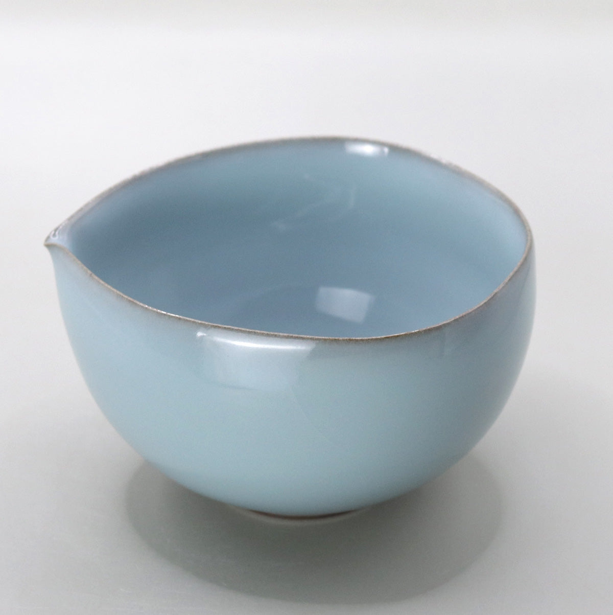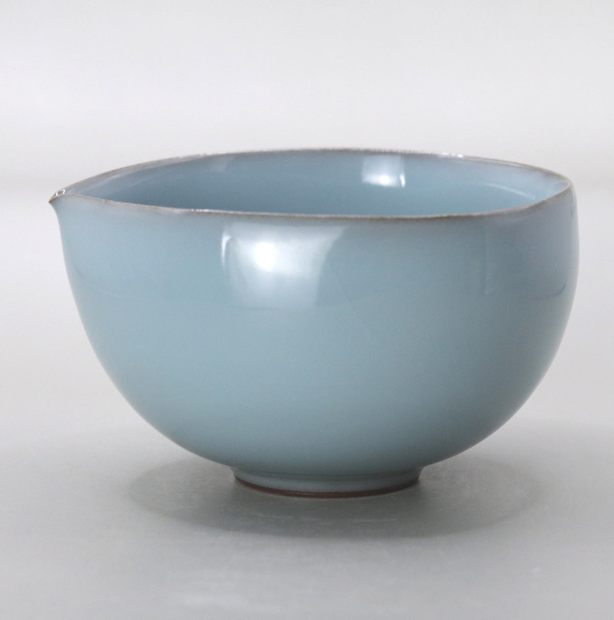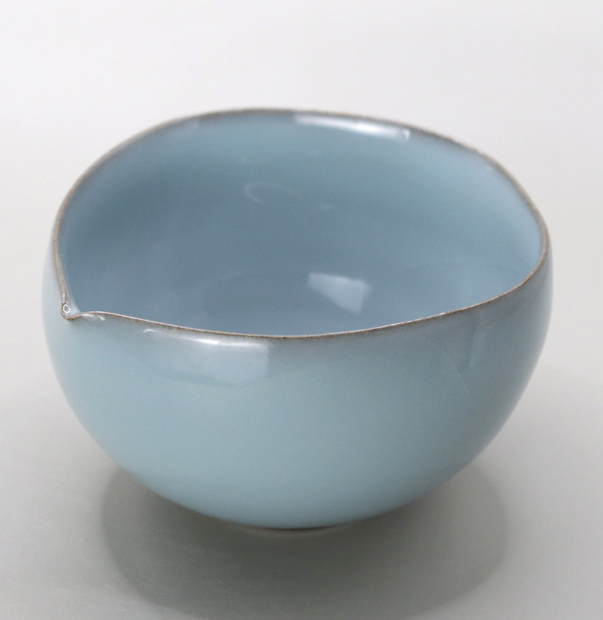 This sake vessel is covered in a clear blue glaze that seems to reflect the air after a rain. Its simple form, with a soft, bowl-shaped body reminiscent of a sake cup and a tiny spout (katakuchi), combines practical beauty with elegance. The surface of the vessel is as smooth as a mirror, with a faint milky layer showing through the depths of the glaze, creating a pale gradation. The rim is made of a thin layer of glaze that has been oxidized to a silver-gray color, creating an iron rim that tightens the blue world while also evoking an elegance of wabi.