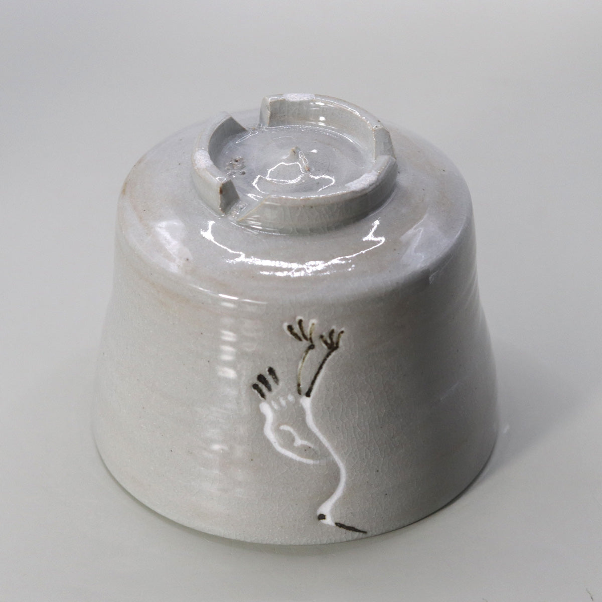 釉の溜まりには淡いグレーの濃淡が現れ、まるで早朝の霞の中に立つ鶴の姿を想起させるような、詩的な静寂を醸し出しています。