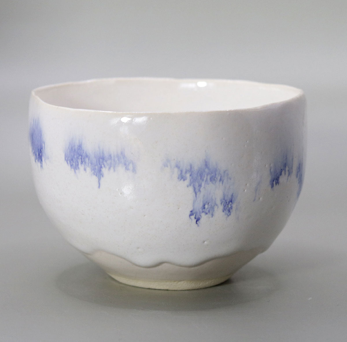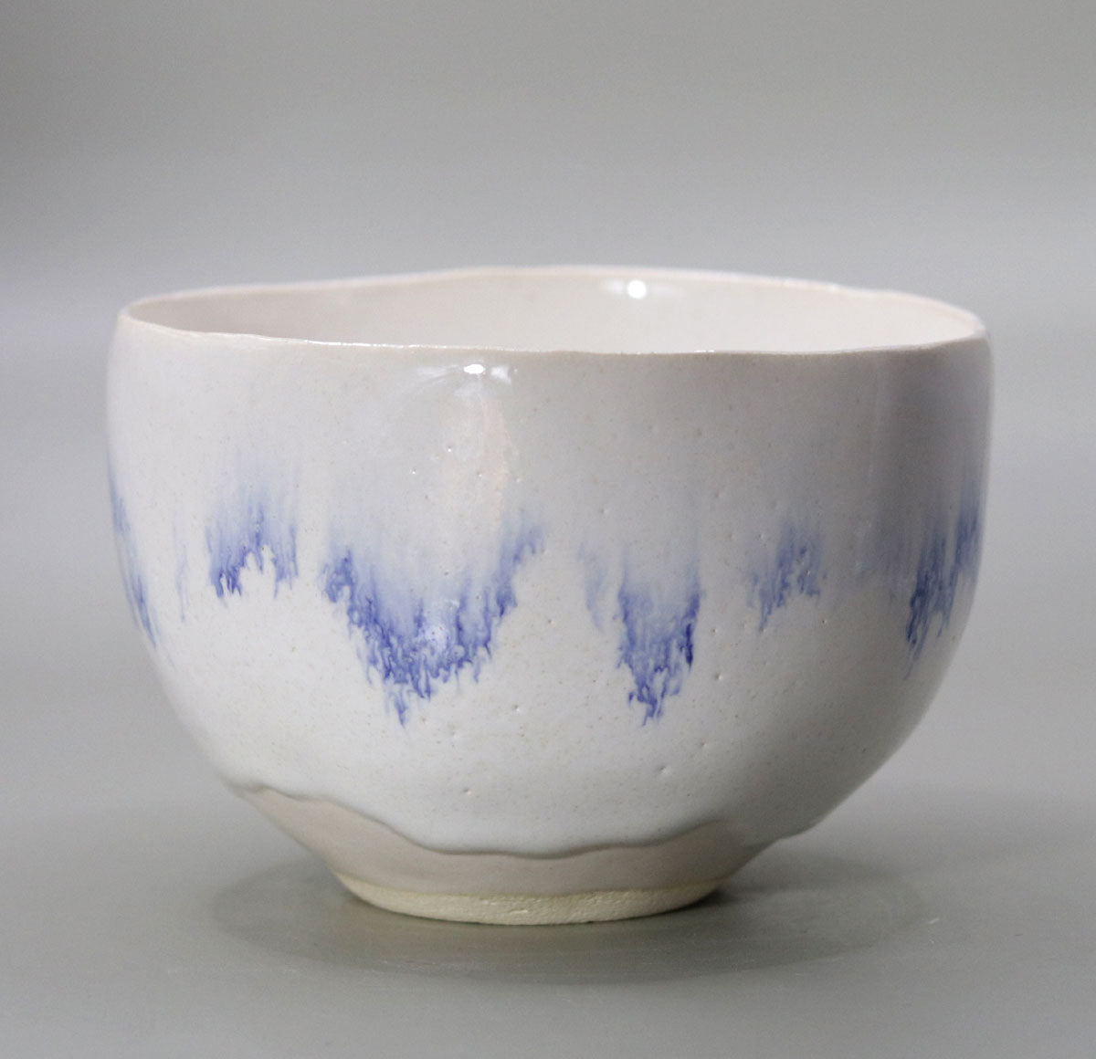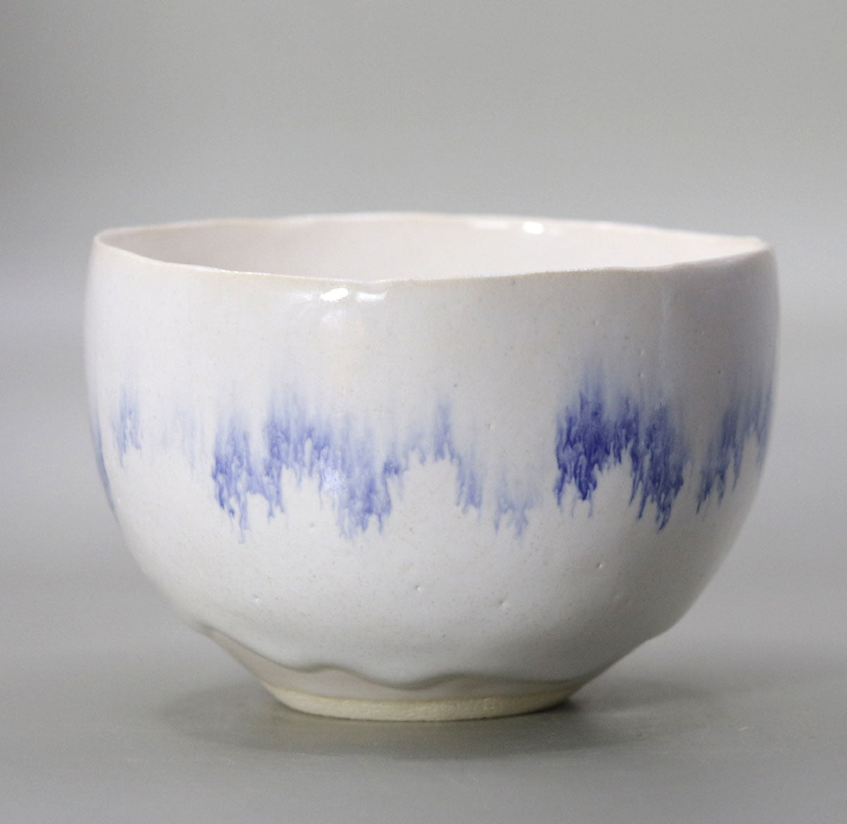 On the surface of the tea bowl, a blue pattern appears as if ink had been dropped onto the surface of water, and its delicate fluctuations give the viewer a serene impression. The irregular spread of the pattern gives a sense of randomness, yet the overall piece is harmonious. The blue pattern can be interpreted in a variety of ways depending on the viewing angle and the way the light hits it, evoking natural scenes such as raindrops or wisteria flowers.