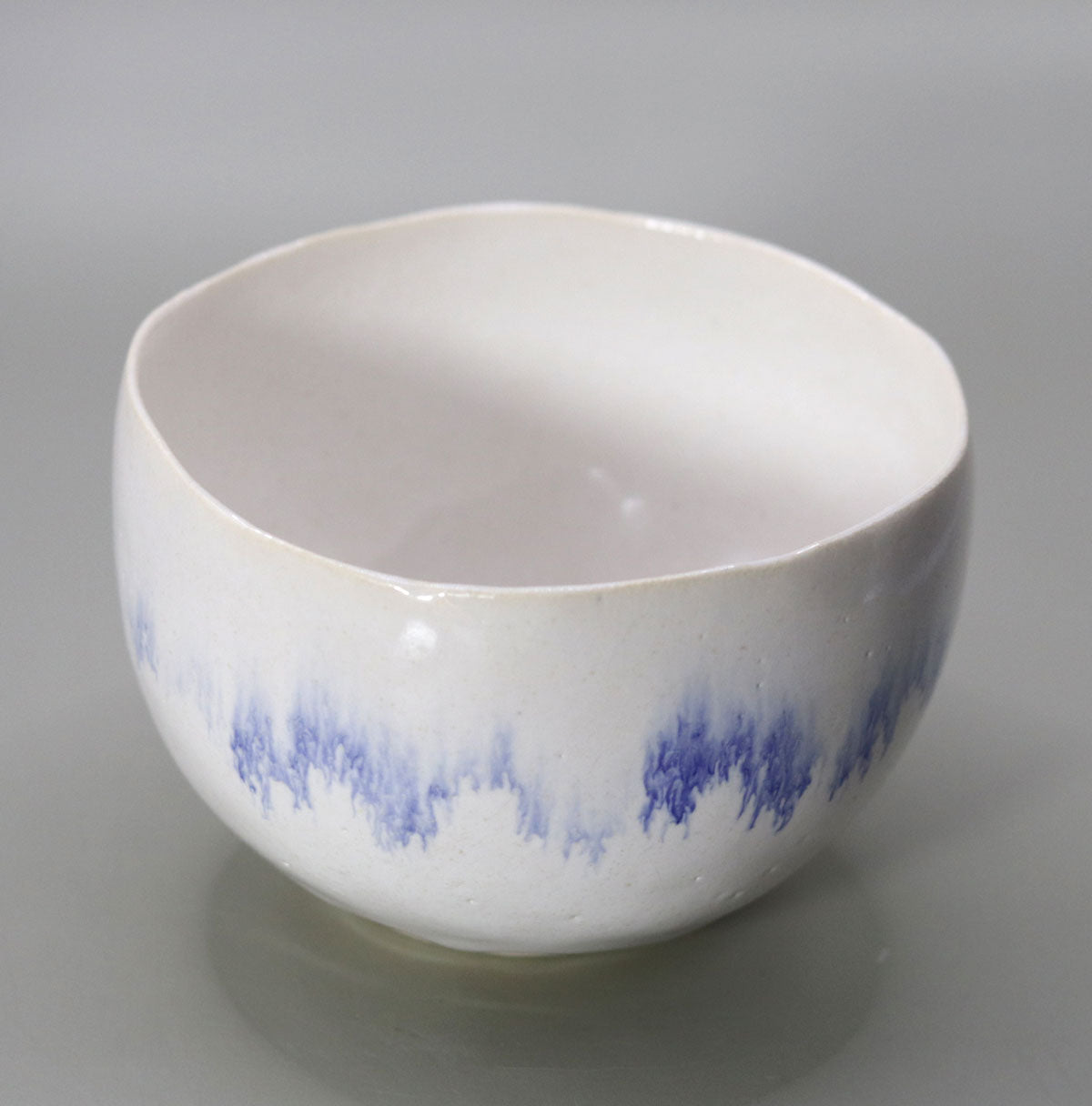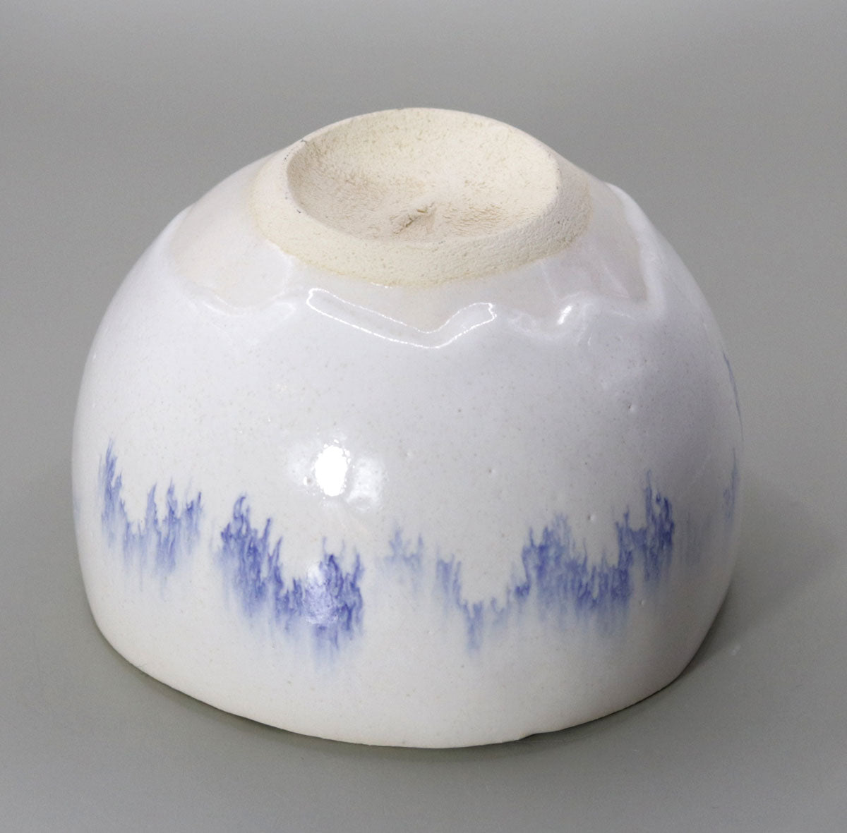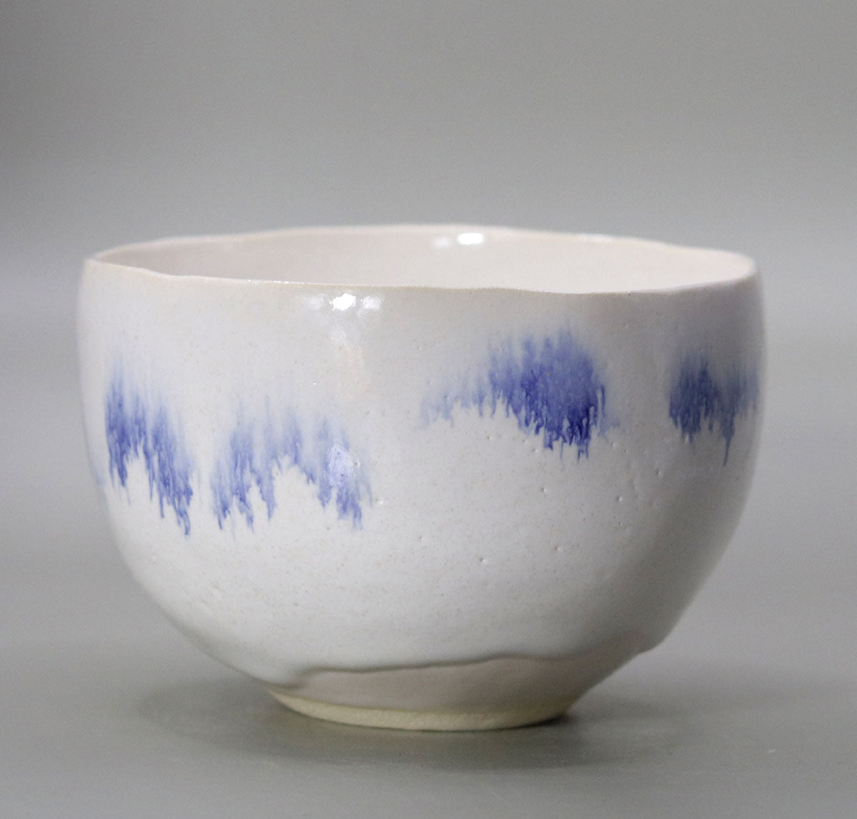 On the surface of the tea bowl, a blue pattern appears as if ink had been dropped onto the surface of water, and its delicate fluctuations give the viewer a serene impression. The irregular spread of the pattern gives a sense of randomness, yet the overall piece is harmonious. The blue pattern can be interpreted in a variety of ways depending on the viewing angle and the way the light hits it, evoking natural scenes such as raindrops or wisteria flowers.
