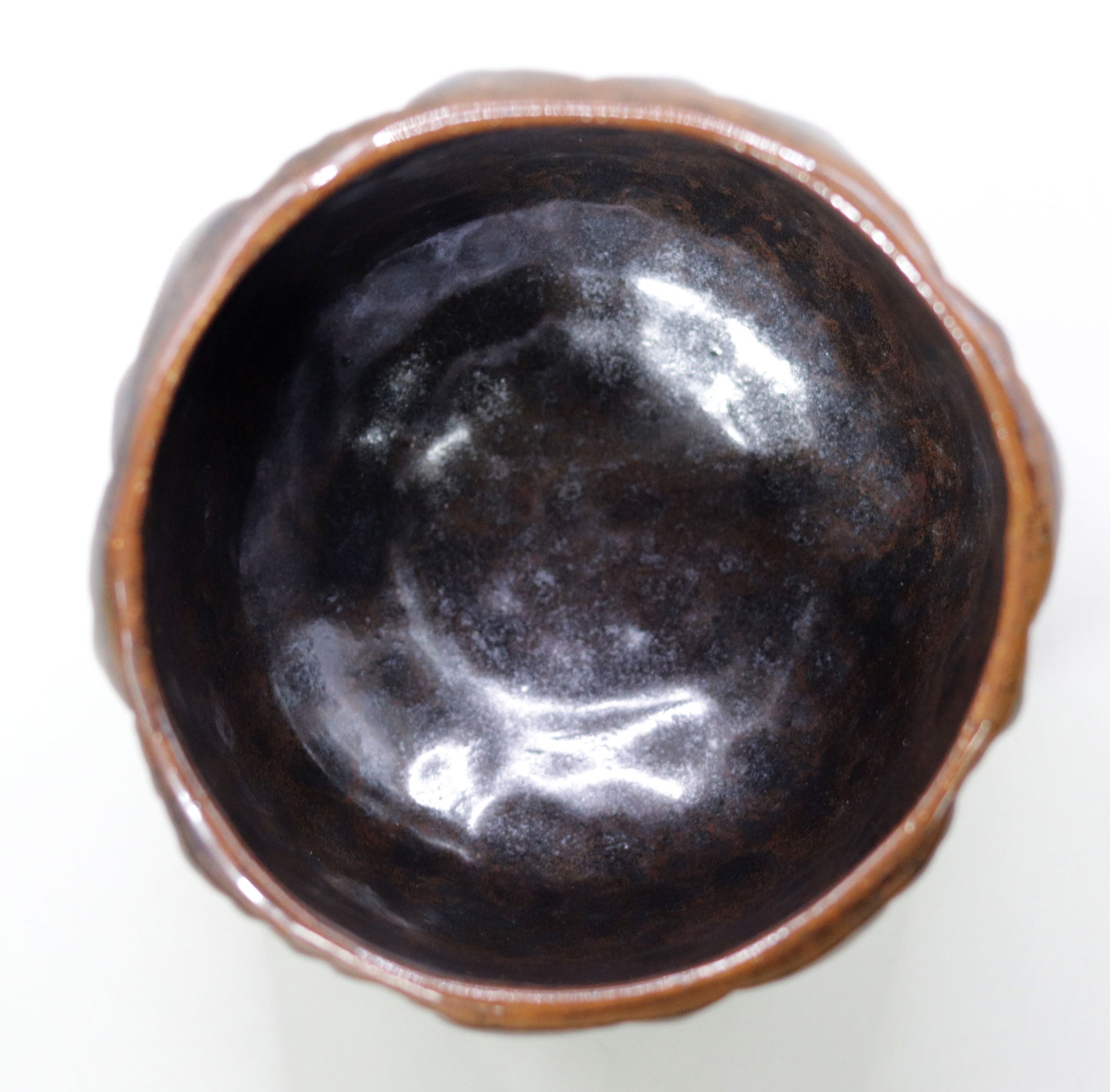 This iron-glazed, split-wood tea bowl has the power to transform your tea ceremony into something special. The depth of the iron glaze that spreads inside the bowl and the strength of the firing on the outside give the user a deep sense of satisfaction. This piece by Onishi Rakusai brings special moments into everyday life, and its unique shape and texture will surely be loved for a long time.
