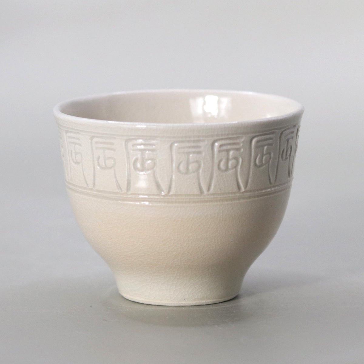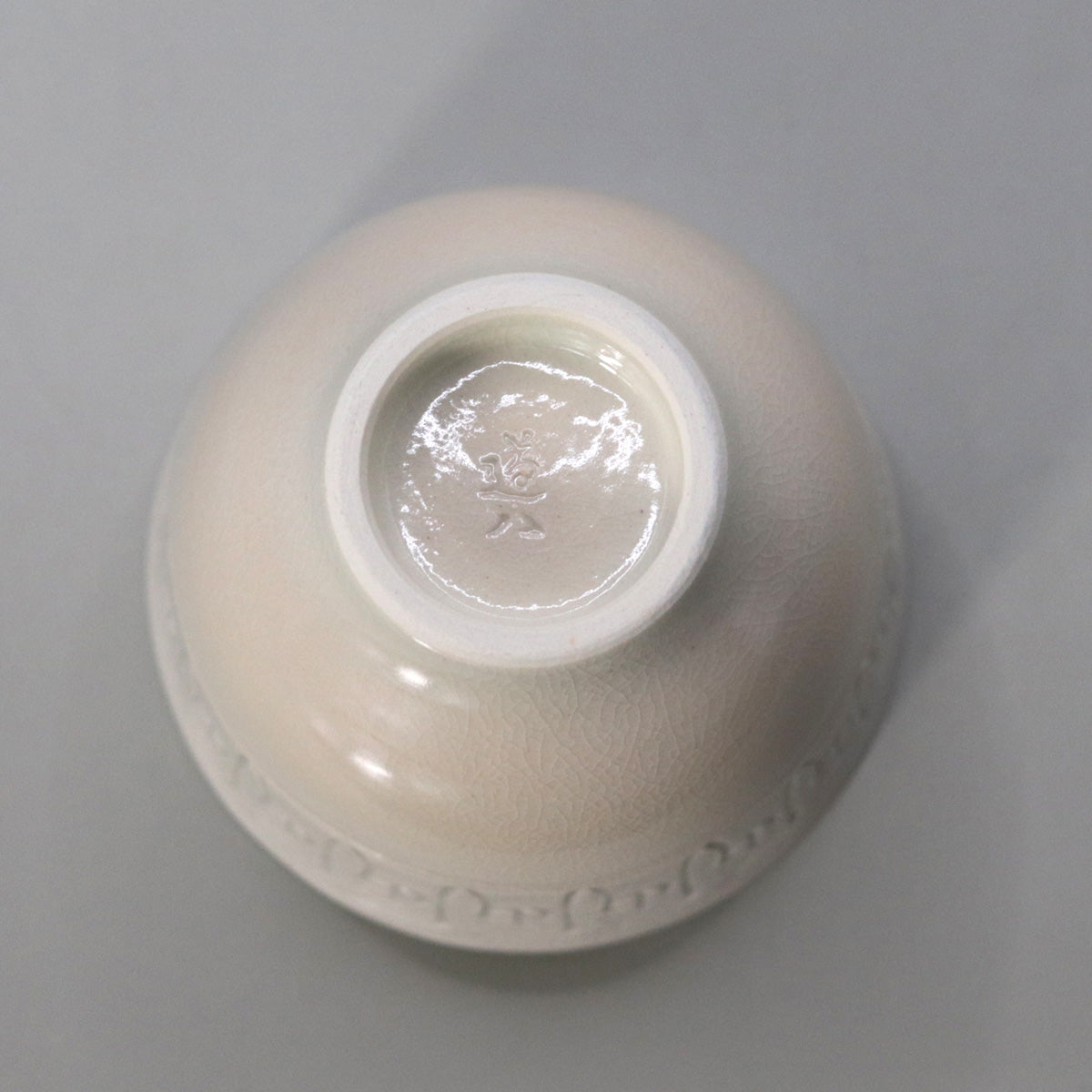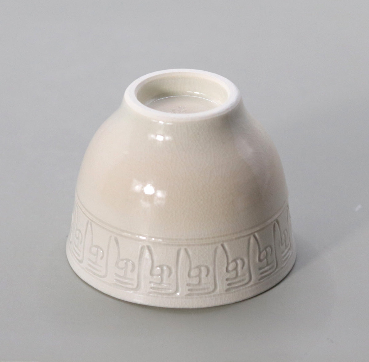 穏やかな乳白釉の中に、古代象形を思わせる刻文が静かに浮かぶ本作は、九代 高橋道八様による「十二支ぐい呑」シリーズの一作「辰(たつ)」です。