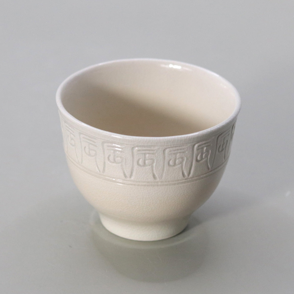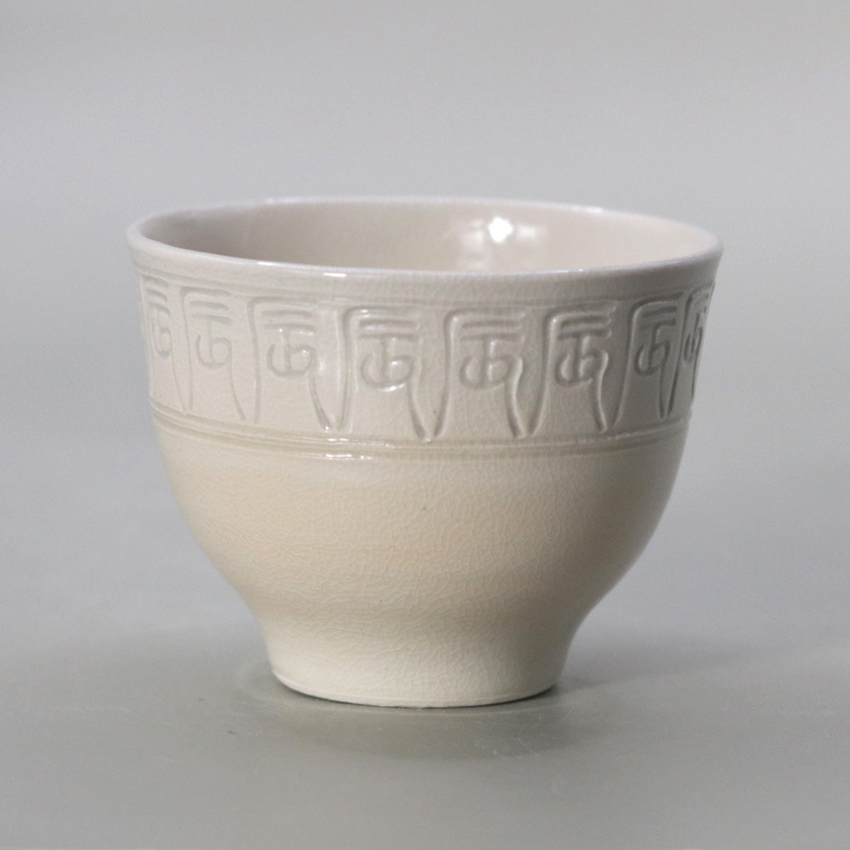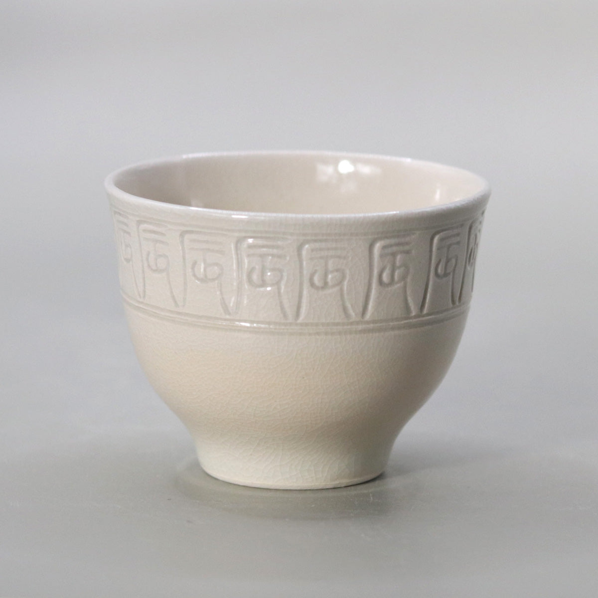 穏やかな乳白釉の中に、古代象形を思わせる刻文が静かに浮かぶ本作は、九代 高橋道八様による「十二支ぐい呑」シリーズの一作「辰(たつ)」です。