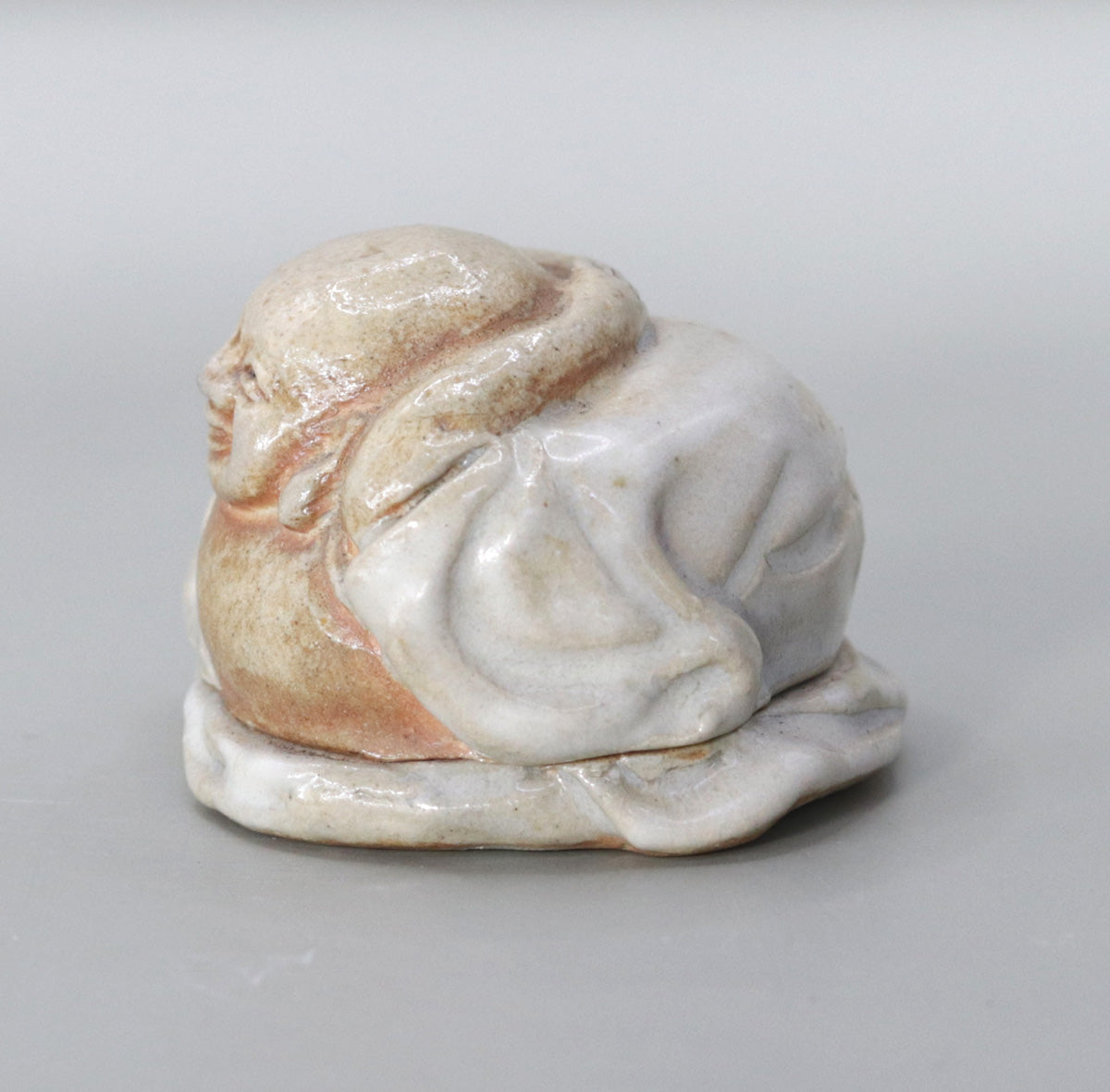 Warm and elegant red skin glaze <br data-start="394" data-end="397">The iron and ash from the clay blend together to create pale cherry blossom spots on the cheeks and abdomen, evoking a healthy, healthy complexion. A milky white glaze made mainly from feldspar is applied to the white robe, suggesting Hotei's distinctive Hotei (bag). The contrast in glaze tones emphasizes the three-dimensional effect and shadows.