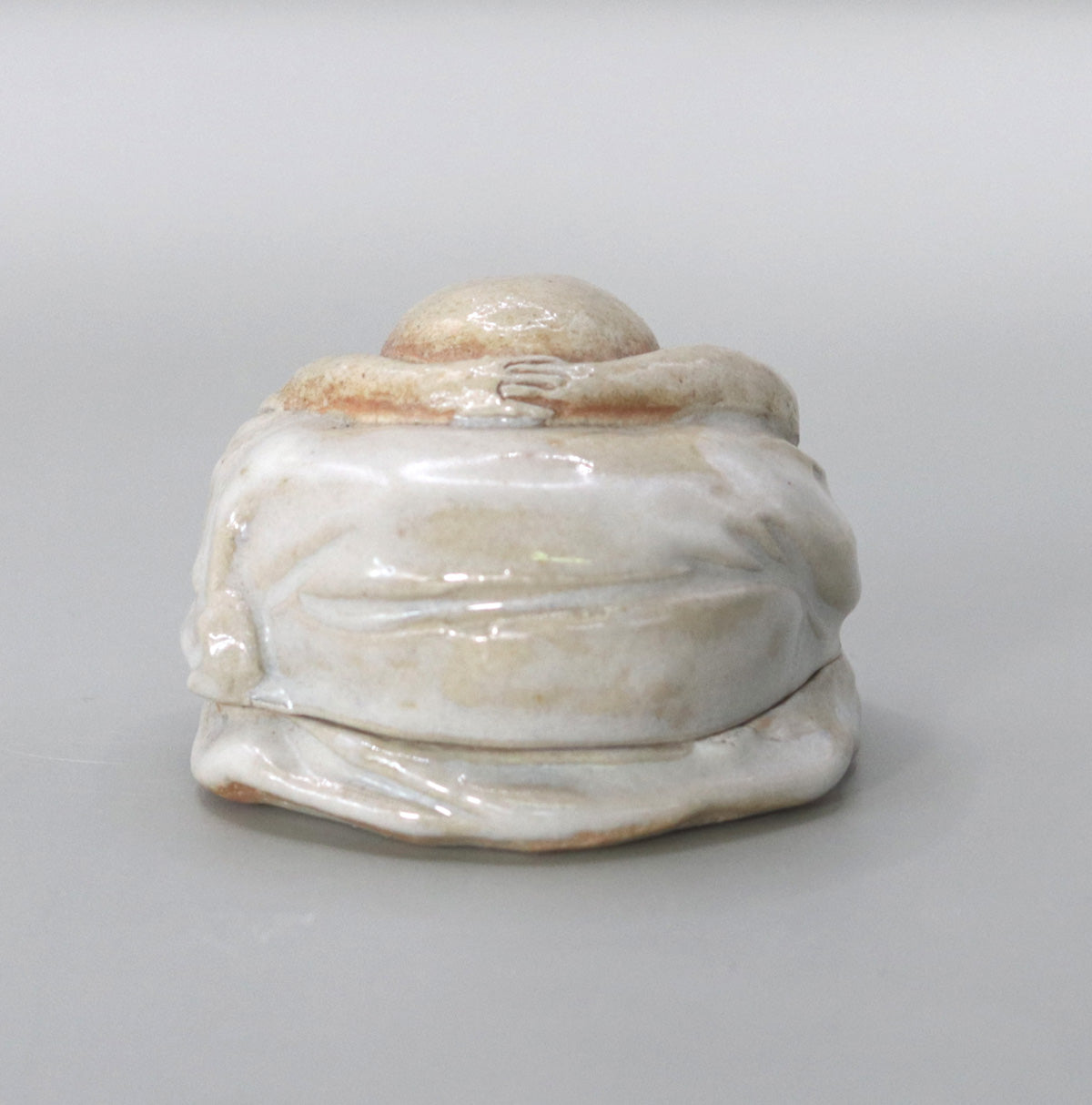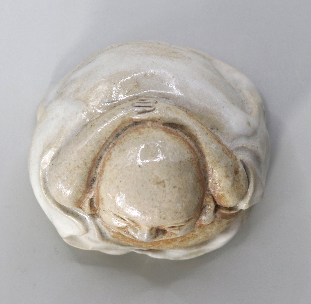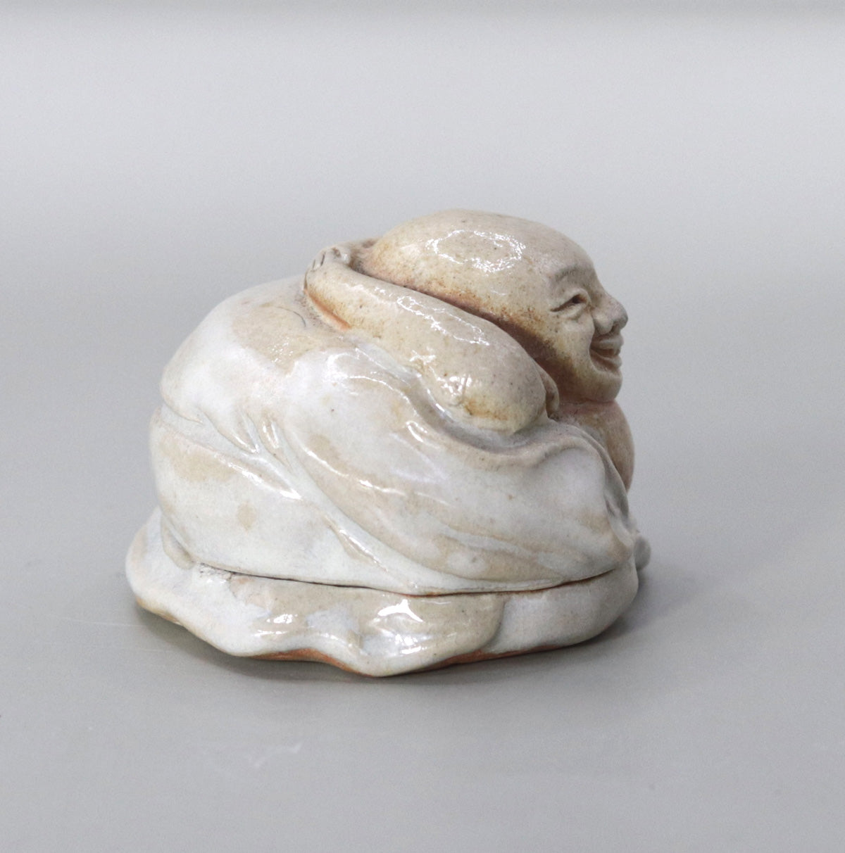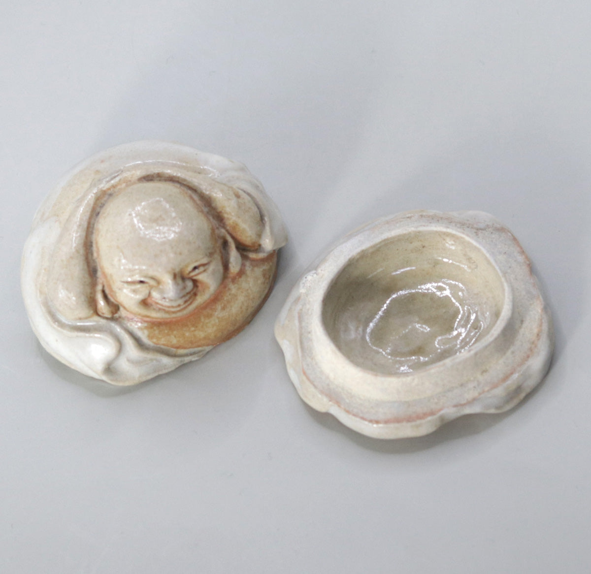 This is a Hotei-shaped incense container made by Onishi Rakusai, the eighth generation of Akahada-yaki pottery in Nara. Its round belly and cheerful smile are adorable, and it is divided into two parts, top and bottom, with the inside of the body holding incense paste and aloeswood. It is about six centimeters in diameter, and when you hold it in your palm, you can feel the warmth of Hotei.
