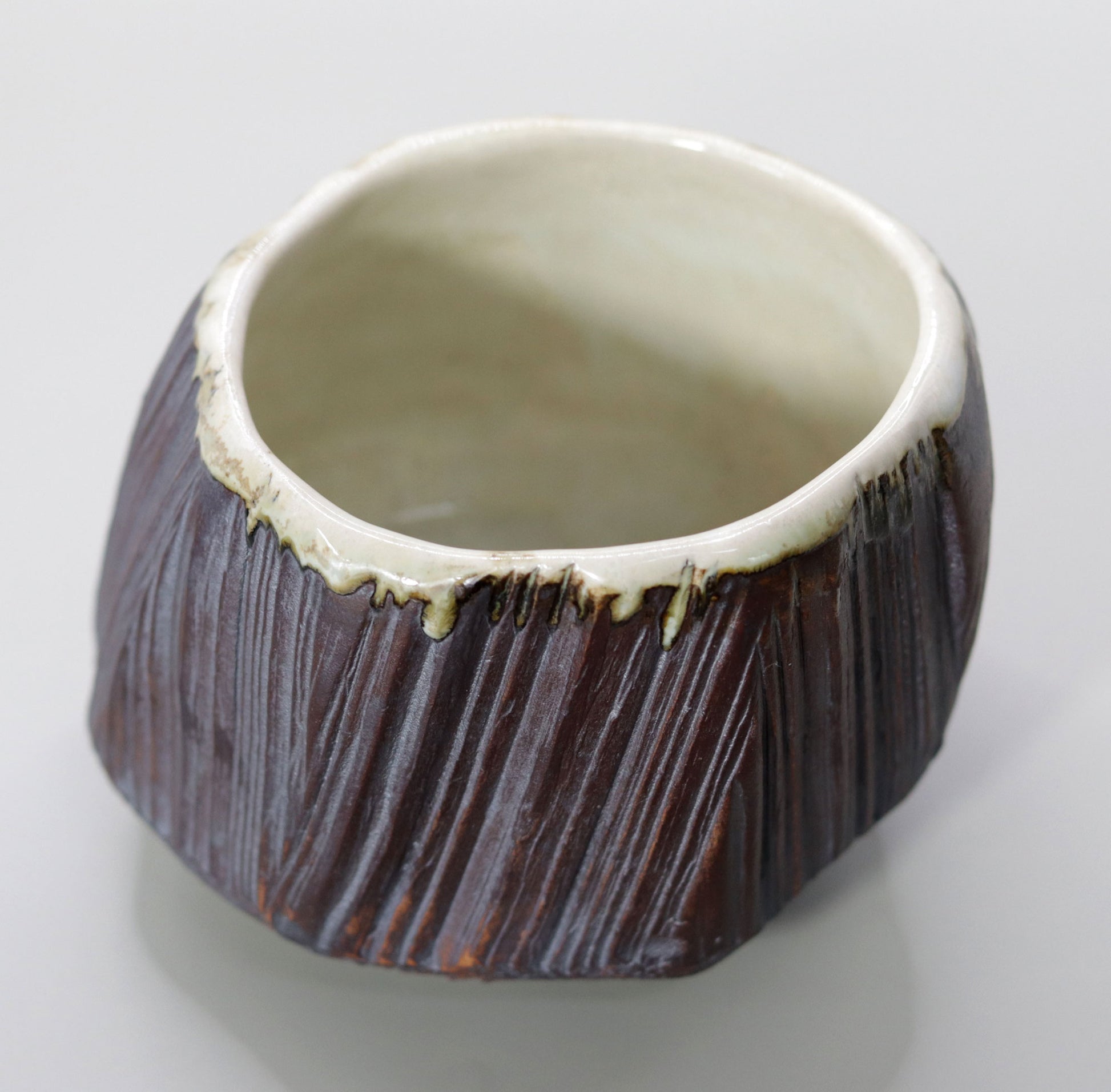 The shape of this tea bowl is very unique, and when tilted at a 45-degree angle from the front, it becomes surprisingly easy to drink from. This ingenious design symbolizes Onishi Rakusai's original approach and offers a new experience to the user. Furthermore, the technique of hammering the split red pine wood to create the shape creates dynamic lines throughout the tea bowl, giving it a sense of natural strength.