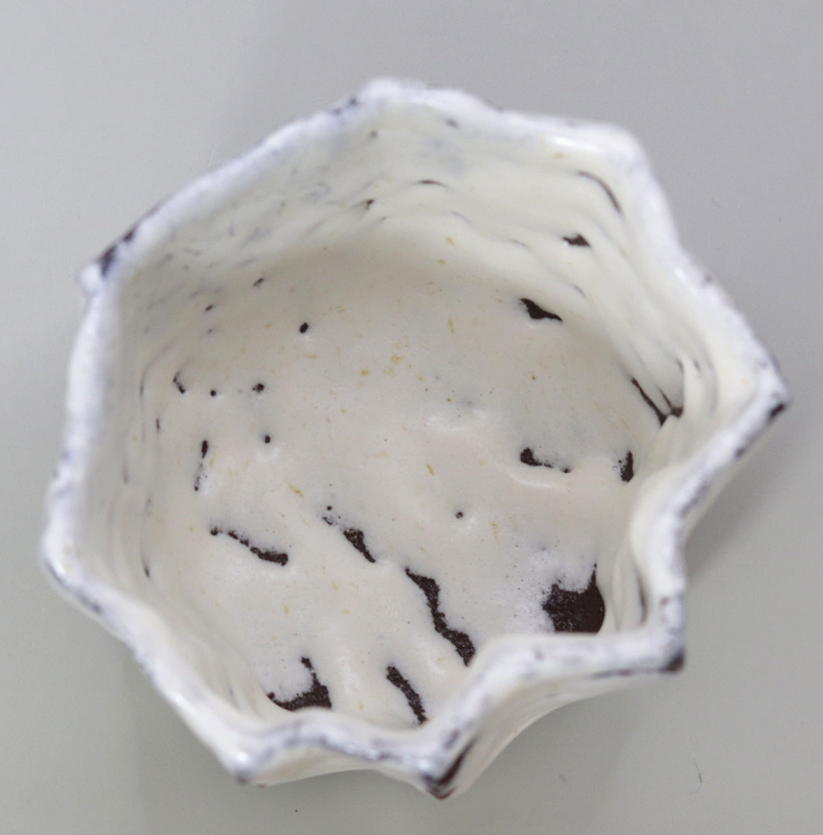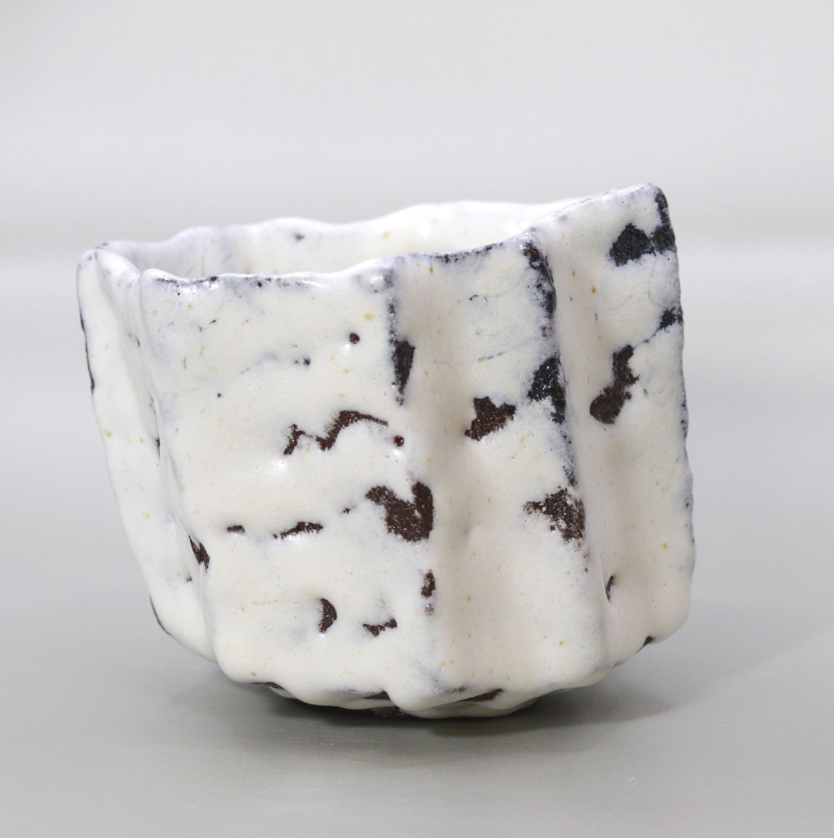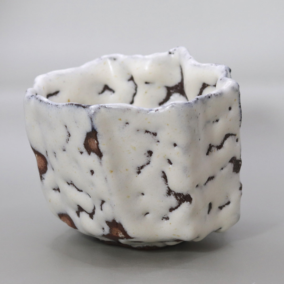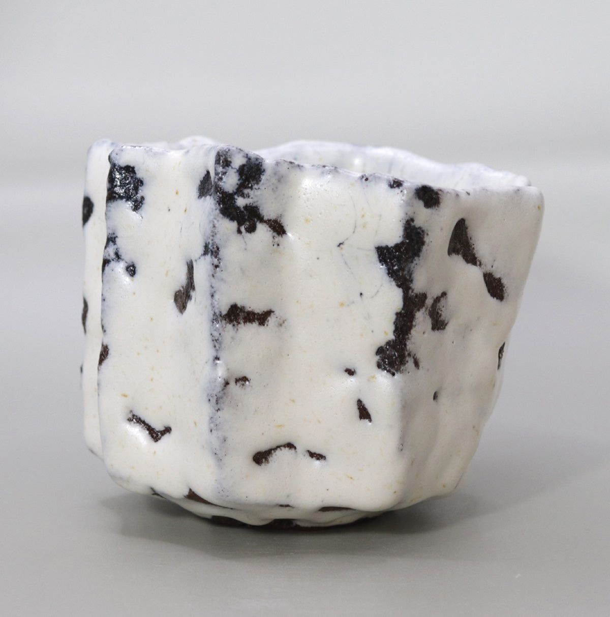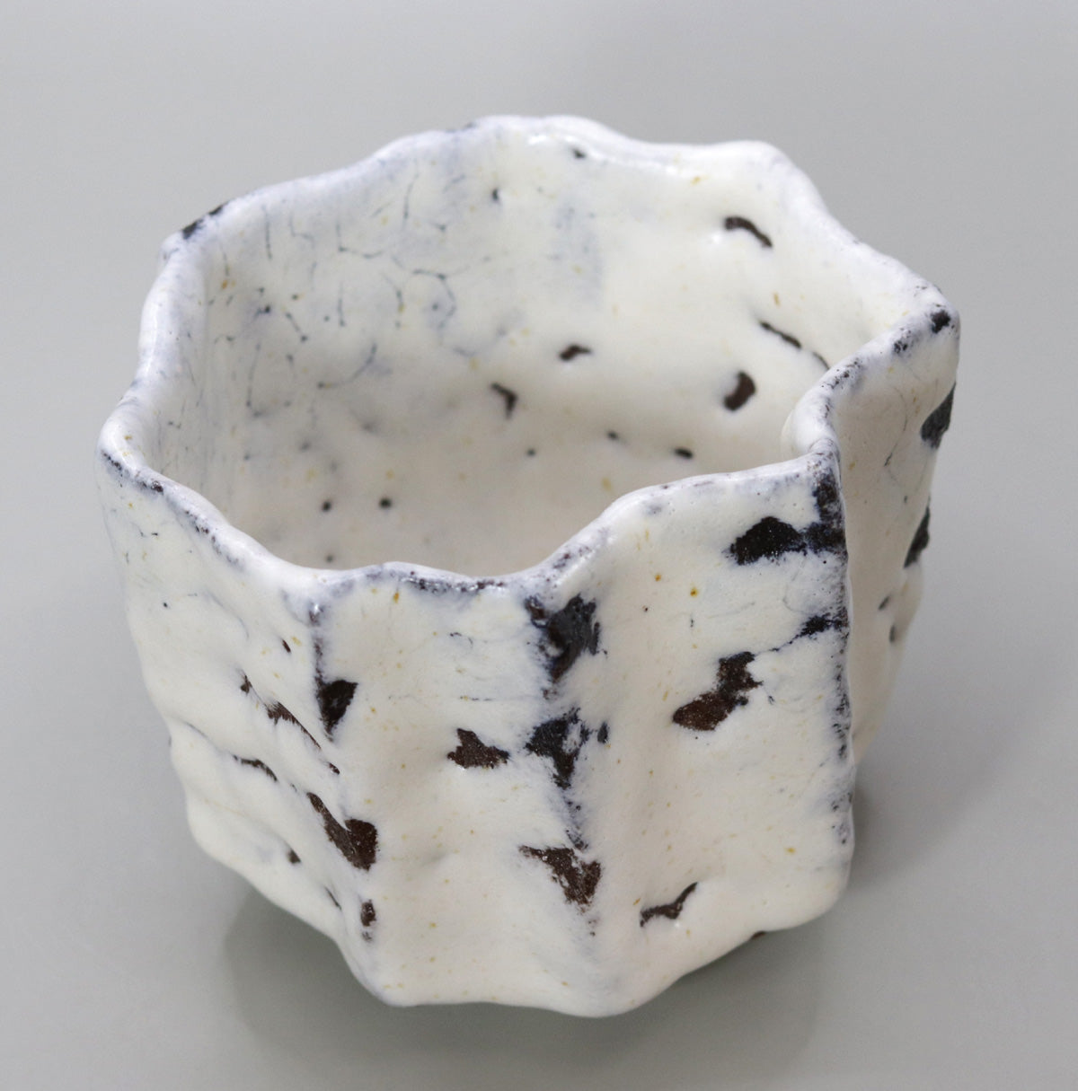 Based on earth and ash, which are rooted in the history of Tamba ware, this work breaks new ground with its bold form resembling a six-petal flower, and is the crystallization of Nishihata Tadashi's innovative spirit. The rich expressions hidden within the "pure" white color and the functional beauty represented by the comfortable feel in the hand speak of the value of this work as a sculpture that goes beyond a tea bowl.