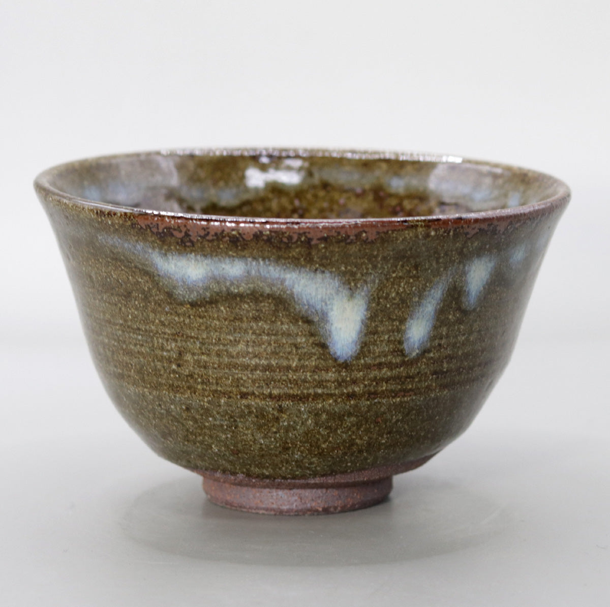 The bowl shape with a slightly outward-curving rim is reminiscent of the silhouette of the Yakushiji pagoda stretching into the sky. Five wheel marks are engraved on the body, forming horizontal lines reminiscent of the foundation stonework of ancient pagodas. The glaze is cut around the base, and the reddish purple of the fire flashes peek out, highlighting the contrast between the earthen surface and the glaze.