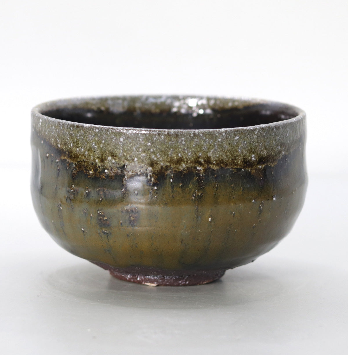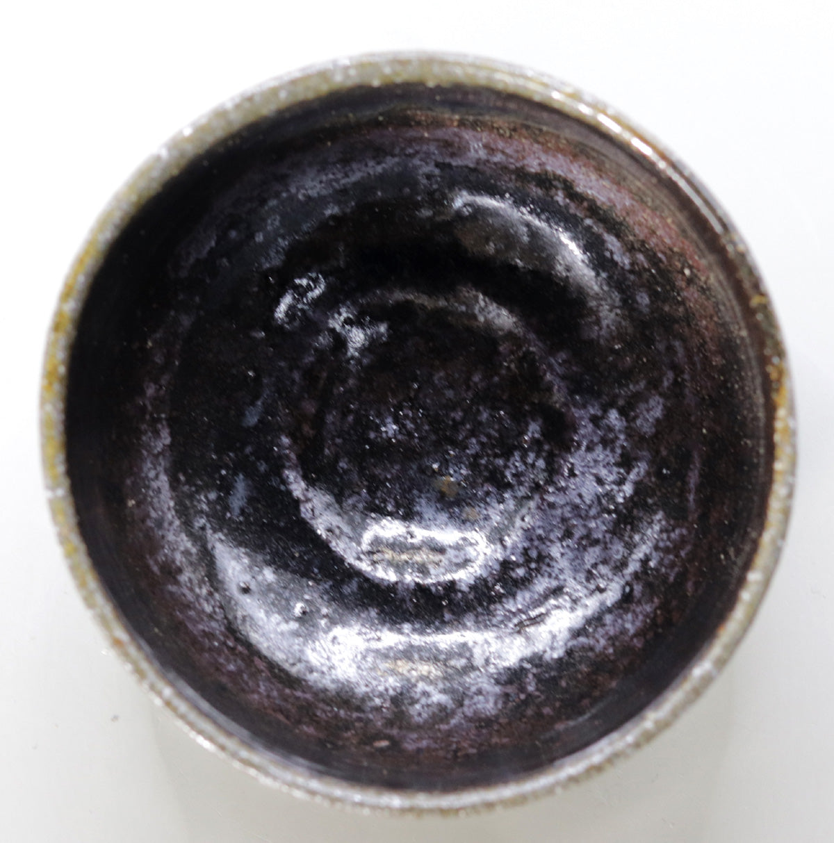 The iron glaze that covers the exterior is fired at a high temperature to produce three layers of color: 1) rough silver gray crystals on the rim, 2) a heavy luster of moss black to ink black on the upper body, and 3) deep olive colored glaze veins on the lower body. Silver grains that have turned into glass from natural ash are scattered throughout the piece, creating a mysterious expression reminiscent of foundation stones wet with night dew.