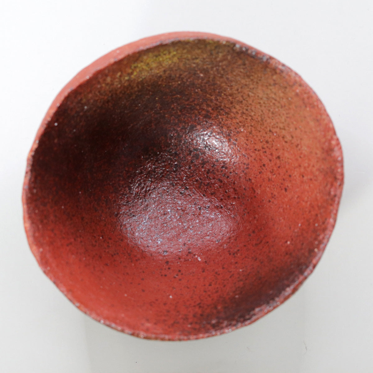 A semi-glossy crimson color spreads from the inside to the inside wall, creating a contrast with the matte red of the outside wall. The iron that turns into a glaze during firing takes on a vitreous quality, and where it accumulates thinly it gives off a dull metallic shine. When matcha is poured into the pot, the three colors of green, red, and black intertwine within the pot, creating a fantastical scene, as if a single drop of the universe were trapped in the palm of your hand.