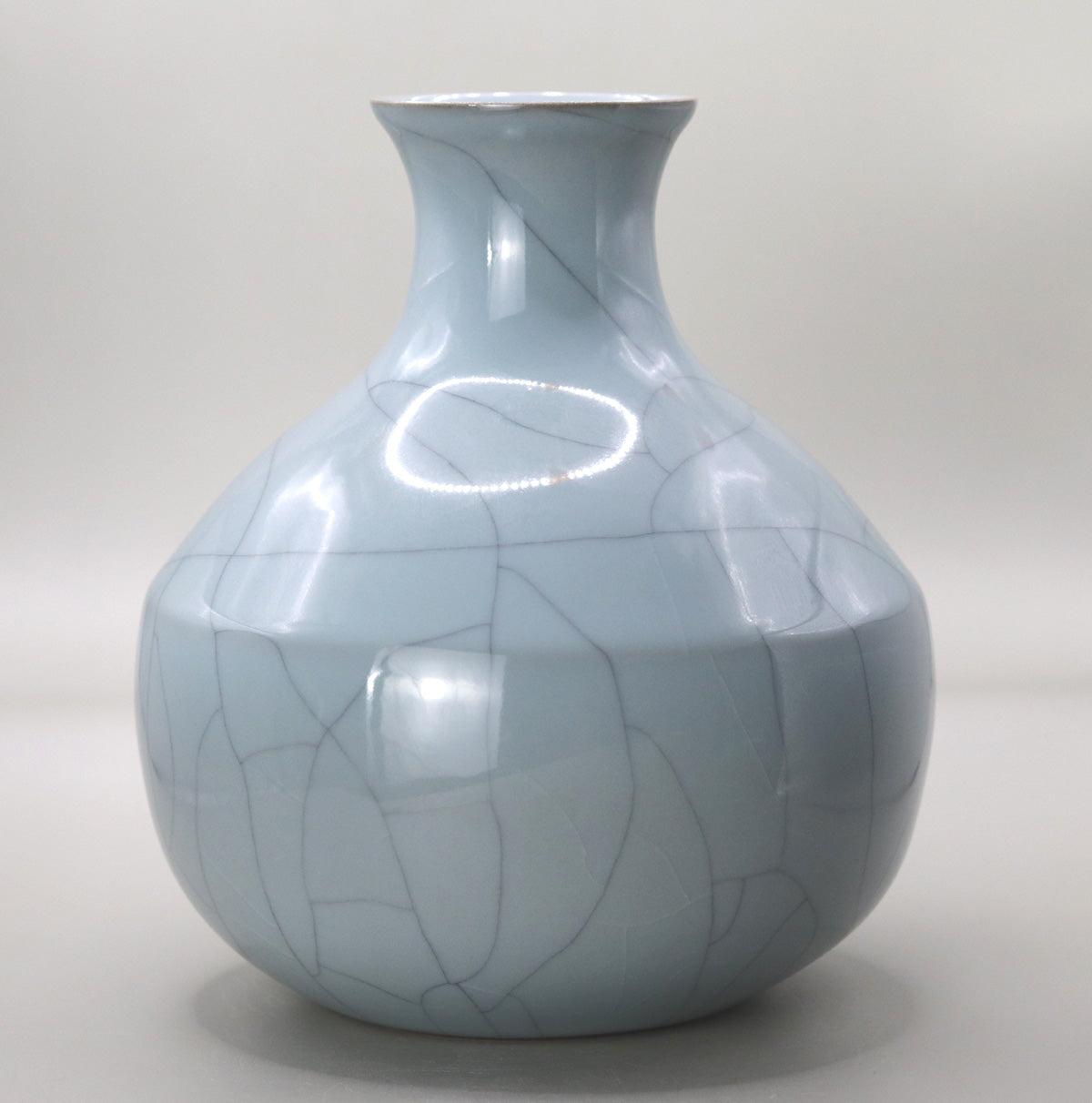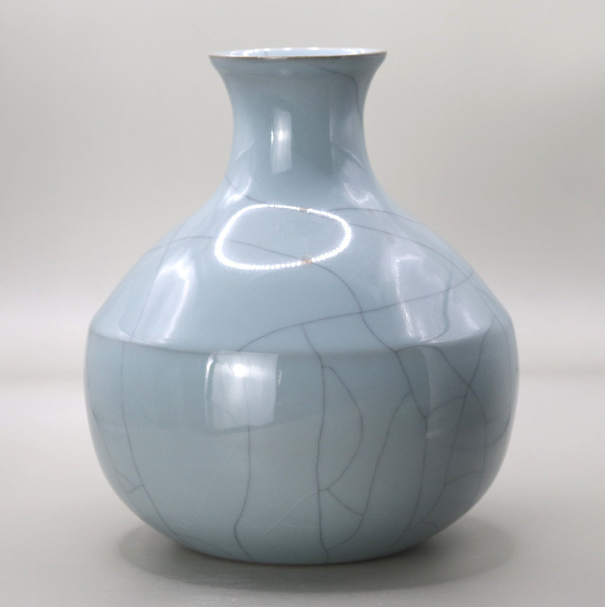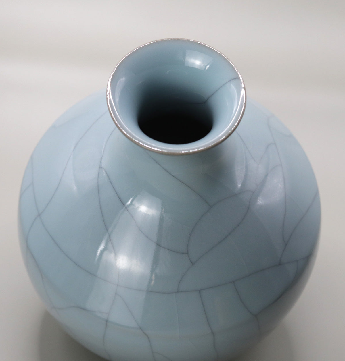 This vase features a large, gentle craze beneath a pale sky-blue celadon glaze. The lines that flow from the large, bulging vase shape to the narrow, tapered neck and slightly outward-curving rim are reminiscent of the classic "Gyokko Shunbei" vase, but the slightly acute angle of the shoulders gives it a sharpness that stands out in a modern space. The mirror-like surface of the celadon glaze softly captures the surrounding light, and the craze lines emerge like ink writing, reminiscent of an abstract painting.
