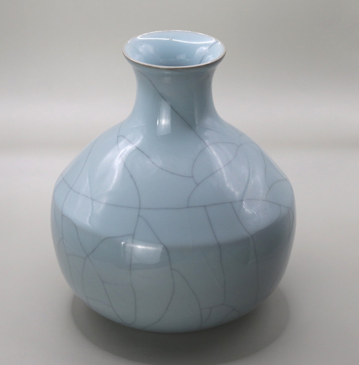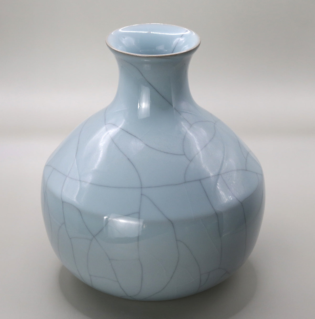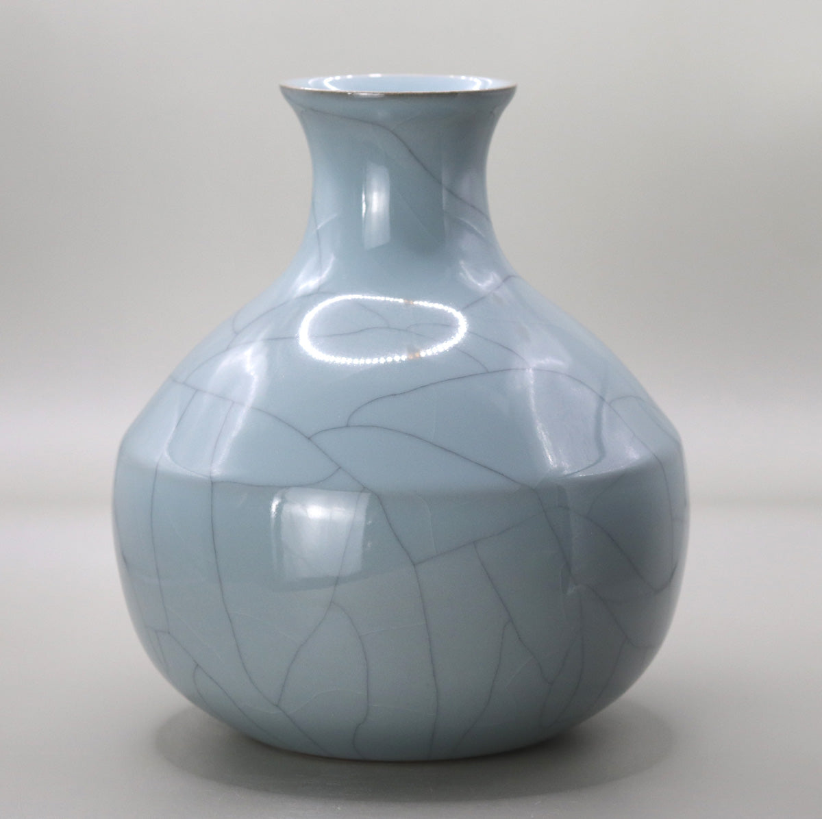 This vase features a large, gentle craze beneath a pale sky-blue celadon glaze. The lines that flow from the large, bulging vase shape to the narrow, tapered neck and slightly outward-curving rim are reminiscent of the classic "Gyokko Shunbei" vase, but the slightly acute angle of the shoulders gives it a sharpness that stands out in a modern space. The mirror-like surface of the celadon glaze softly captures the surrounding light, and the craze lines emerge like ink writing, reminiscent of an abstract painting.