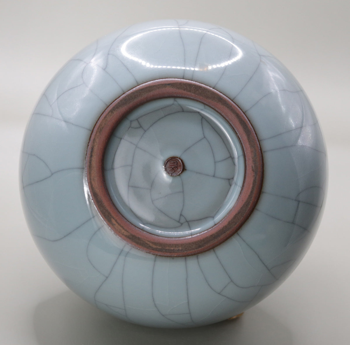 Masao Tagai is a full member of the Japan Crafts Association and has been studying celadon as his specialty. His "rain-filled blue" color, which is achieved through thick glaze and advanced reduction control, is said to be comparable to that of Song Dynasty Longquan kilns, and he has received high praise at solo exhibitions in Kyoto and Tokyo. In this work, he blended a large amount of feldspar into the clay and designed it to have a higher expansion rate than the glaze, establishing a unique mixture that allows the thick glaze to form large crazes without peeling.