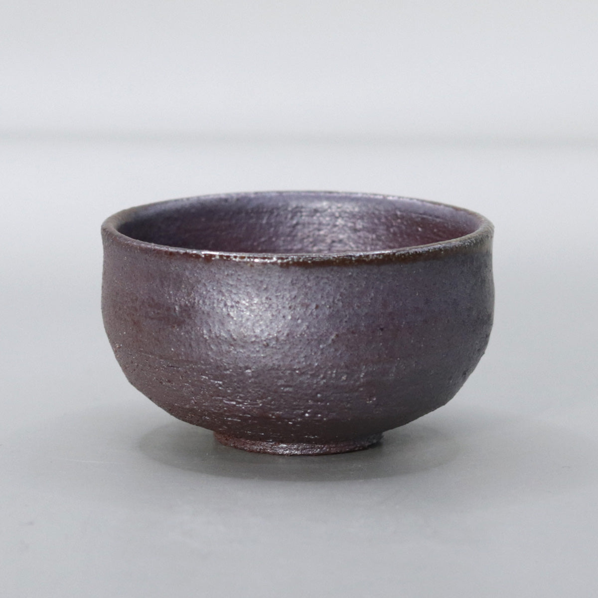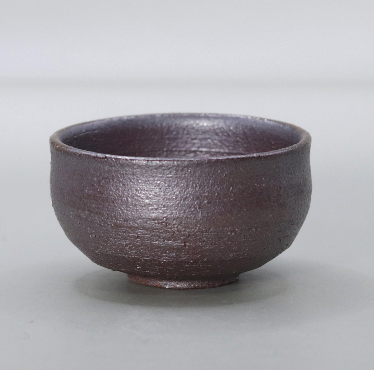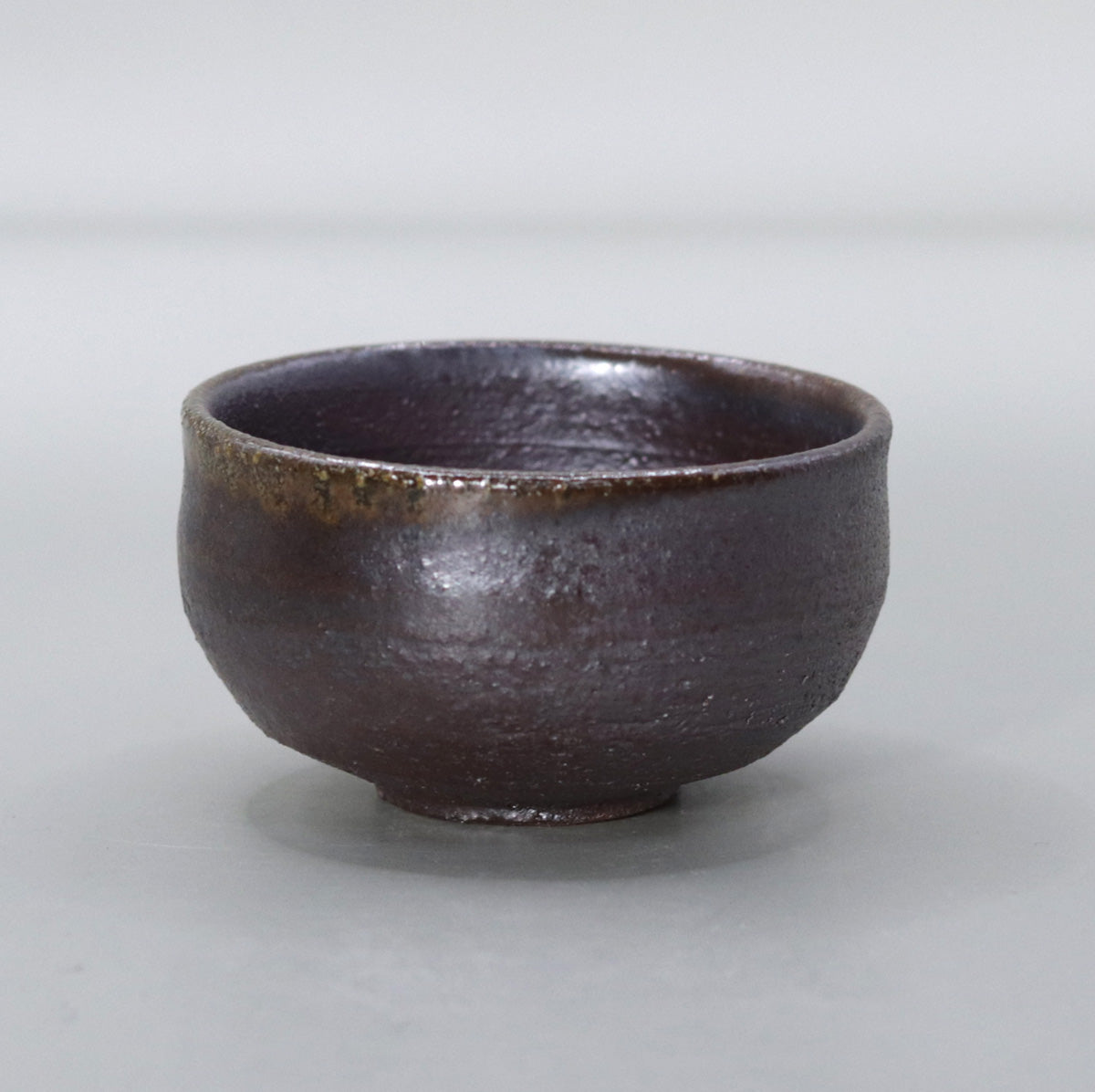 By firing the piece at a high temperature of about 1250℃ without applying any glaze, the iron in the clay is repeatedly reduced and oxidized, resulting in a multi-layered appearance: 1) a dull metallic luster that changes from iron black to dark brown all over the surface, 2) fine ash becomes a natural glaze, scattering a faint light like silver sand on the surface, and 3) a faint copper-colored fire color appears around the rim, tightening the look. The charm of this piece is the tranquility of a moss-covered cornerstone covered in night dew.