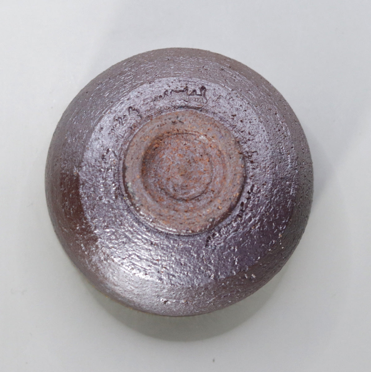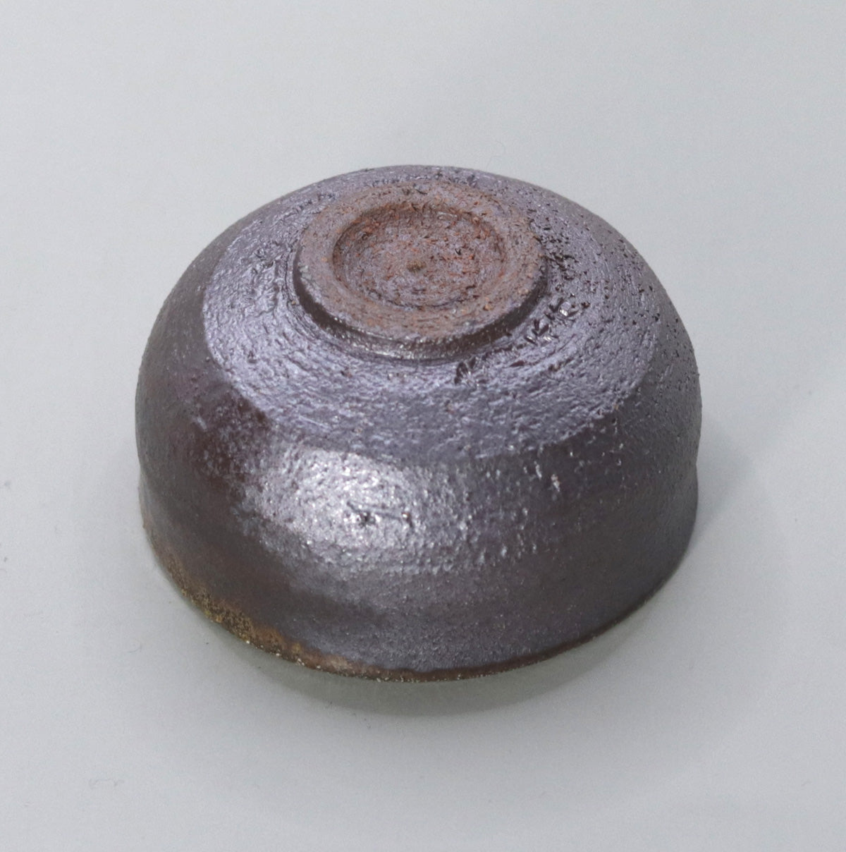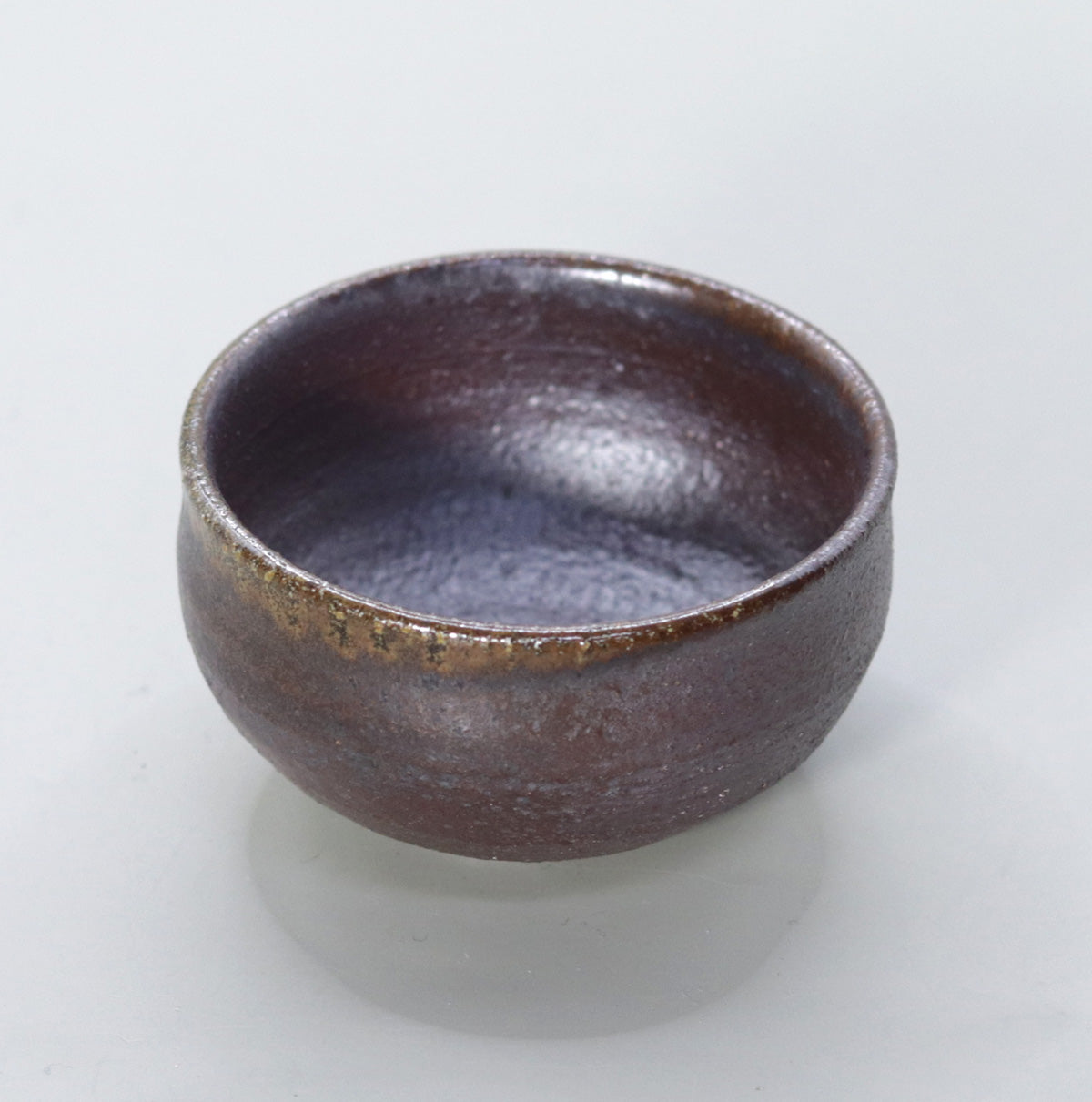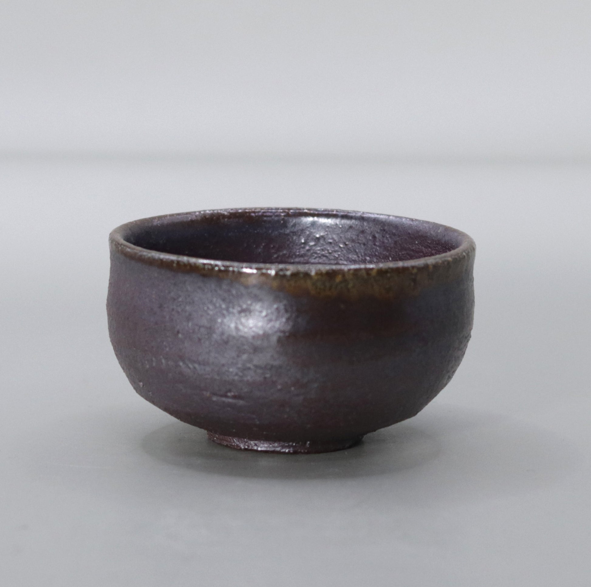 By firing the piece at a high temperature of about 1250℃ without applying any glaze, the iron in the clay is repeatedly reduced and oxidized, resulting in a multi-layered appearance: 1) a dull metallic luster that changes from iron black to dark brown all over the surface, 2) fine ash becomes a natural glaze, scattering a faint light like silver sand on the surface, and 3) a faint copper-colored fire color appears around the rim, tightening the look. The charm of this piece is the tranquility of a moss-covered cornerstone covered in night dew.