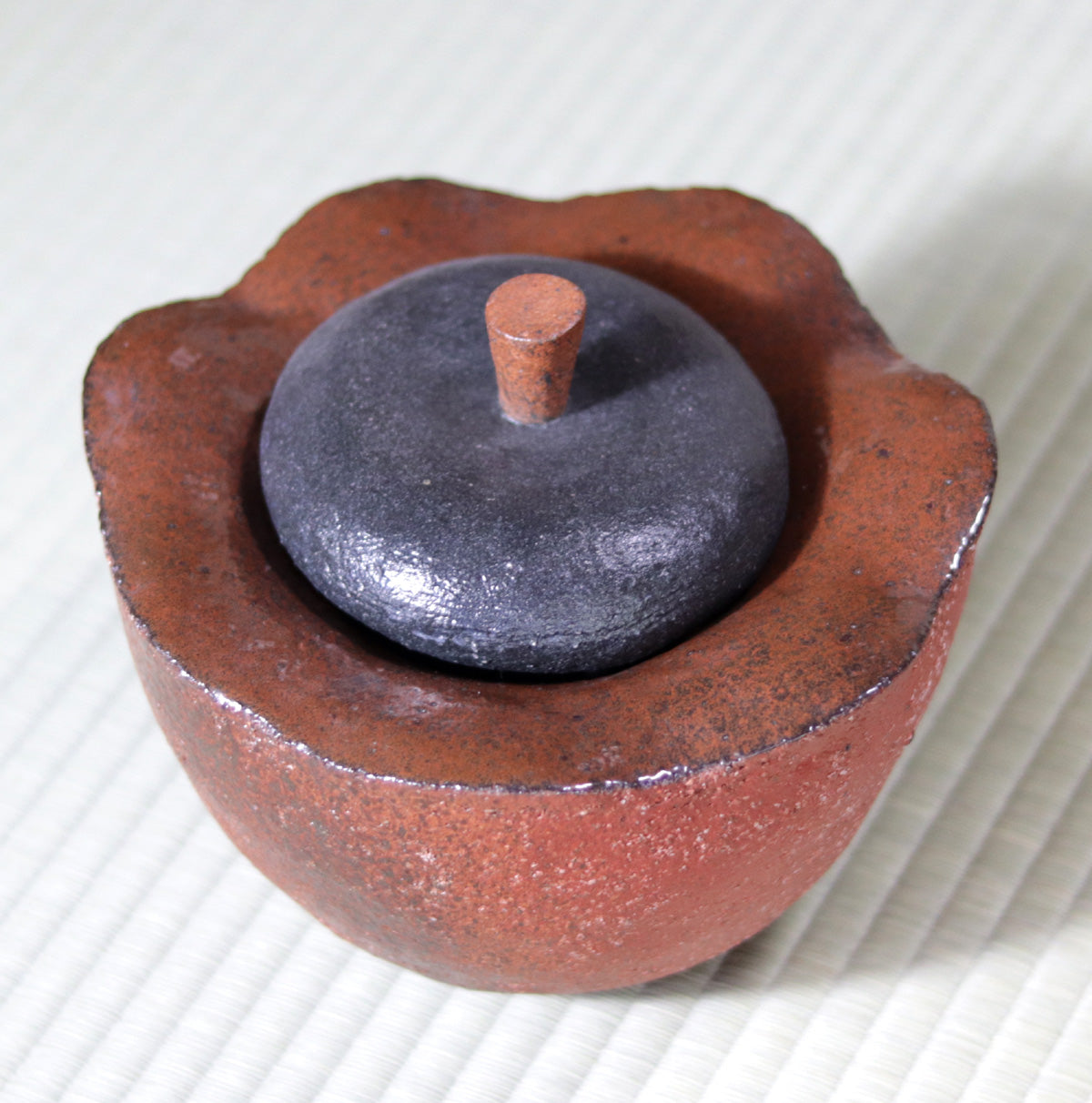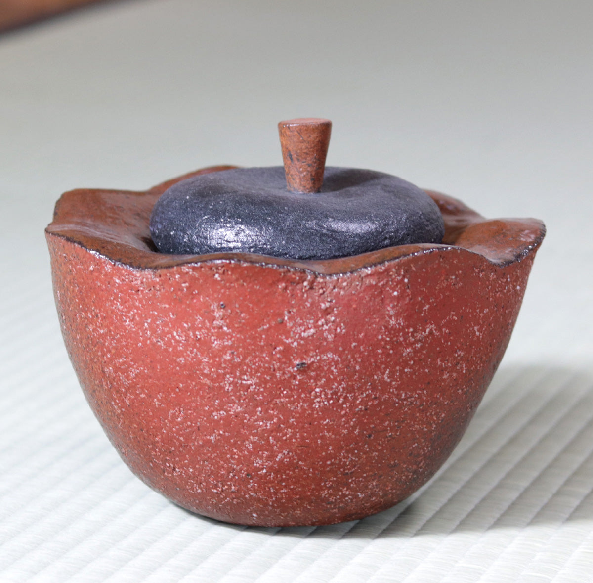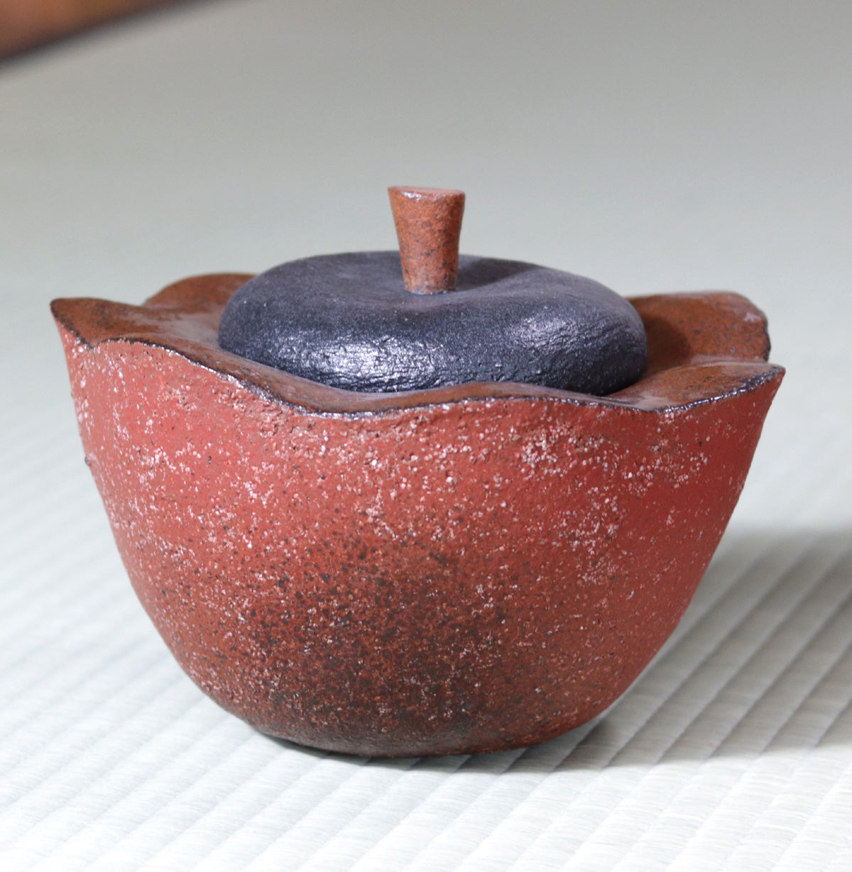 This piece, "Tamba Red Water Jar" by Nishibata Tadashi, is a striking piece with a shape reminiscent of fruit sprouting from the earth and a vivid contrast between the red clay and black glaze. The natural form and the strength of the material are beautifully combined to bring a quiet presence to the tea ceremony.