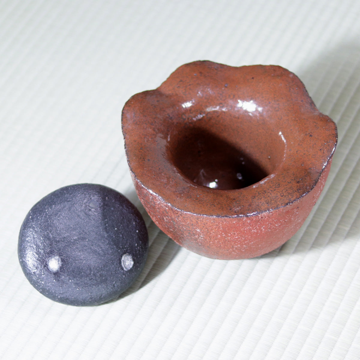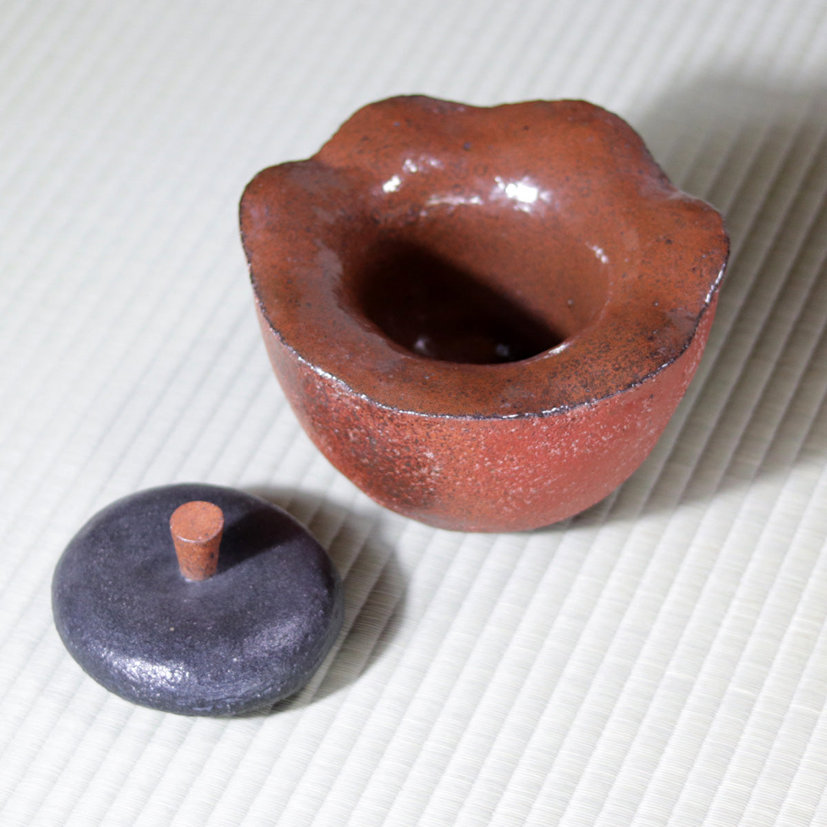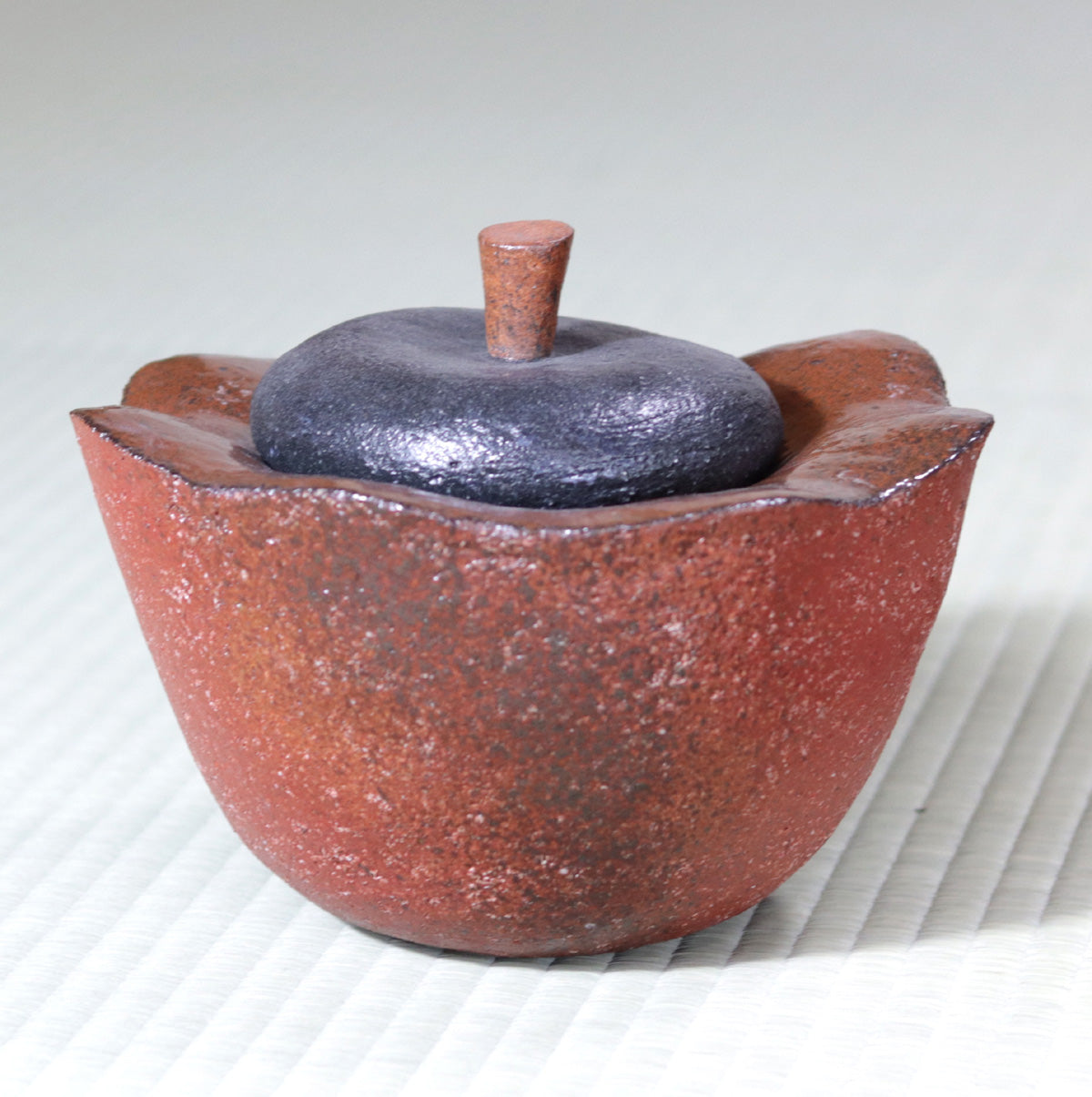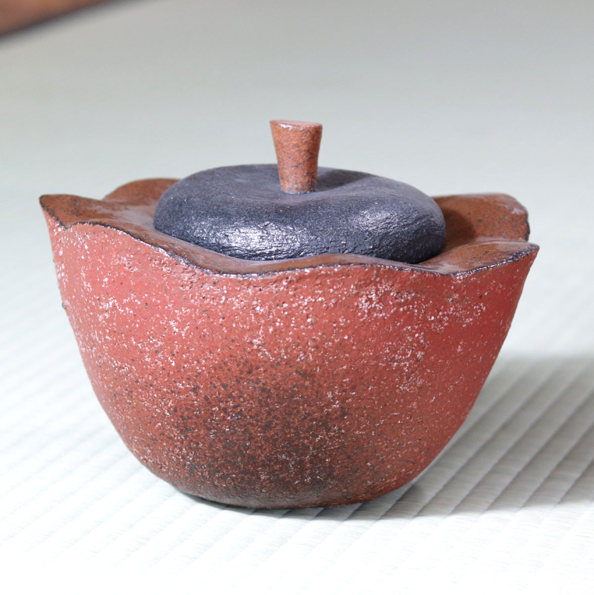 This piece, "Tamba Red Water Jar" by Nishibata Tadashi, is a striking piece with a shape reminiscent of fruit sprouting from the earth and a vivid contrast between the red clay and black glaze. The natural form and the strength of the material are beautifully combined to bring a quiet presence to the tea ceremony.