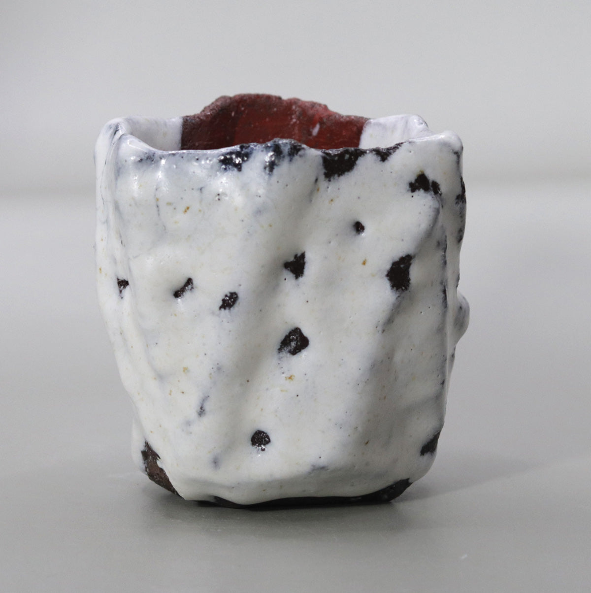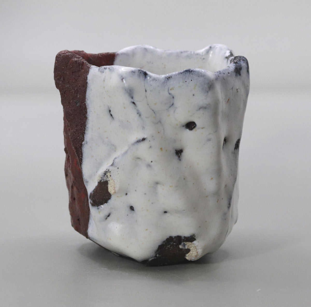 The straw white glaze that covers the entire vessel melts and flows softly during firing, and thickly adheres to the vessel's surface. Irregular black spots containing iron appear on the surface of the glaze, creating a poetic scene reminiscent of soot falling on a snowy field. The red clay that can be seen faintly through the white adds depth and warmth to the vessel.