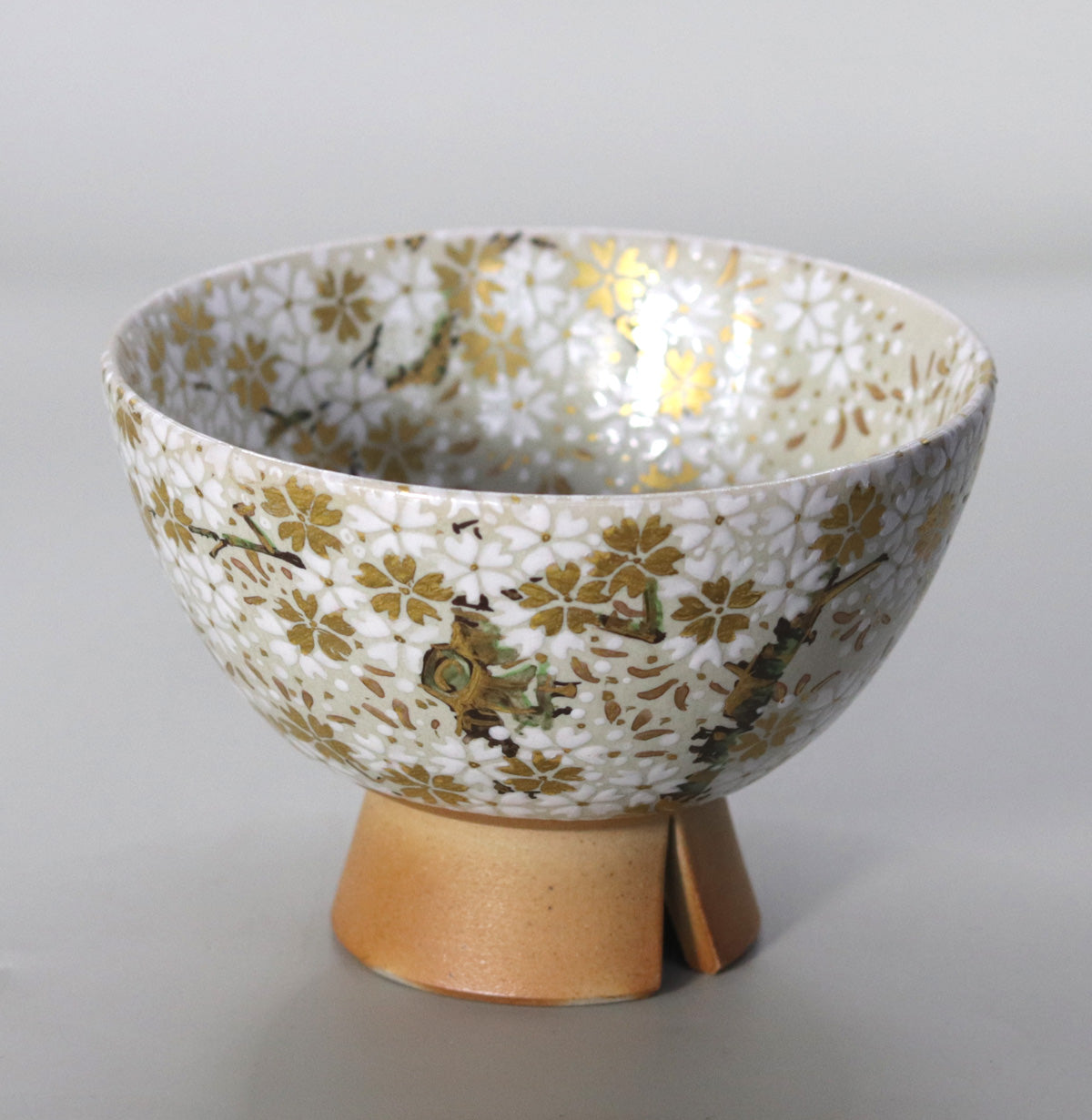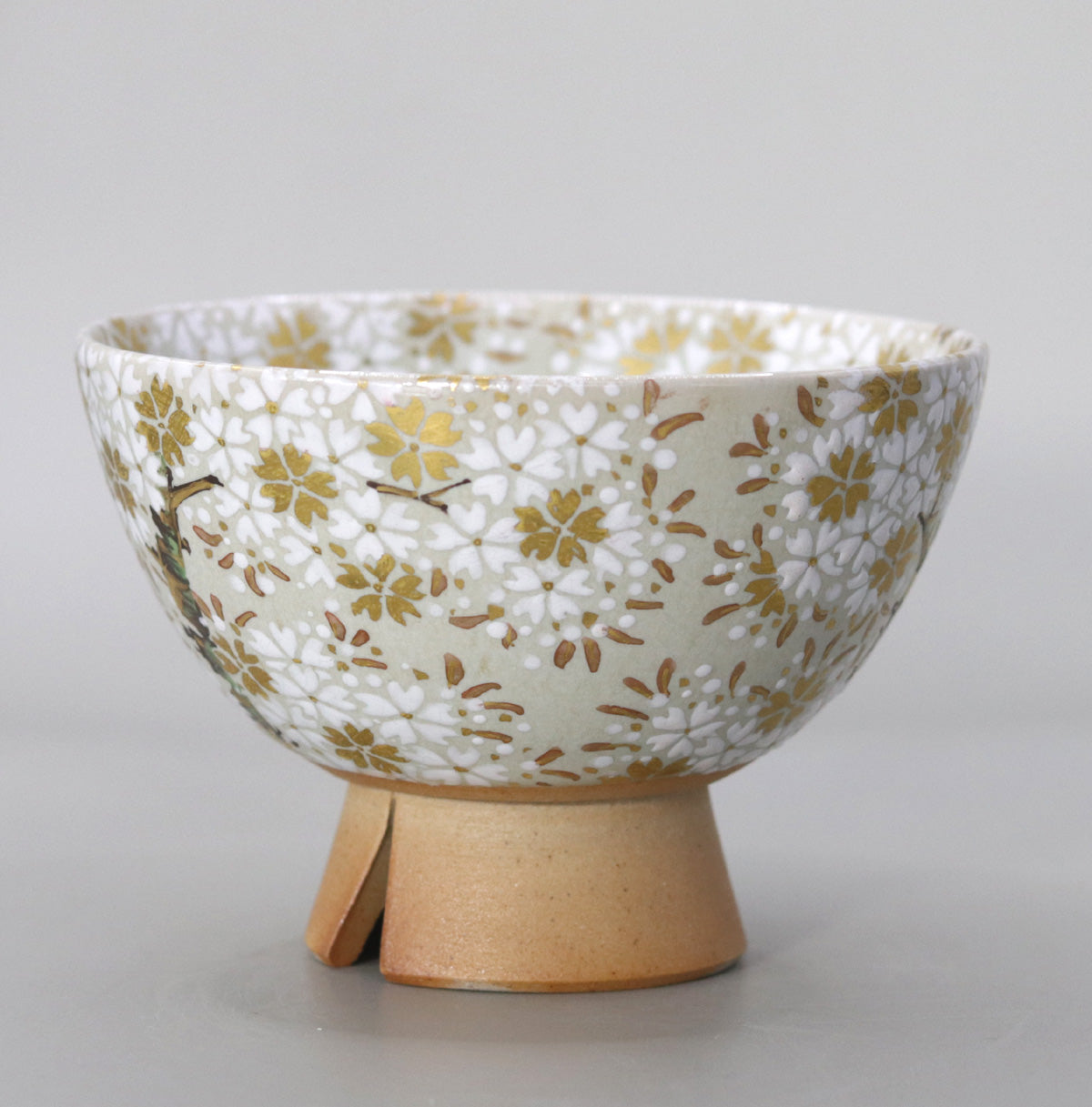 This is a gorgeous bowl with cherry blossoms in full bloom scattered all over it. White and gold cherry blossoms bloom all over the bowl, with small birds that look like Japanese bush warblers frolicking here and there - it's like holding "spring itself" in the palm of your hand. Below, we will explain its appeal from five perspectives: shape, design, technique, functionality at the tea ceremony, and cultural significance.