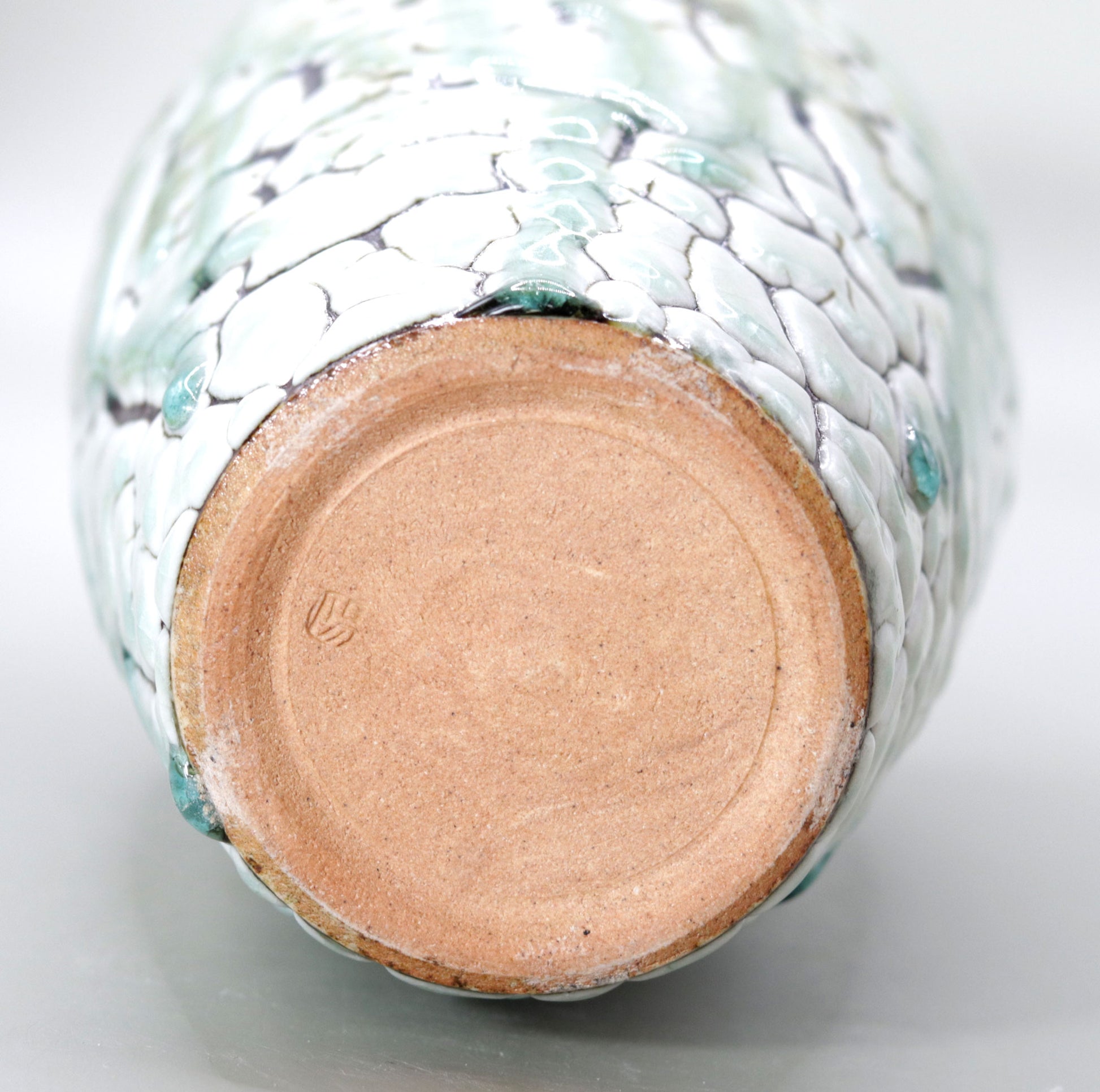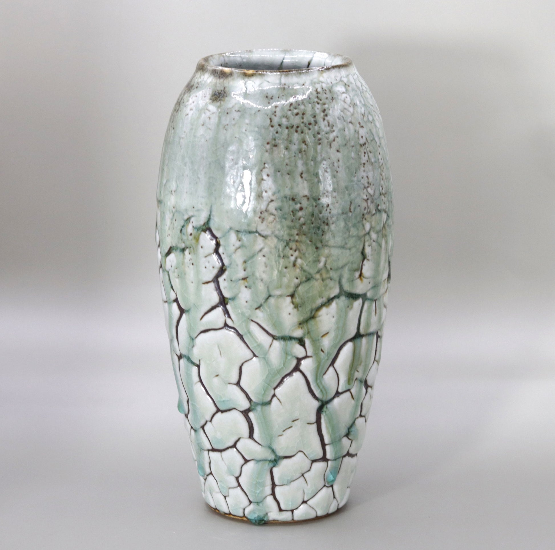 The most striking feature of the Ash Glaze Vase is the bold green glaze applied to the white, cracked surface of the pottery . The white symbolizes the earth, and the green the life force of plants; this contrast gives the piece a powerful expression. The green glaze is applied boldly, like water flowing naturally, and together with the random crack pattern, it gives a sense of the randomness of nature. The vividness of the colors and the beauty of the shape are in harmony, and arranging flowers in it makes its charm stand out even more.