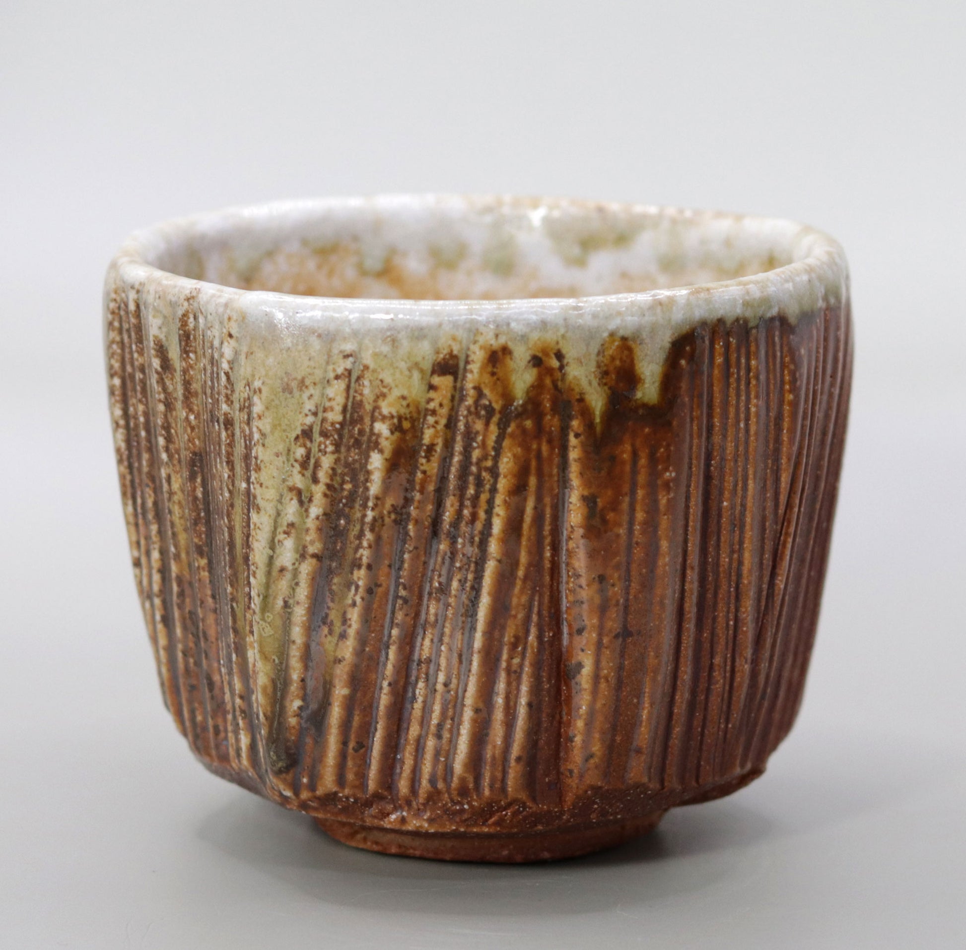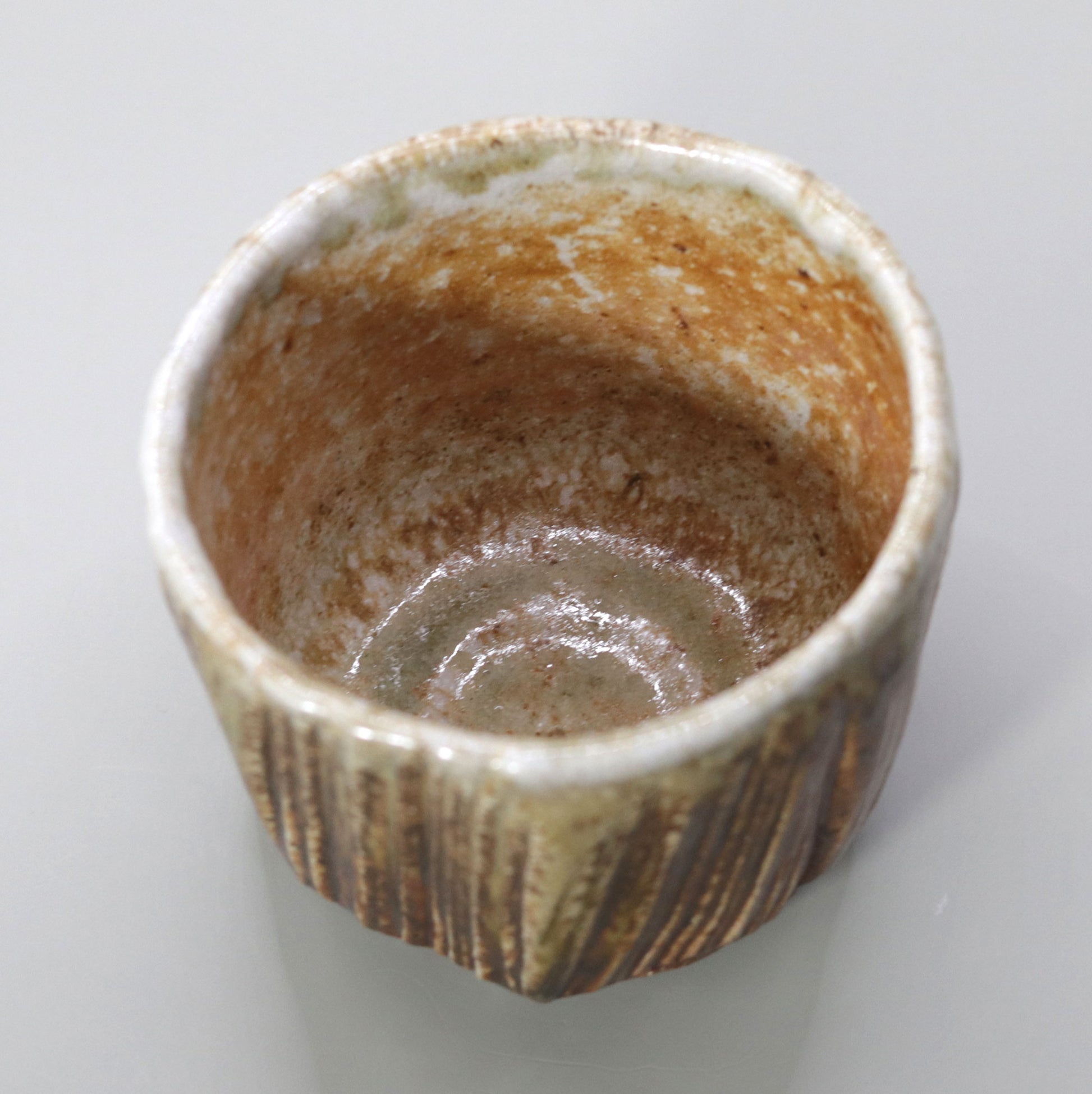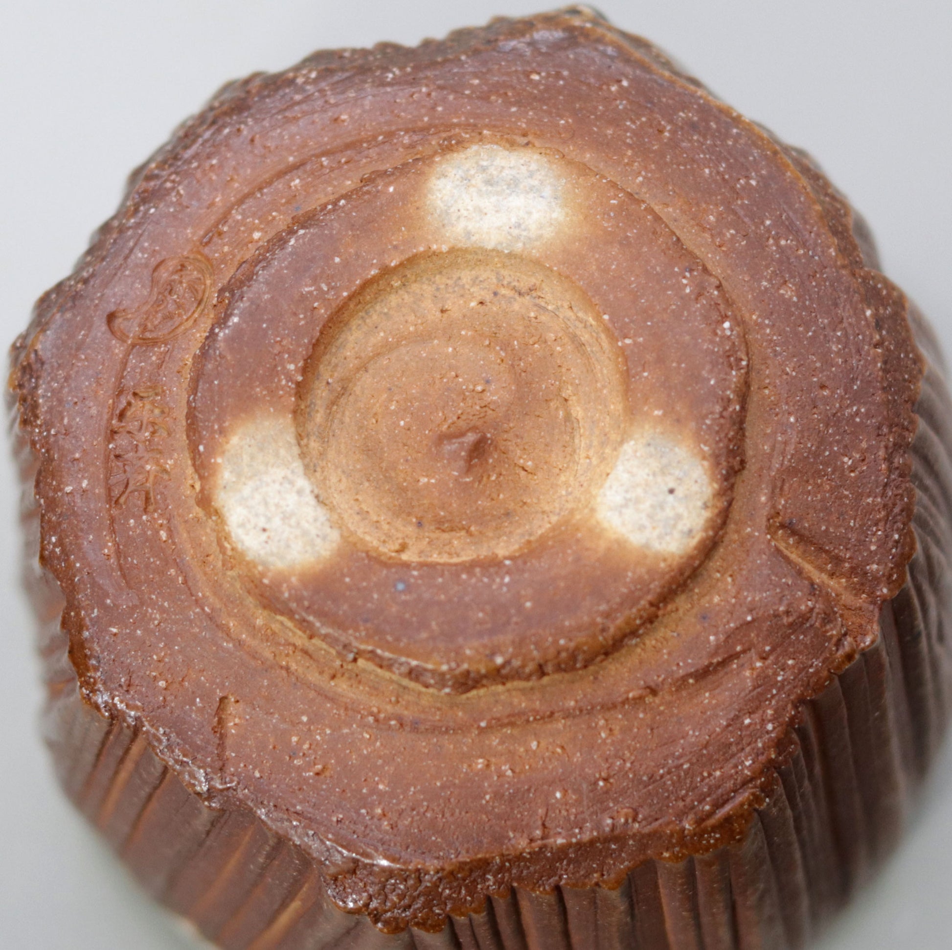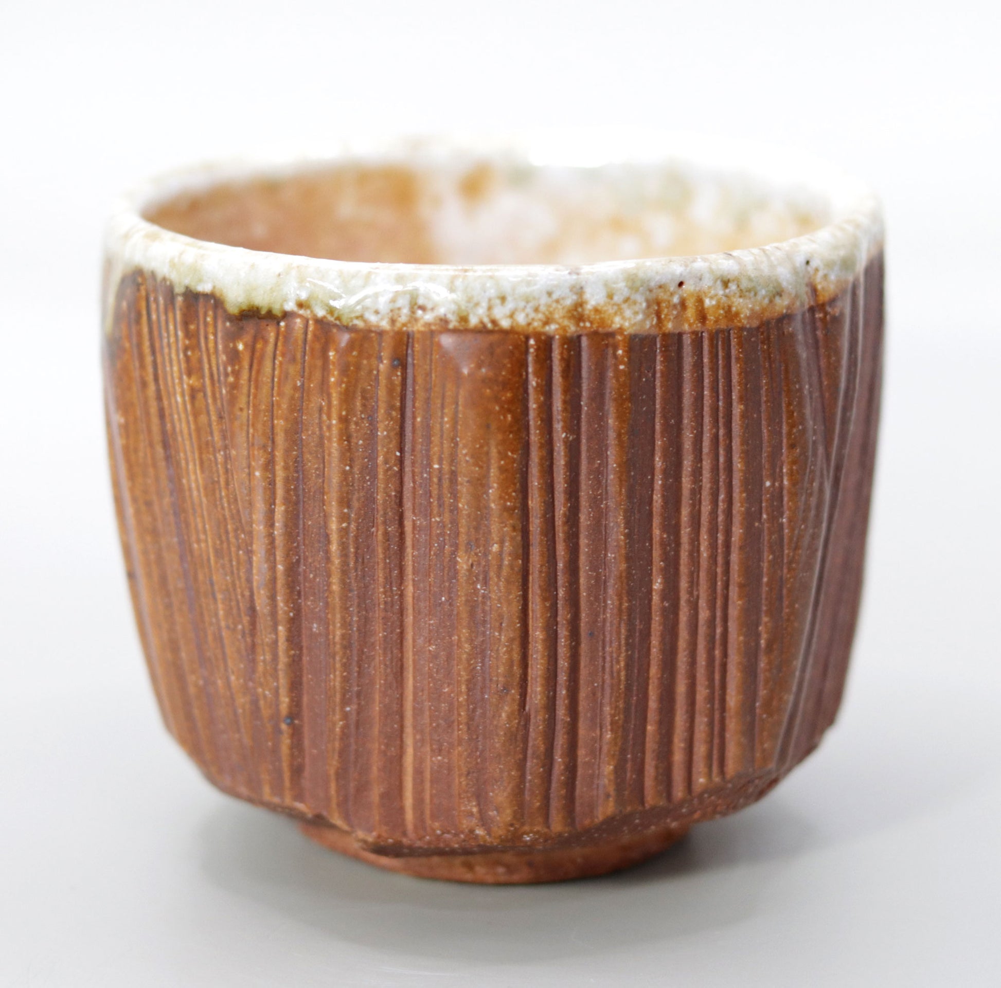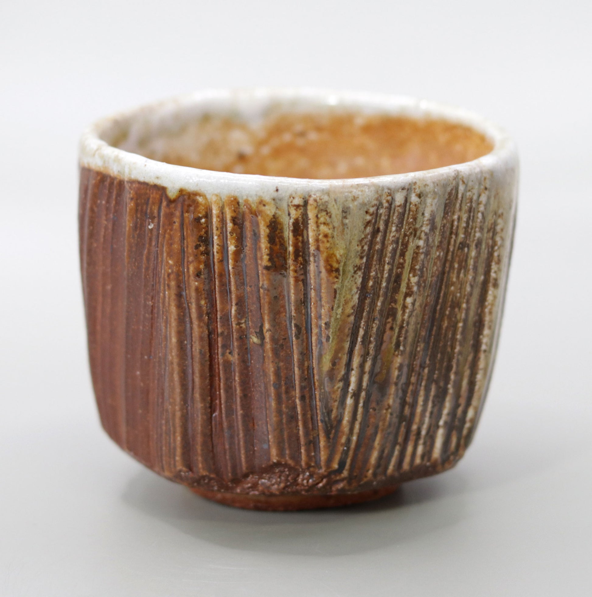 The shape of this tea bowl is very unique, and it was made by hammering split red pine logs and hollowing them out. The powerful lines created by hammering the logs give the entire bowl a powerful impression. The outside is unglazed, and the firing process gives it a simple and powerful texture, and you can feel its unique texture when you pick it up.