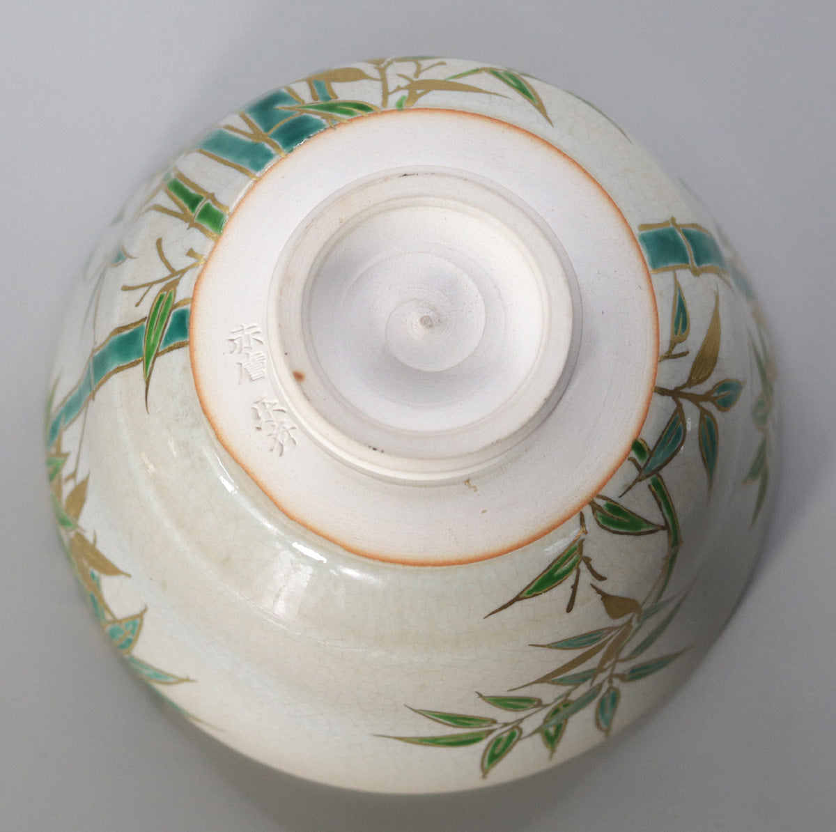 The contrast between stillness and motion created by the green-green bamboo, the gold-hued young leaves, and the white glaze crazing - this piece captures in one bowl the refreshing feeling of the morning sun shining into a bamboo forest in early summer. If placed at a tea ceremony, guests will be able to sip a cup of tea while feeling the breeze of the bamboo forest blowing across their palms, and share the joy of the changing seasons and growth in a peaceful heart. Onishi Rakusai's young bamboo tea bowl is a truly auspicious masterpiece that combines the beauty of utility and the beauty of storytelling.