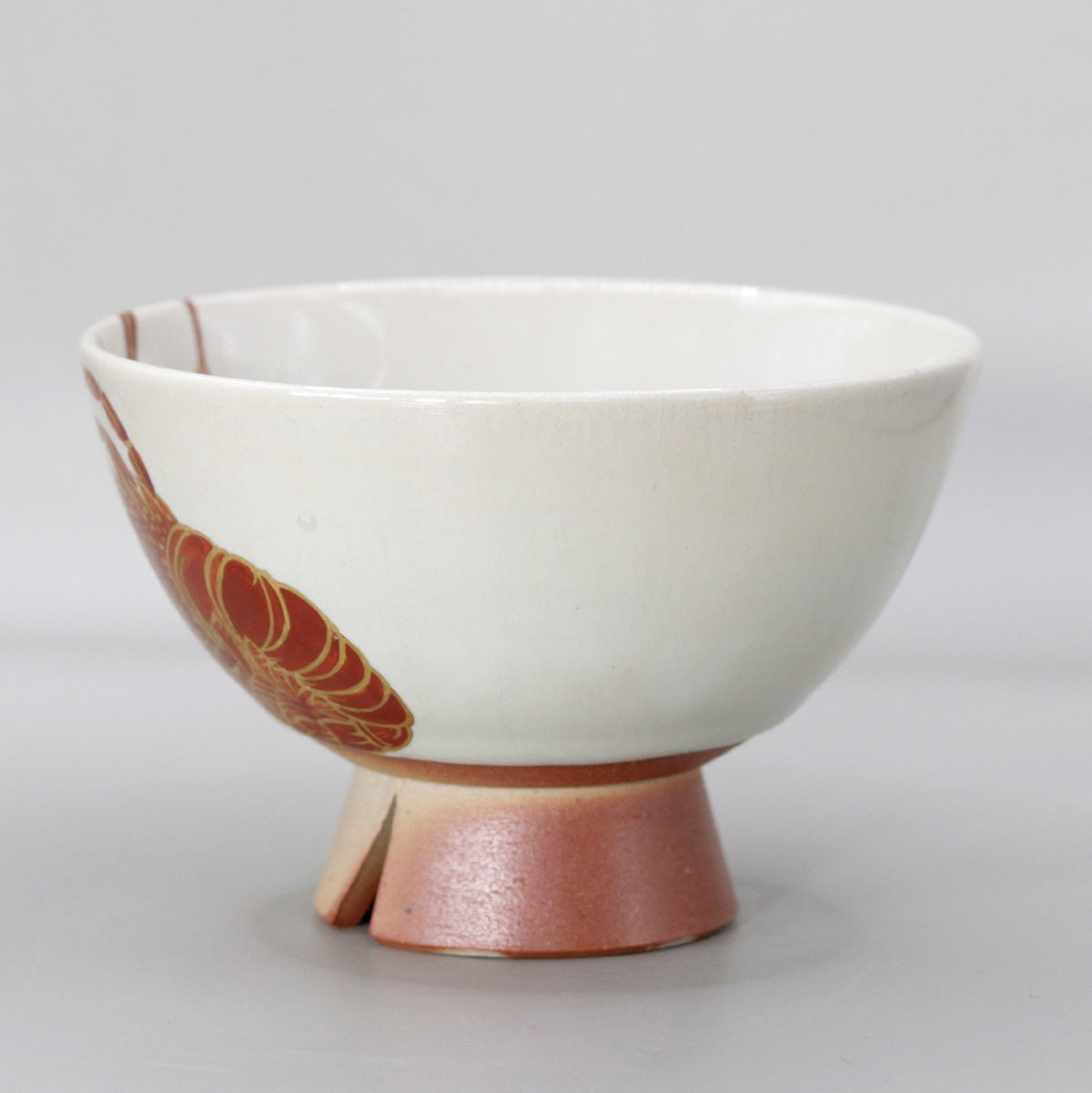 Matcha Shines <br data-start="1175" data-end="1178">The inside is unified with a plain white glaze, against which the green of the matcha shines like a mirror. When the tea ceremony is performed, the red and gold of the shrimp are reflected on the tea surface, creating a bright and festive atmosphere.