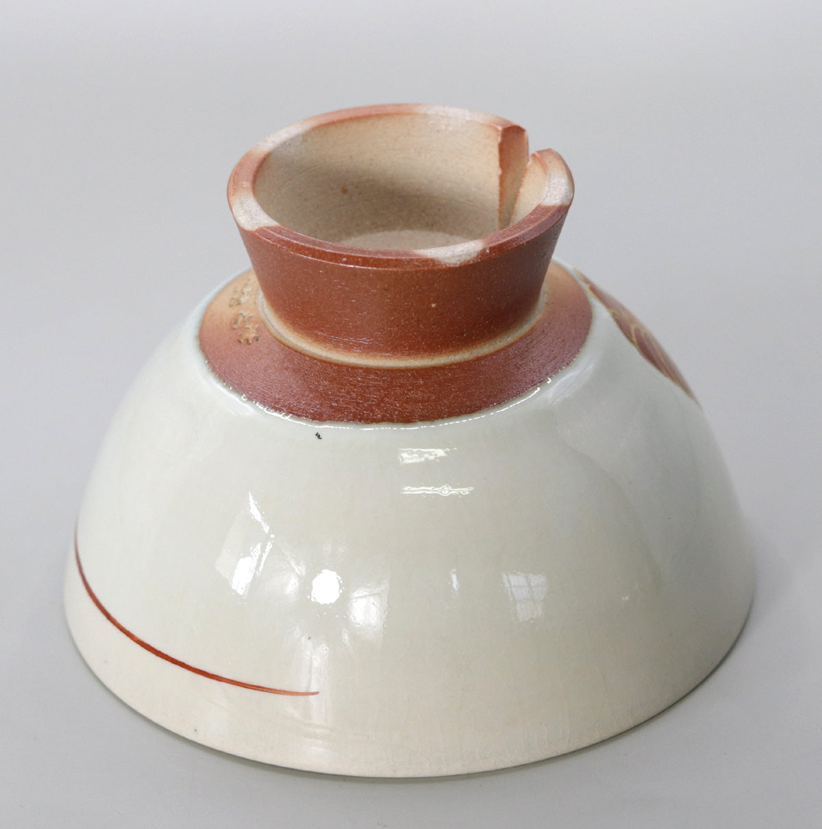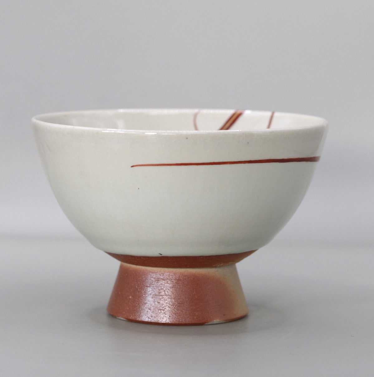 The foot is cut in three directions to create a split foot, which gives it a modern, stable feel while retaining the strength inherent in the Goki style. The base contains a small amount of iron, and the cherry-pink fire color produced by reduction firing is faintly apparent, adding a touch of vermilion to the ware used in celebrations.