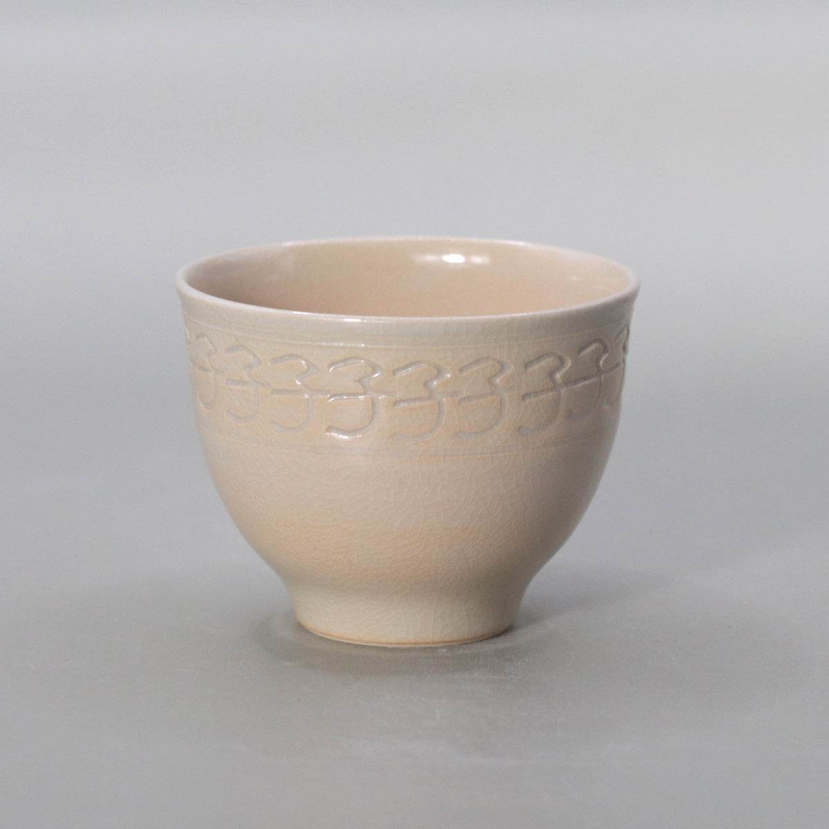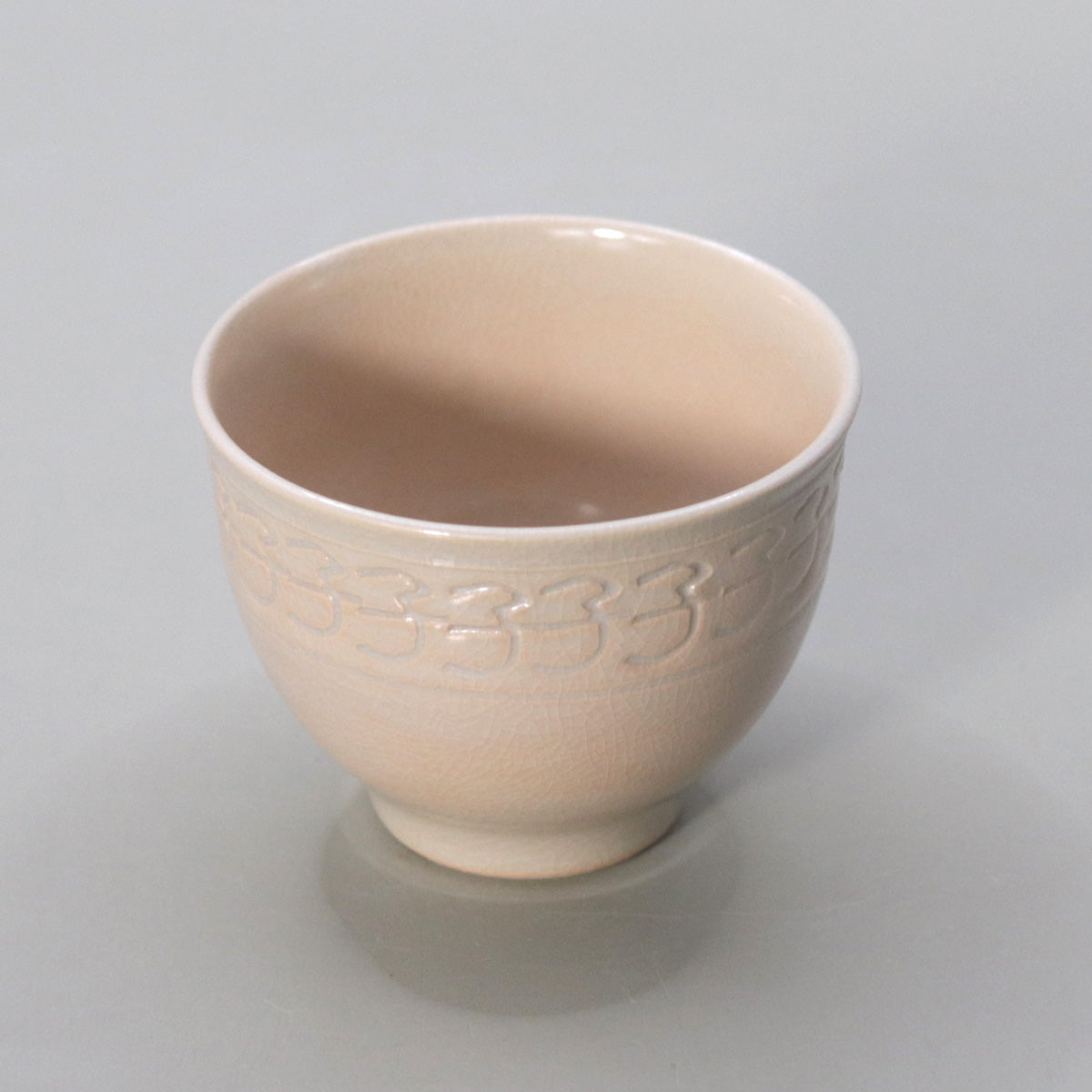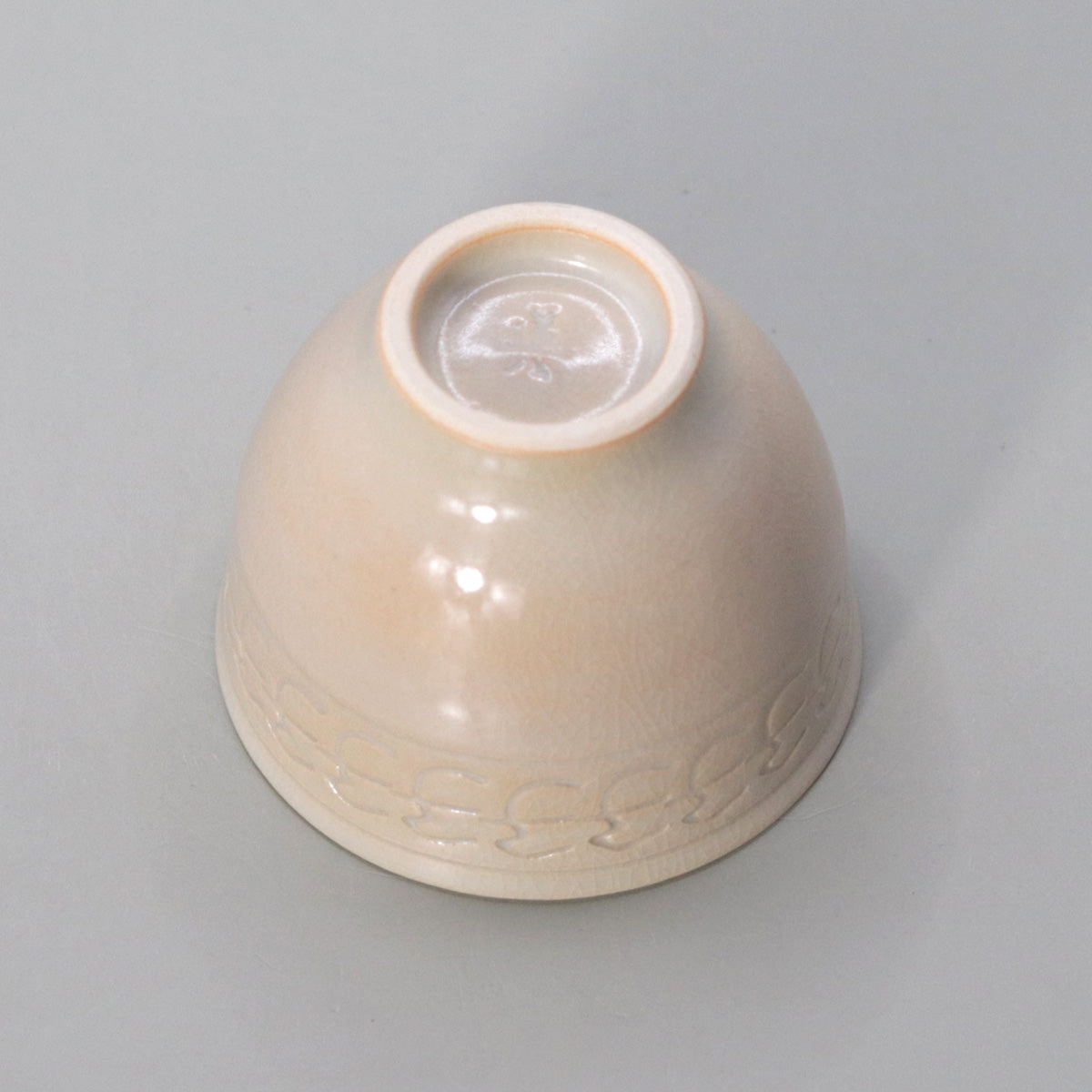 本作「ぐい呑 子」は、乳白釉の静けさの中に、命の息吹を象徴する刻文が柔らかく浮かぶ佳品。