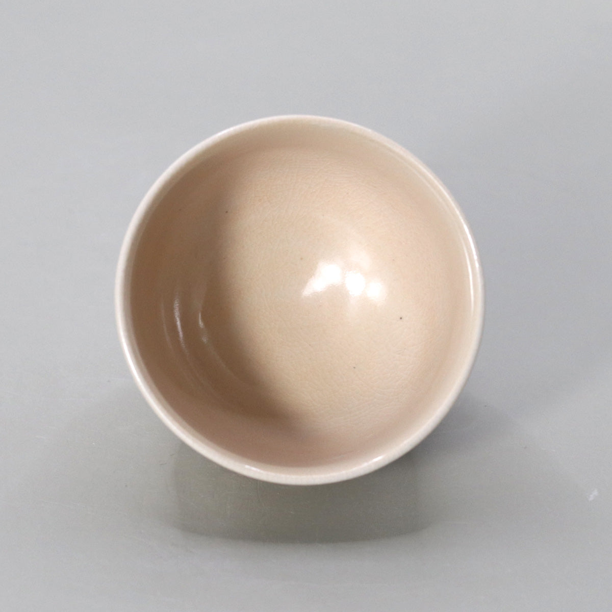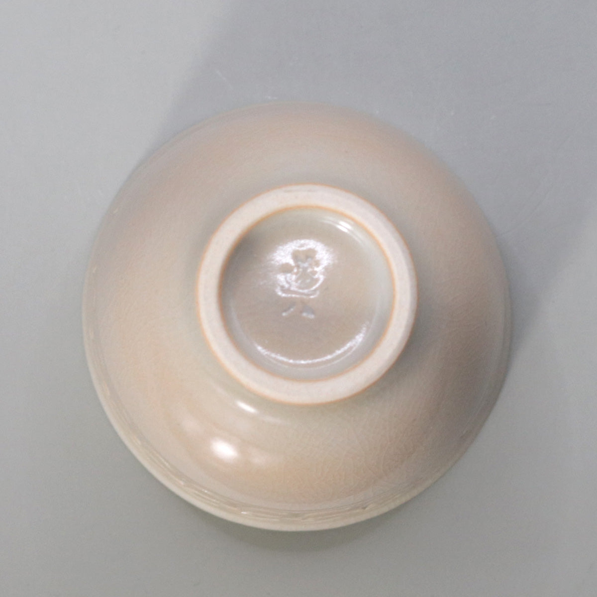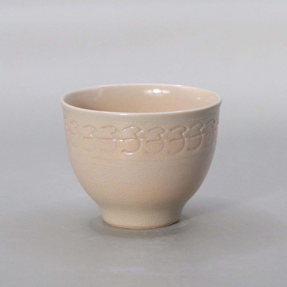 本作「ぐい呑 子」は、乳白釉の静けさの中に、命の息吹を象徴する刻文が柔らかく浮かぶ佳品。