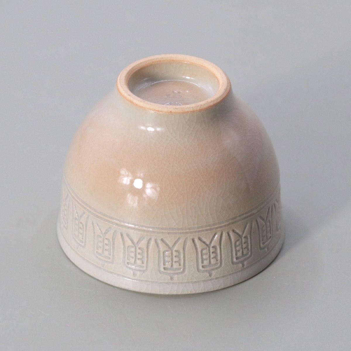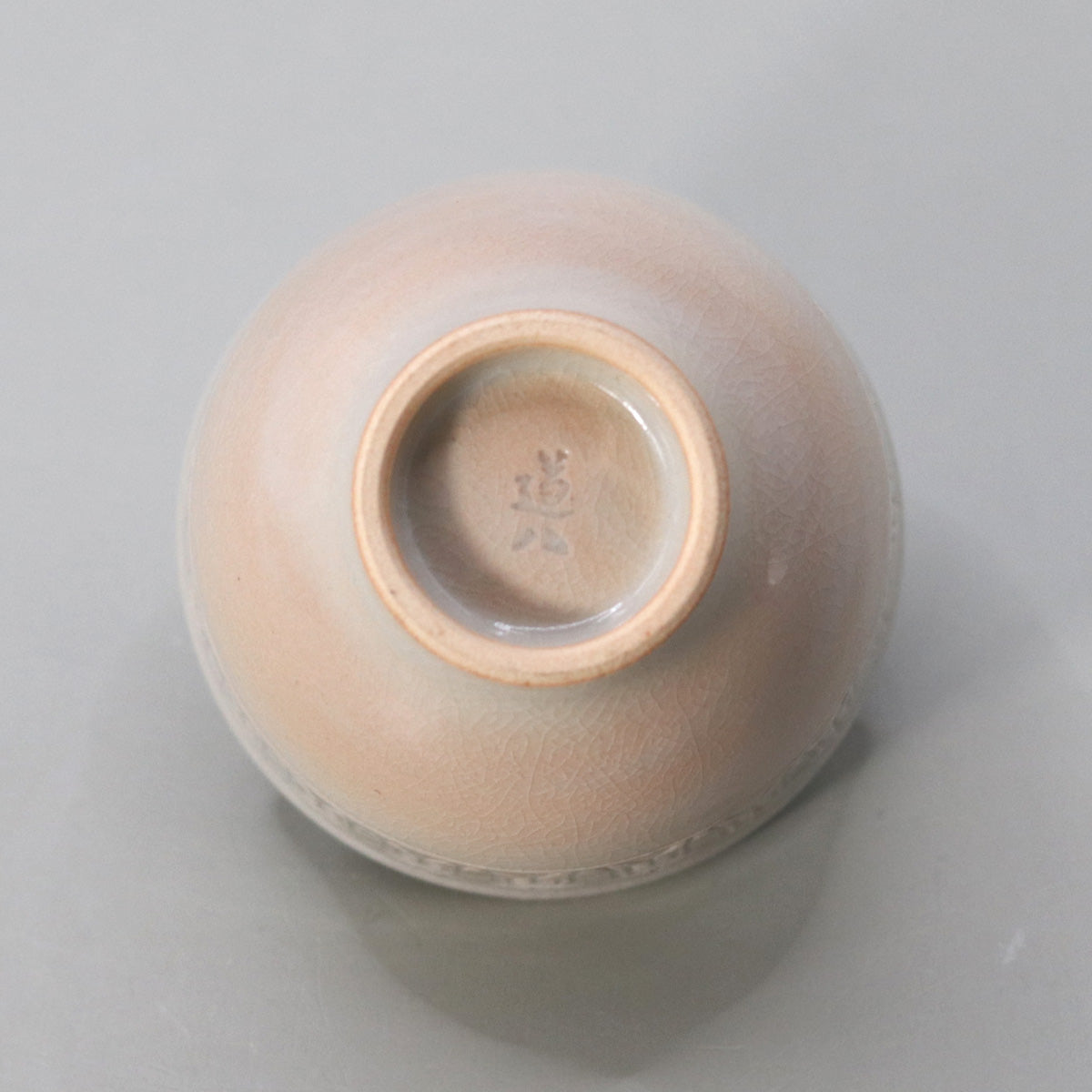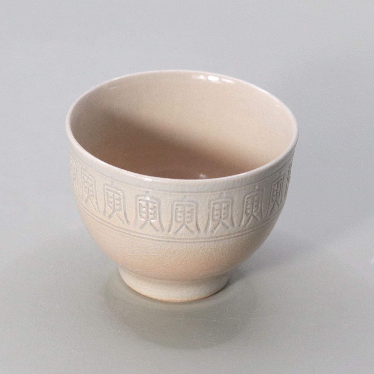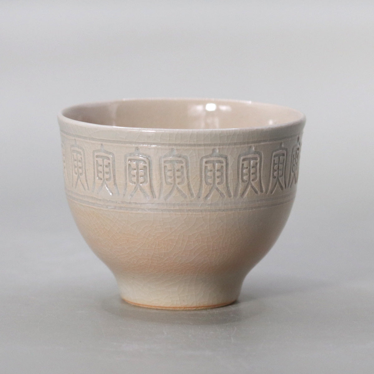 淡く乳白がかった釉肌に、抽象化された「寅文(とらもん)」が静かにめぐる本作は、九代 高橋道八様による「十二支ぐい呑」シリーズの一作です。