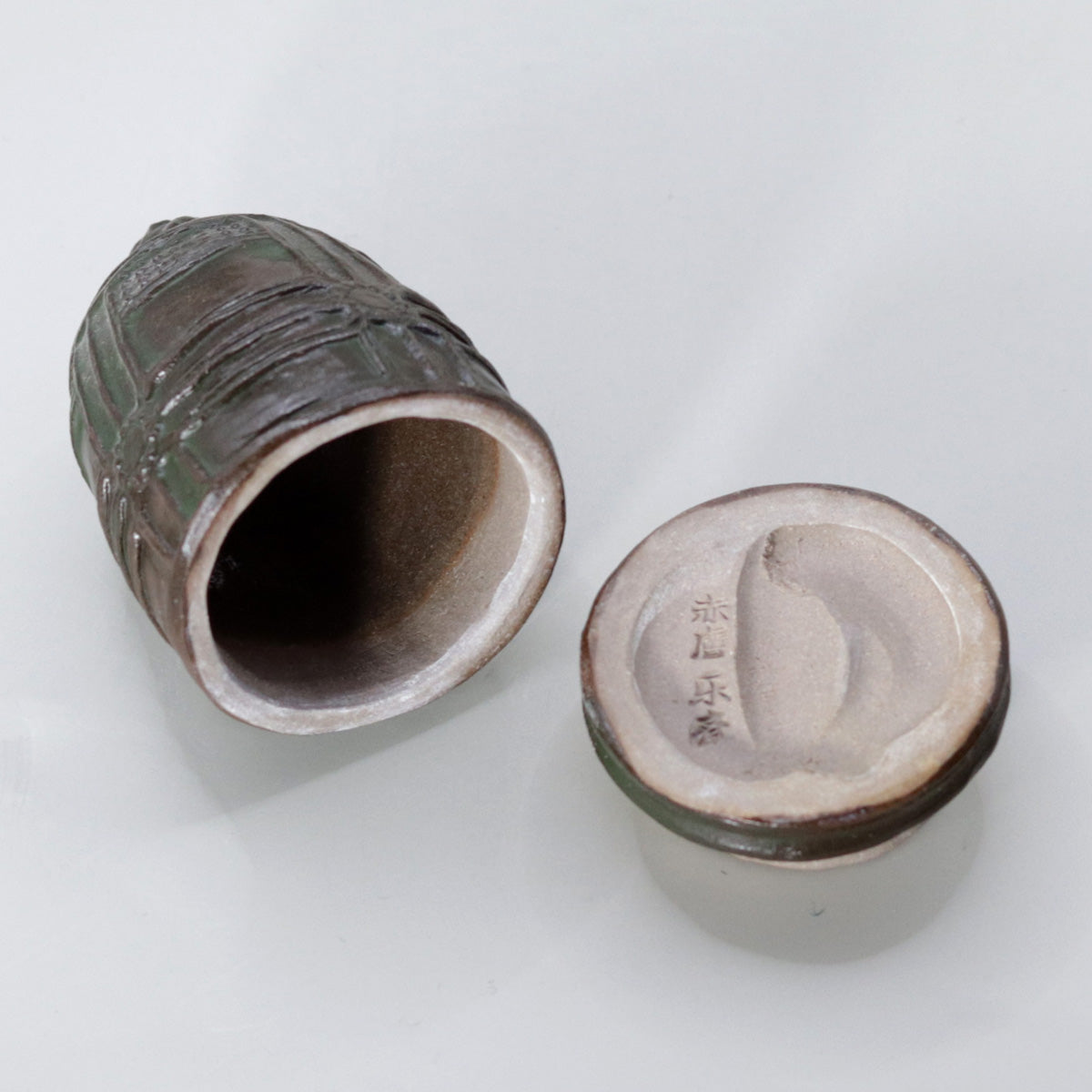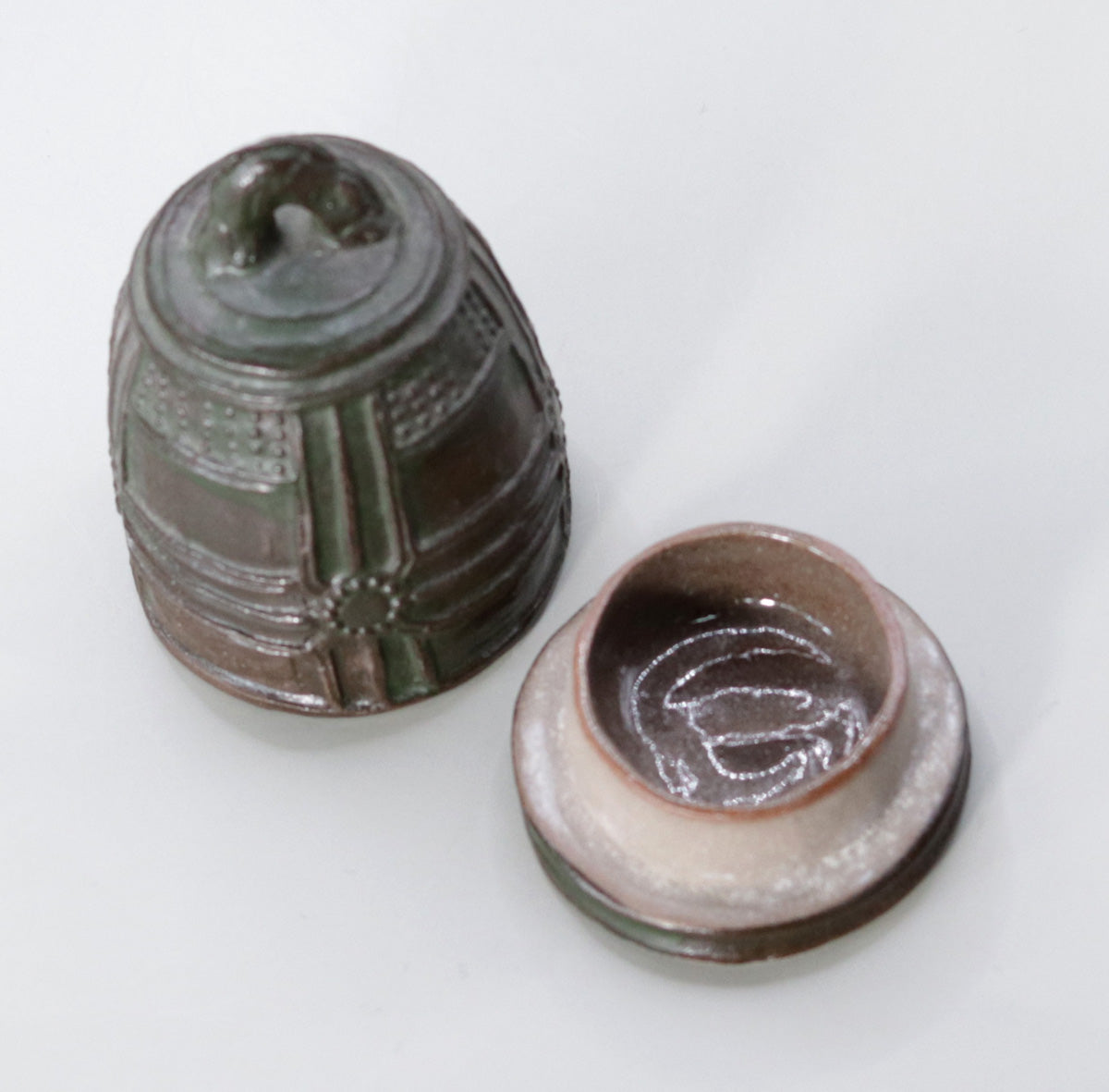 This incense container was created by the master of Akahada ware from Nara, Onishi Rakusai, and is a small piece that replicates the Todaiji Temple bell, a national treasure, in the palm of your hand. It has a lid and is designed to hold incense paste or fragrant wood in the hollow part of the body, making it perfect for *nagori (a last vestige of a past life)/saibo (a year-end gift)* at a tea ceremony, or for New Year's Eve.