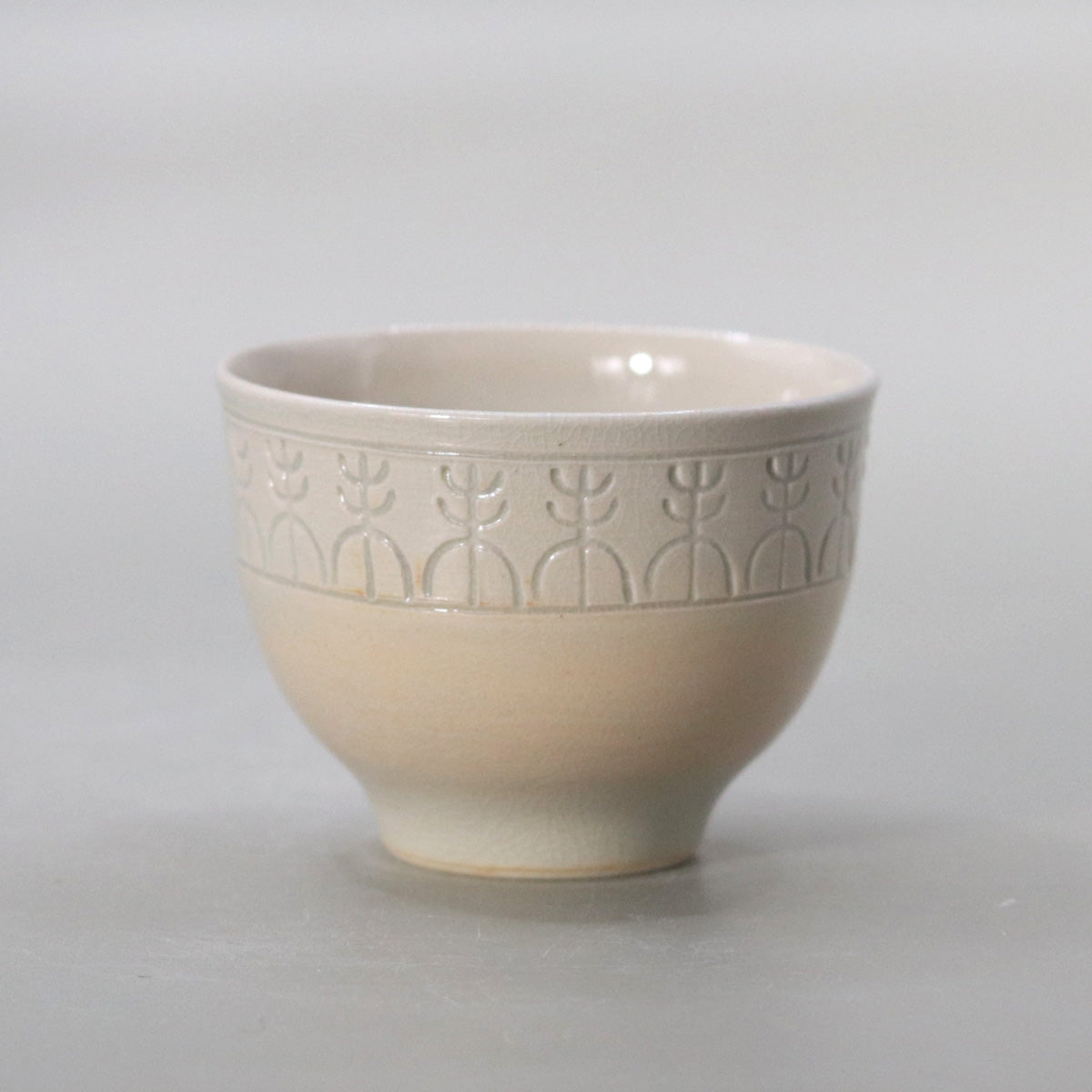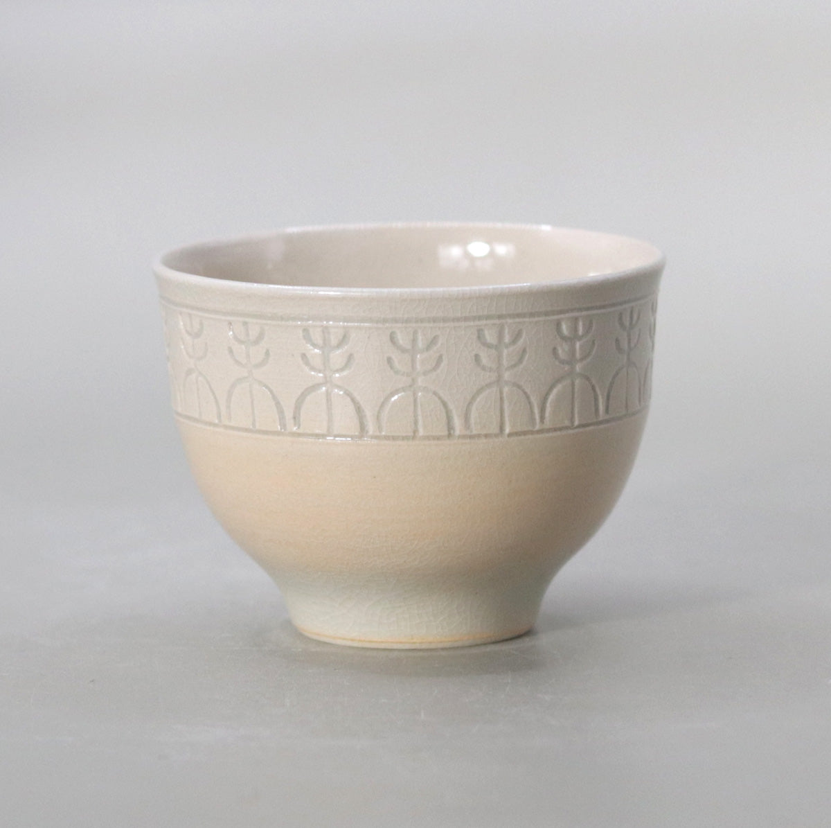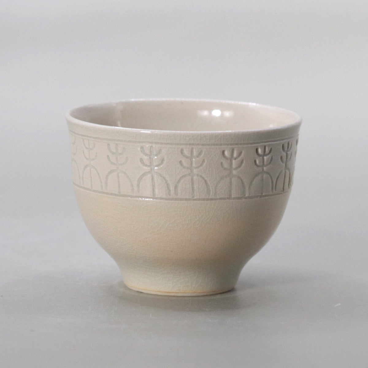 本作「ぐい呑 未」は、乳白釉の静謐の中に刻まれた優しい律動が心に響く逸品。