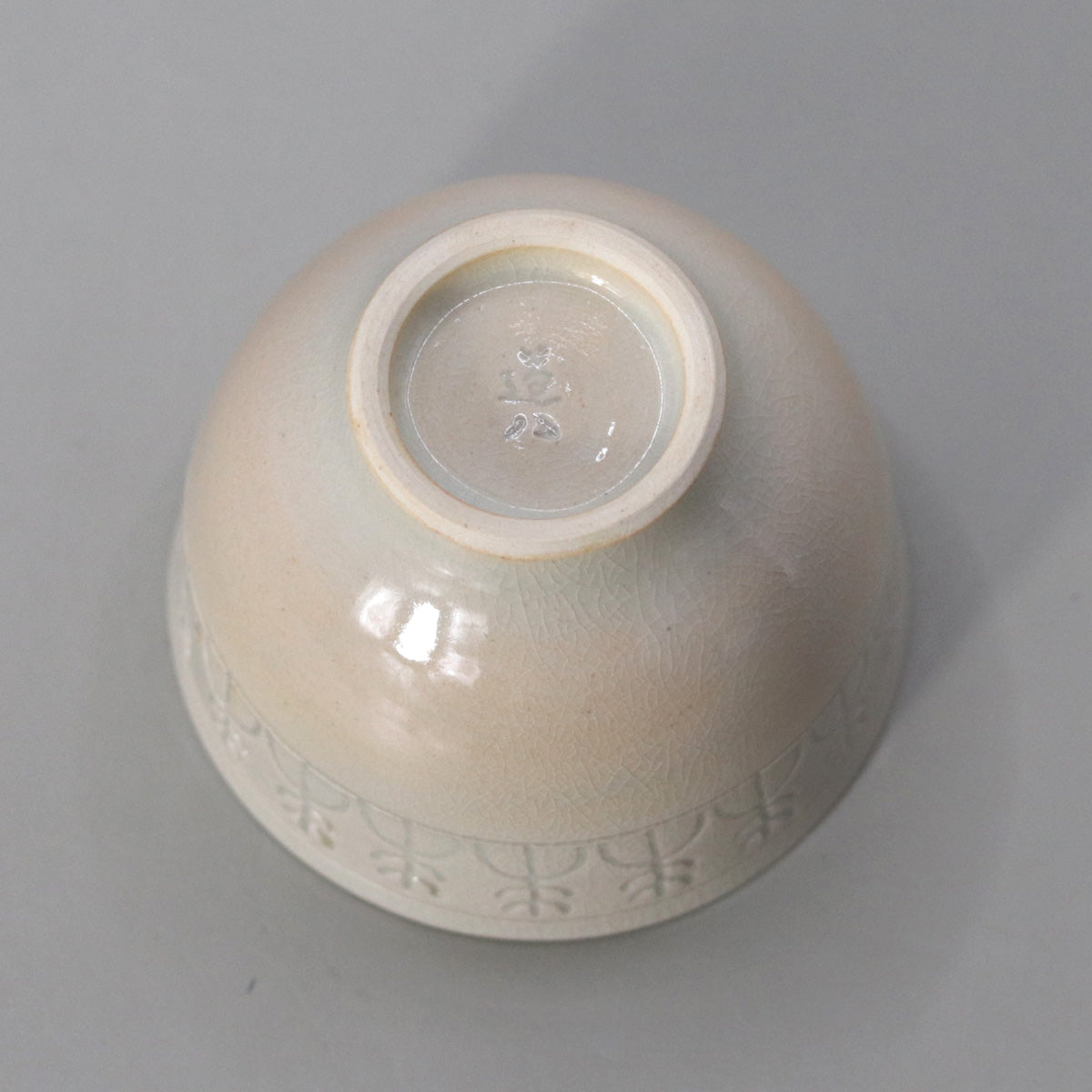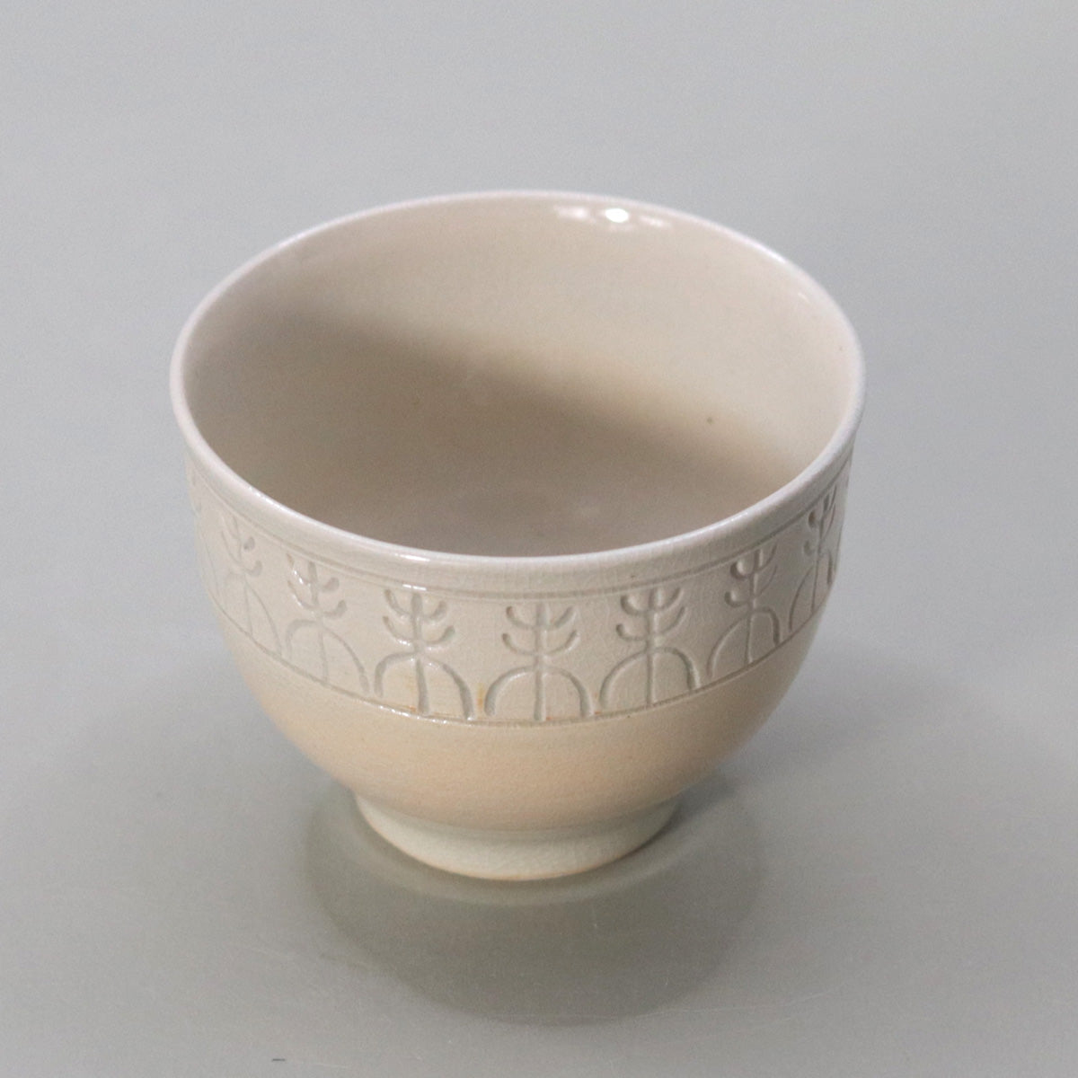 淡くやわらかな乳白釉に包まれ、口縁下をめぐる文様が静かに浮かび上がる本作は、九代 高橋道八様による「十二支ぐい呑」シリーズの一作、「未(ひつじ)」です。