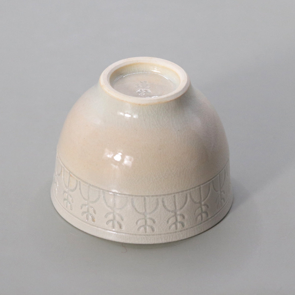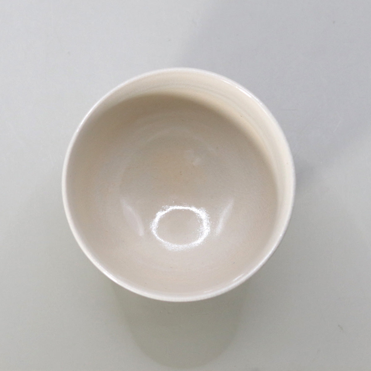 釉薬は淡くやや厚みをもたせた乳白色で、光を受けると穏やかに照り返します。表面には細やかな貫入が生じ、時とともに微かな染みを取り込みながら、景色を深めてゆきます。高台まわりには火のあたりによる柔らかなベージュ色が滲み、静けさの中にぬくもりを添えています。