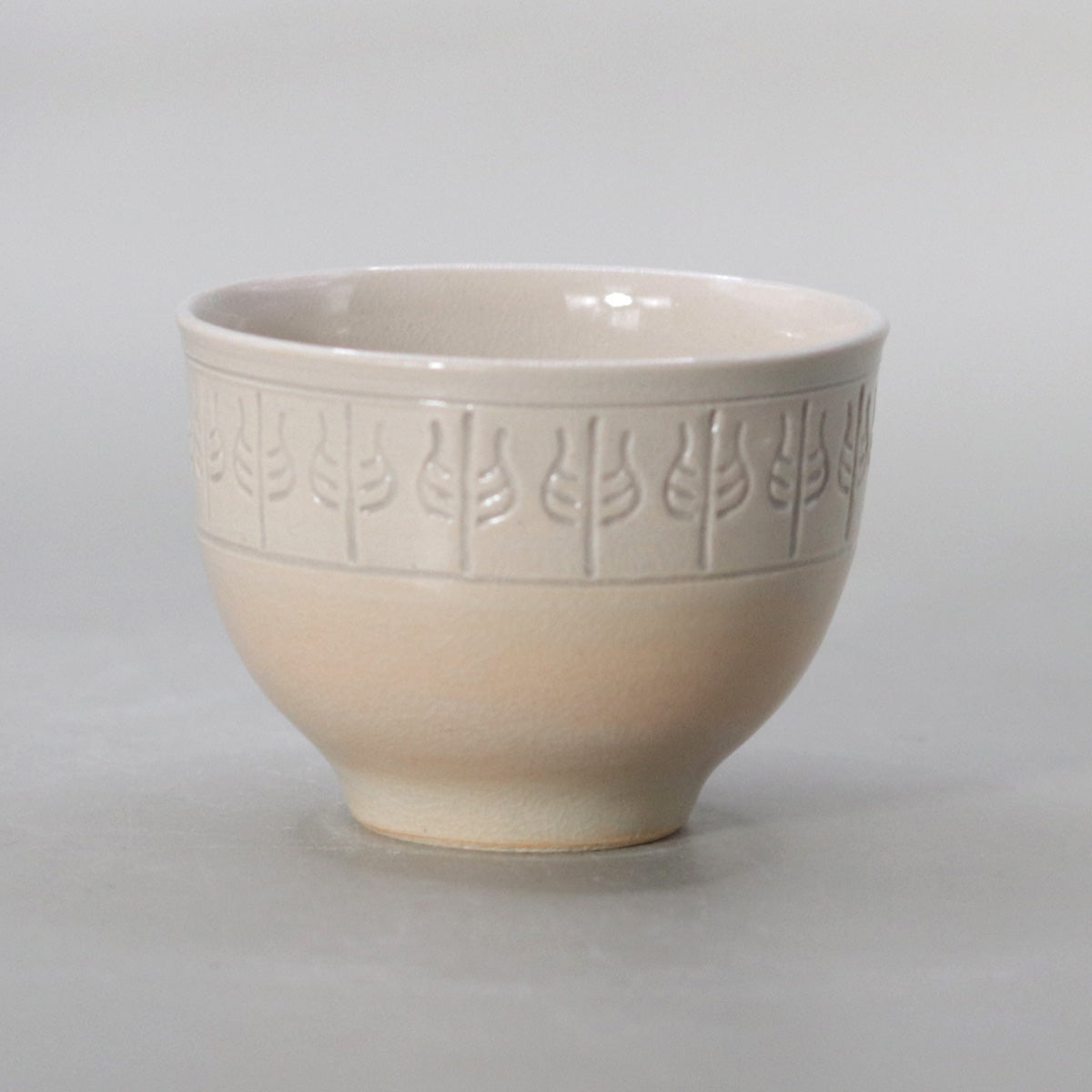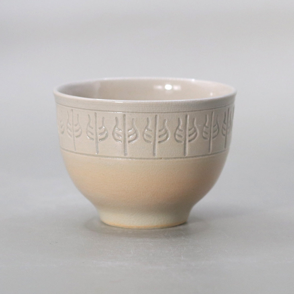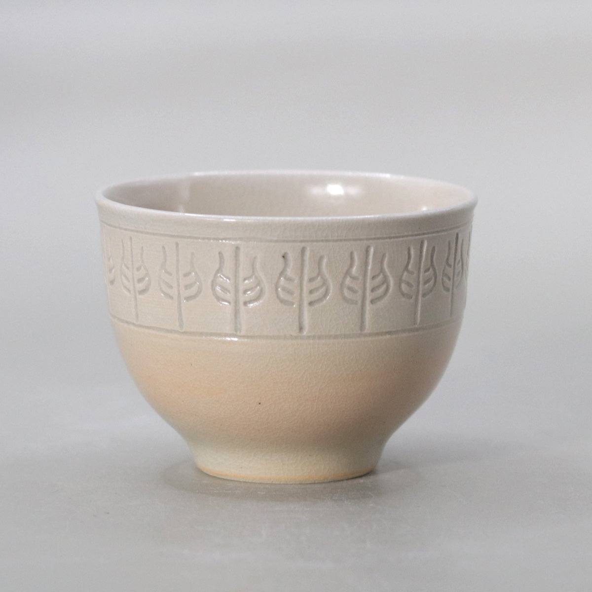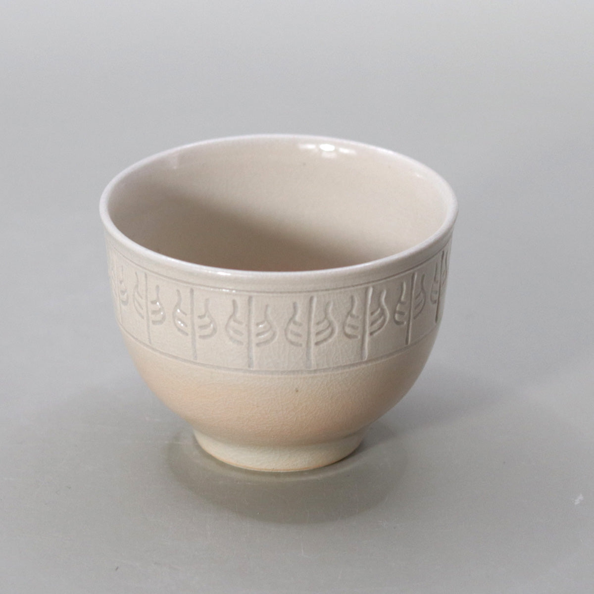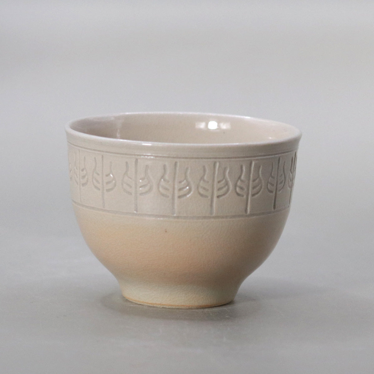 本作「ぐい呑 申」は、白釉の静けさの中に、柔らかな刻線が語るように浮かぶ佳品。