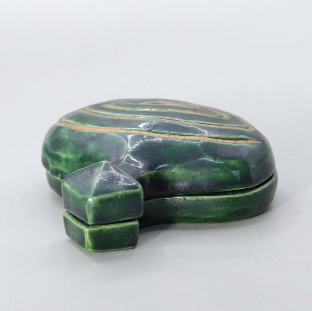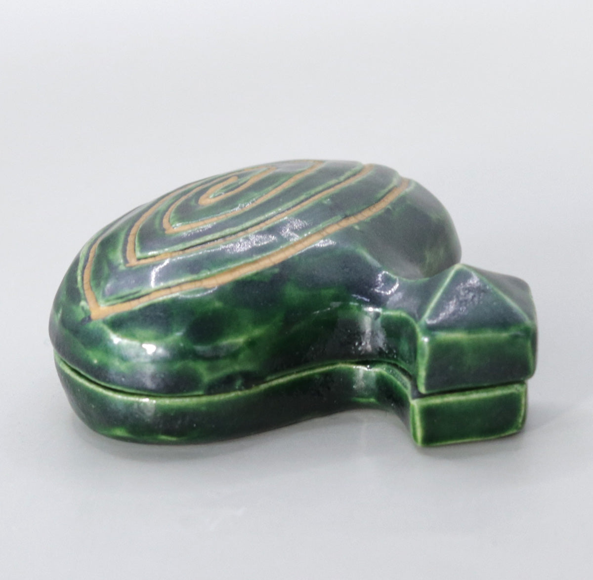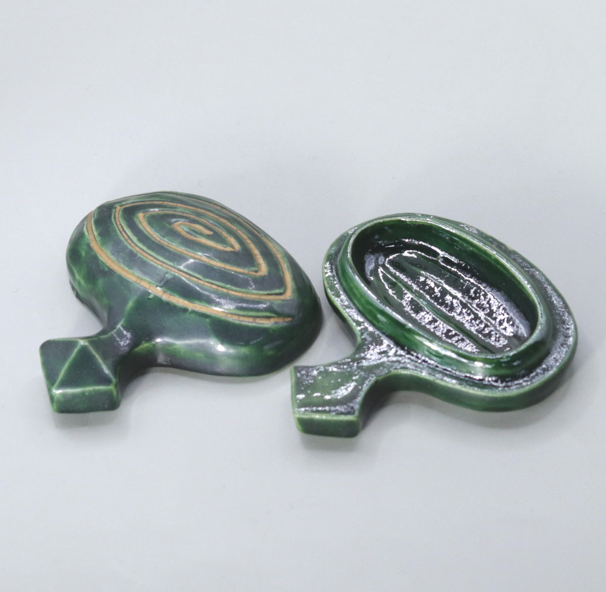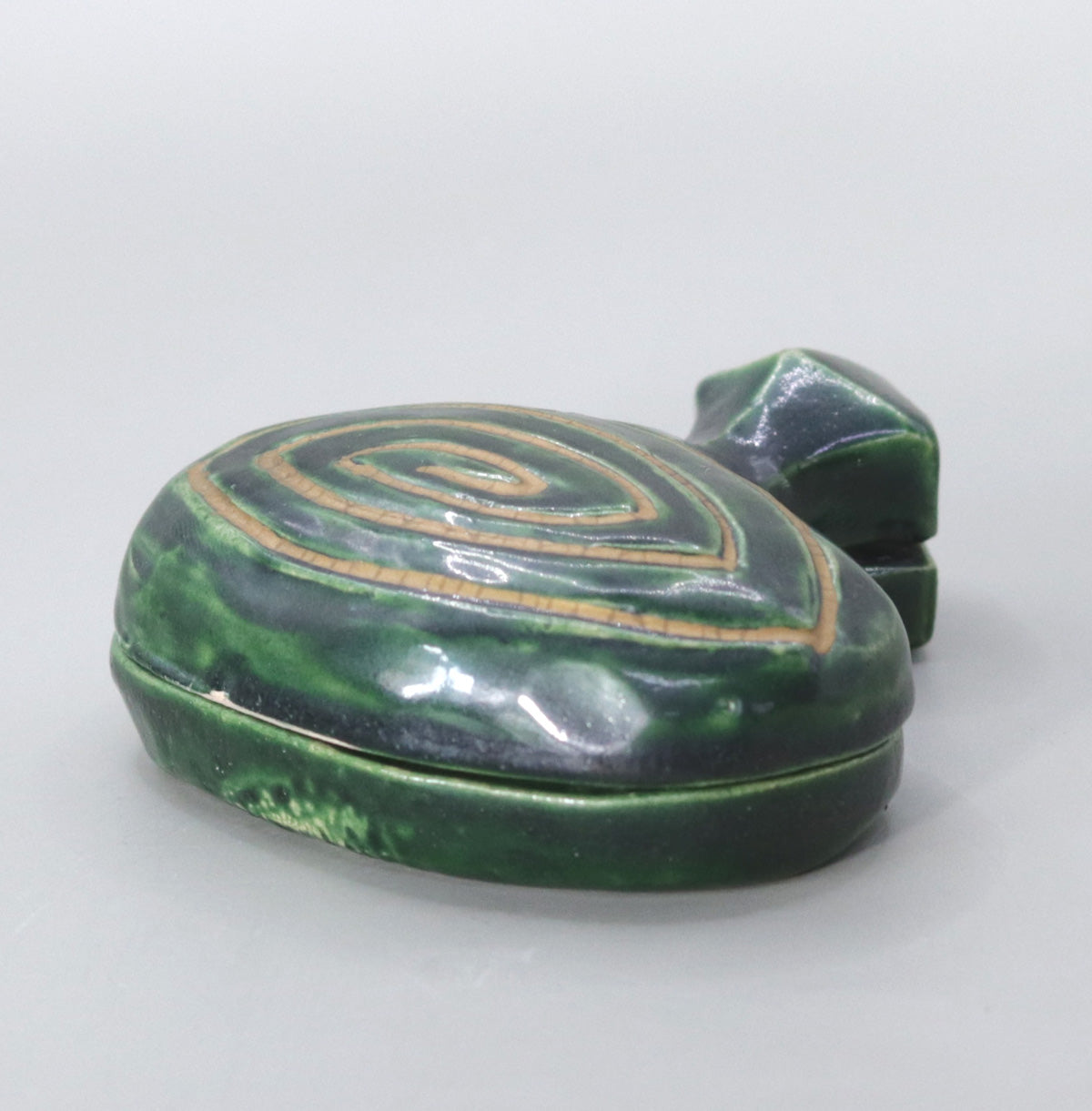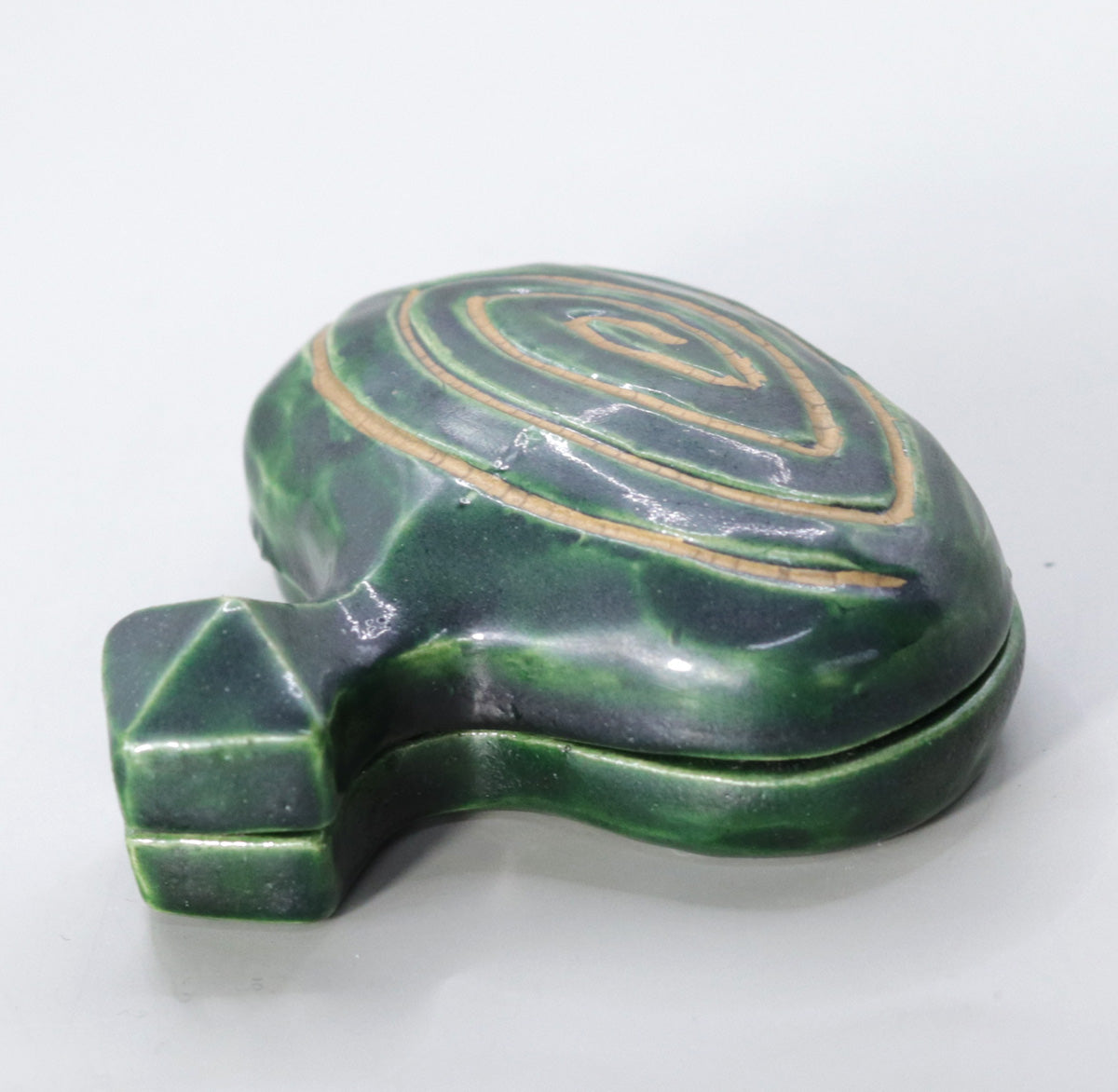 Since the Momoyama period, the spinning top incense container has been highly valued as a representative design of Chinese lacquerware, and has become a typical example of a "shaped incense container" along with lacquerware such as tsuishu, zonosei, and aogai. In particular, the "doma-nuri" style, which uses lacquer painted in concentric circles of vermilion, yellow, and green, is a highly prestigious design that was also used in Shoin decorations. This piece reinterprets this style in a ceramic body, bringing together the warm and elegant earthenware color characteristic of Akahada ware with a modern deep green glaze.