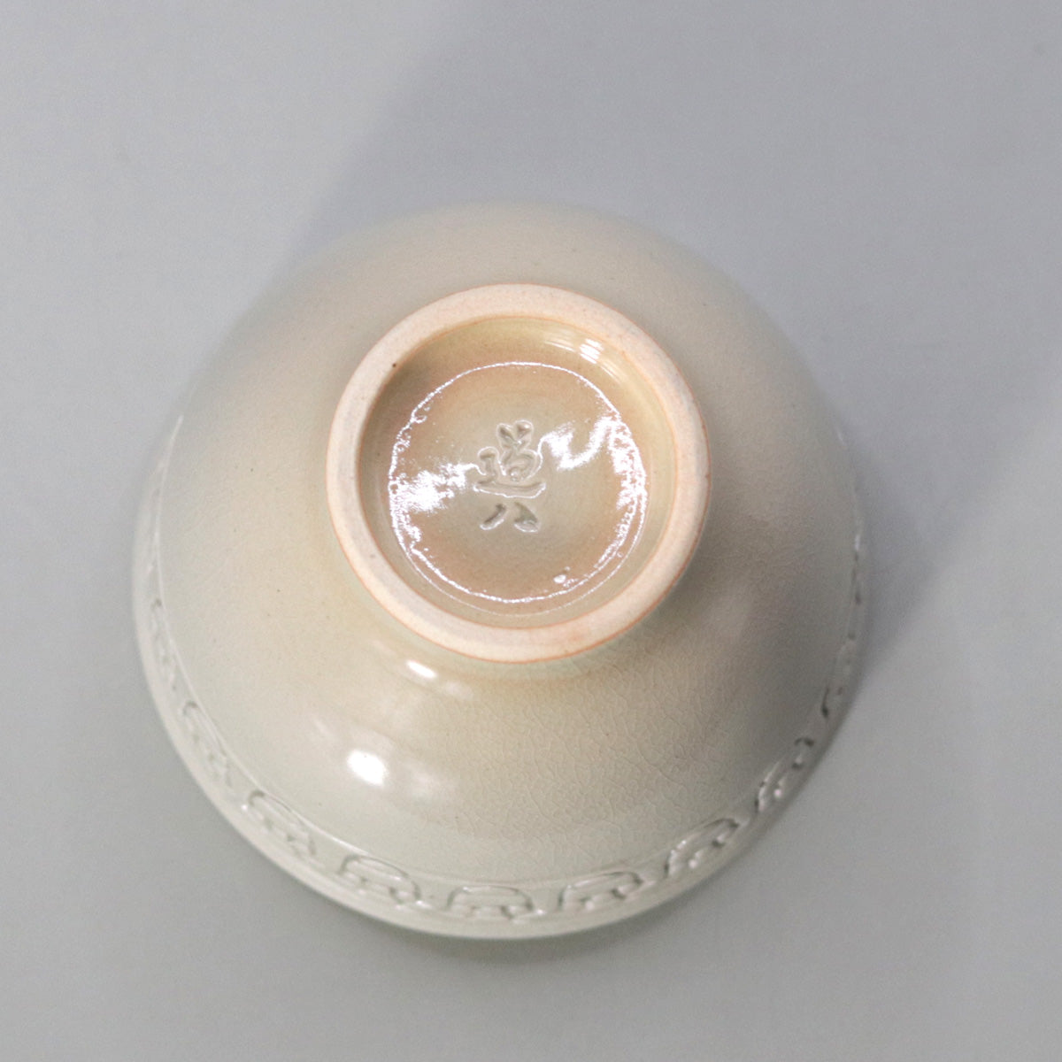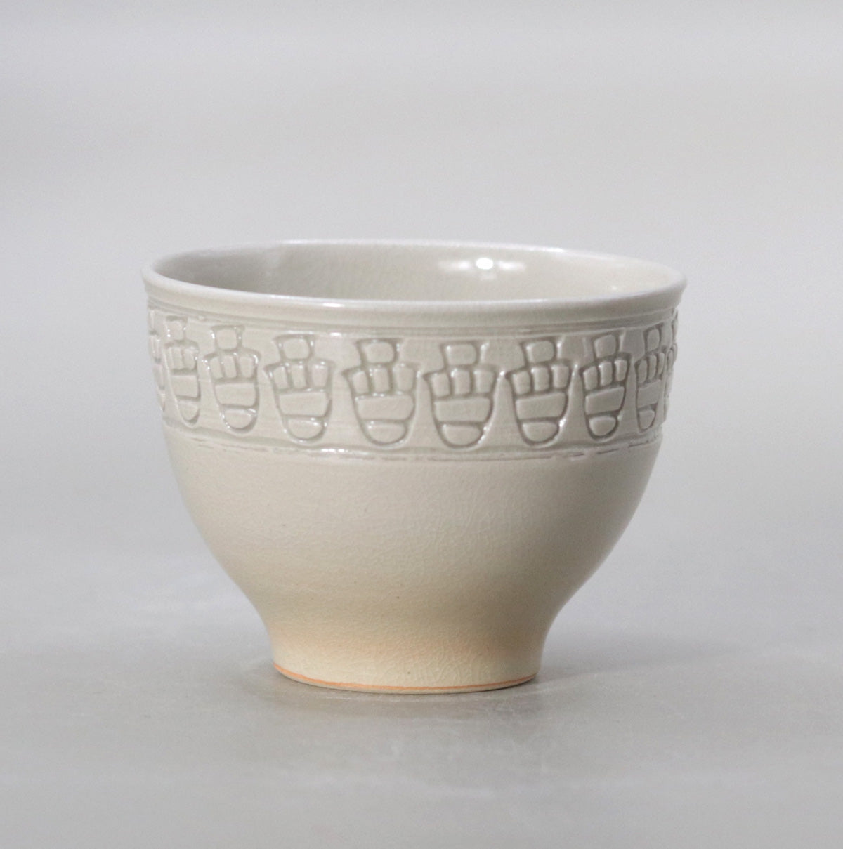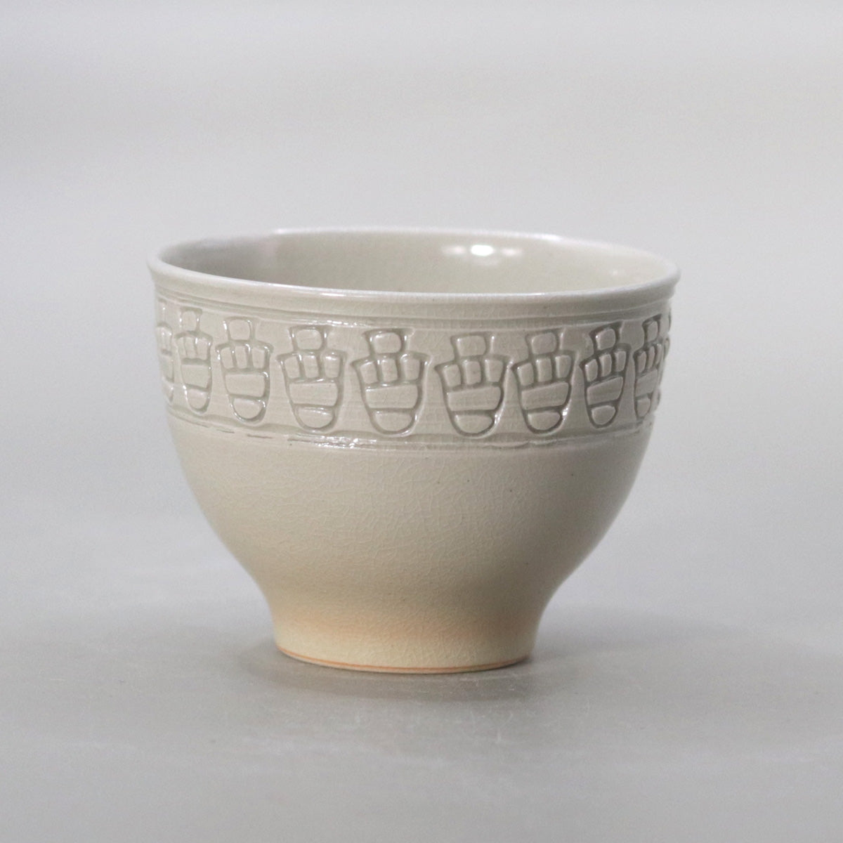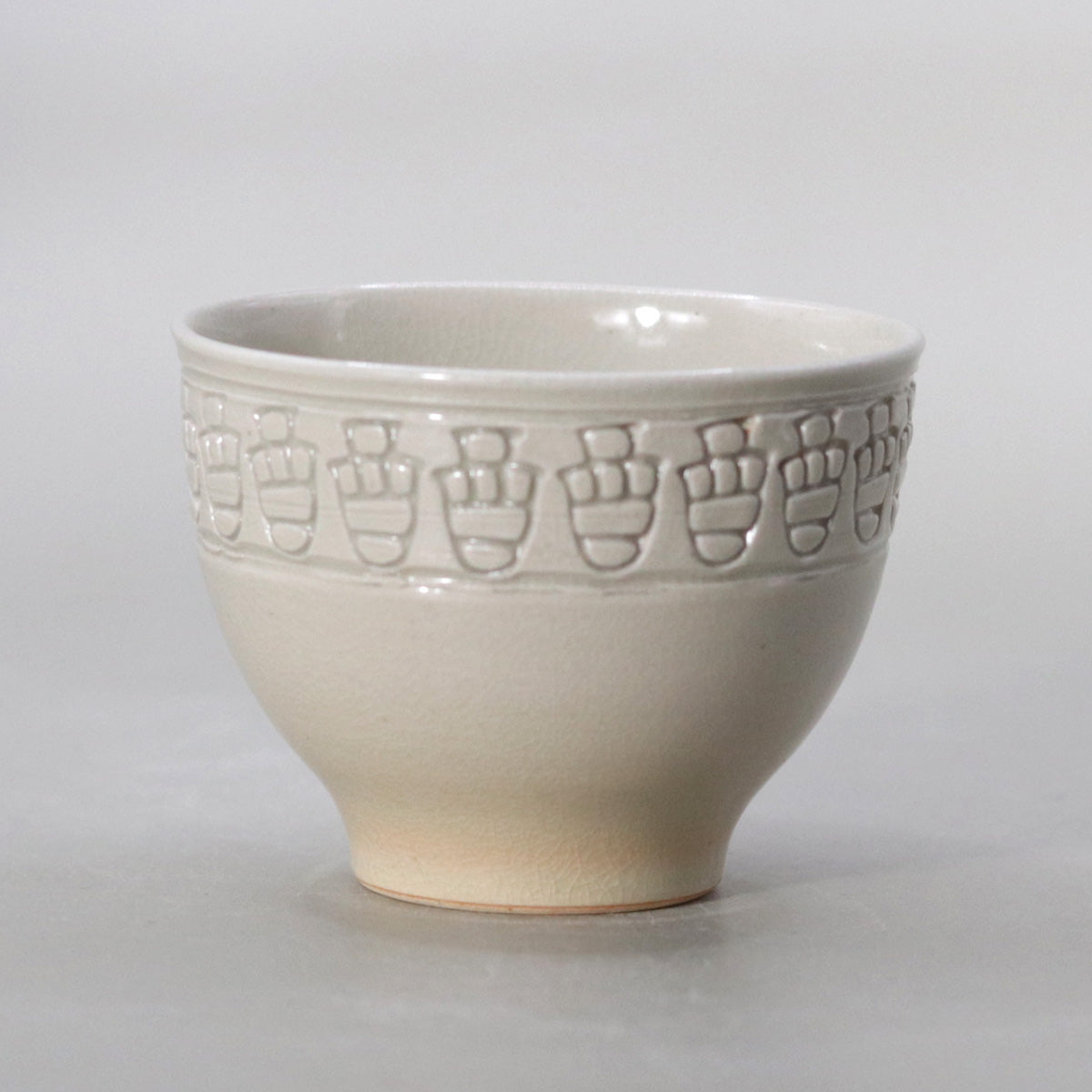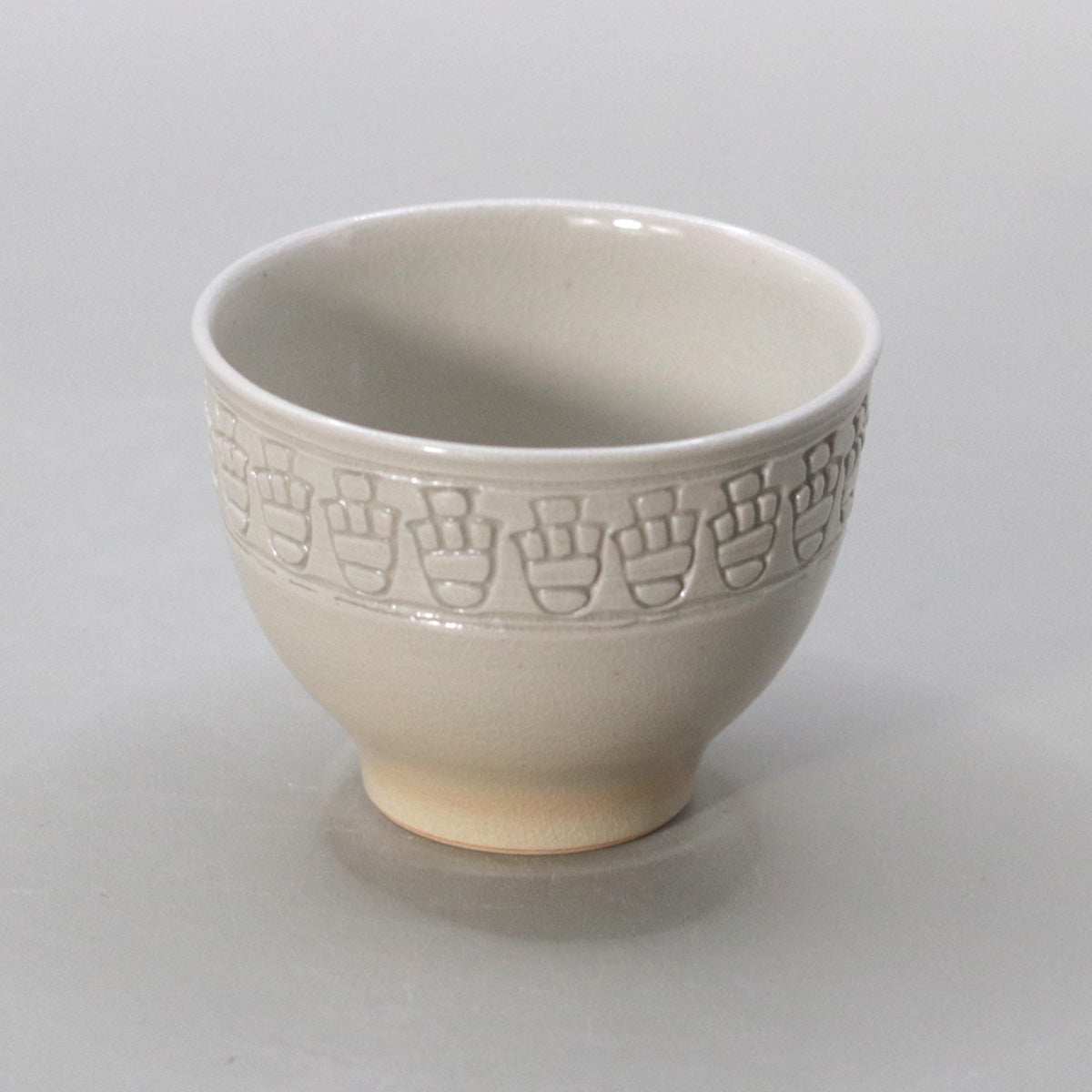 本作「ぐい呑 酉」は、白釉の静謐な世界に刻まれた連続文が、まるで羽ばたく鳥の群れのように生命の律動を奏でる逸品。掌に収まる小宇宙の中に、永遠と再生の祈りが静かに息づいています。