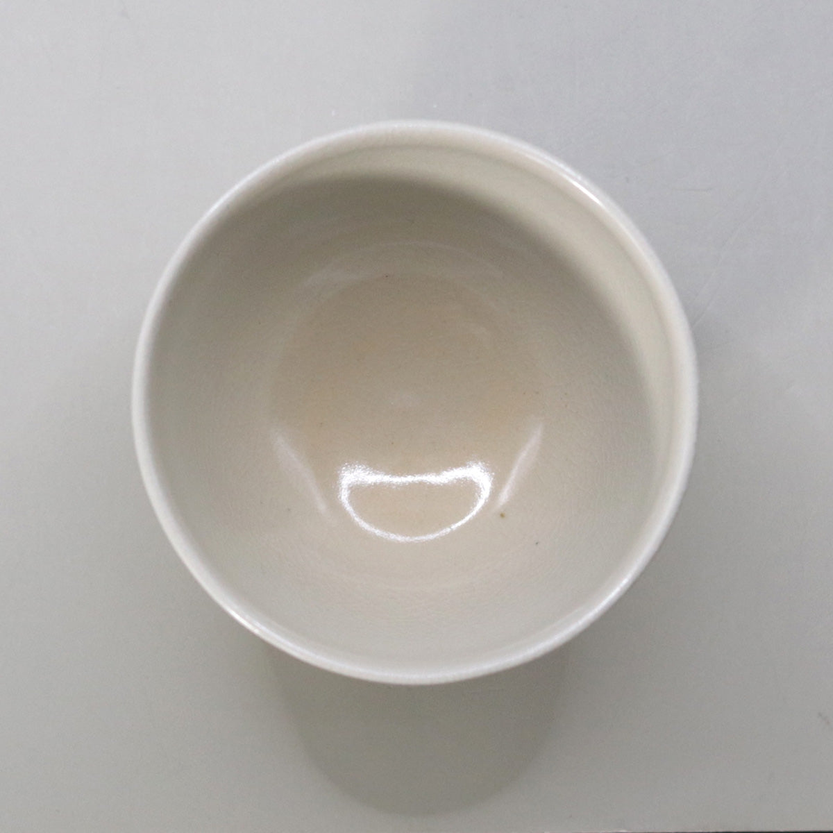 全体を包む乳白釉は、やや厚みを持たせた施釉で、柔らかく光を反射しながら穏やかな艶を放ちます。表面には細やかな貫入が走り、長年の使用により茶や酒が染み入ることで、時を重ねるごとに景色が深まってゆきます。高台付近にはわずかに胎土の赤味がのぞき、白の中に温もりを添えています。