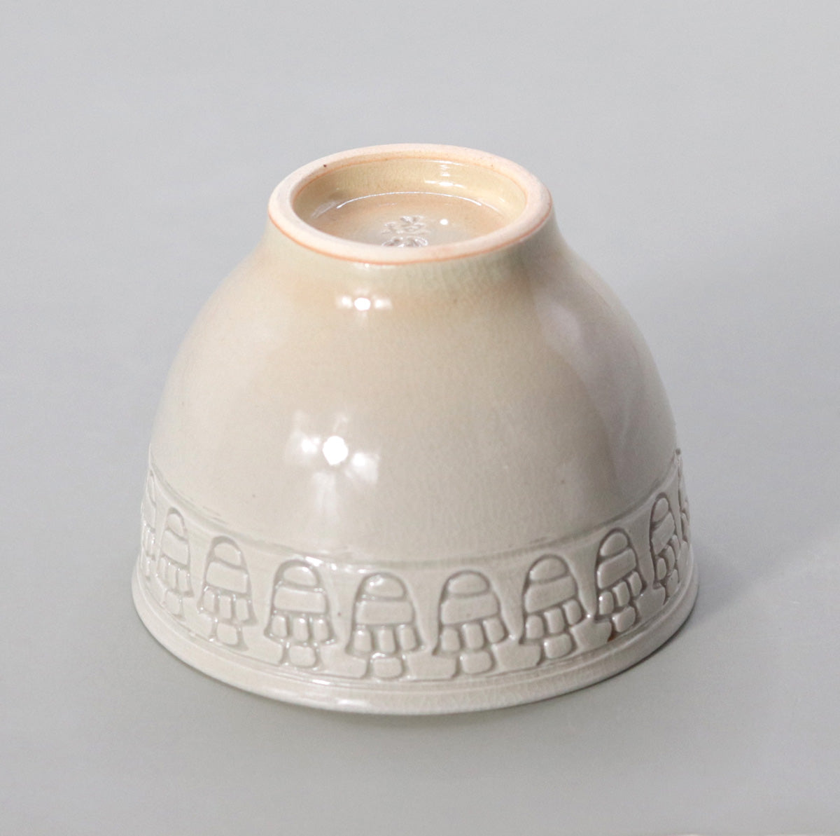 口縁下をぐるりと巡る刻文は、抽象化された「酉(とり)」を表す意匠です。規則正しく並ぶ形は、翼を広げた鳥を思わせ、飛翔・発展・吉兆の意味を内に秘めています。古来、酉は「取り込む」「実りを収める」と通じ、商売繁盛や豊穣の象徴としても親しまれてきました。本作では、その象徴性を端正な連続文として昇華し、静寂の中に生命の律動を感じさせます。