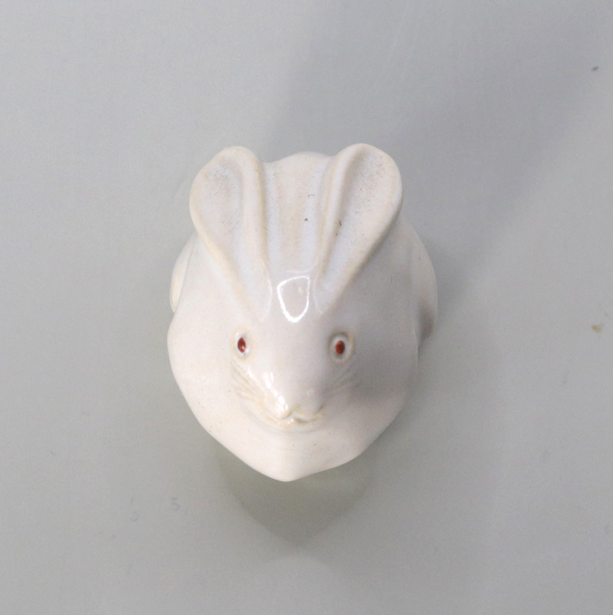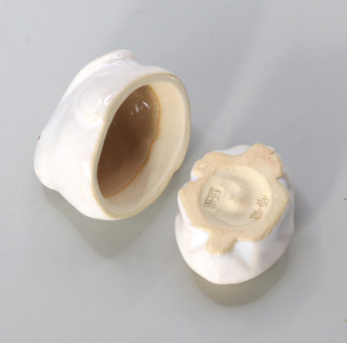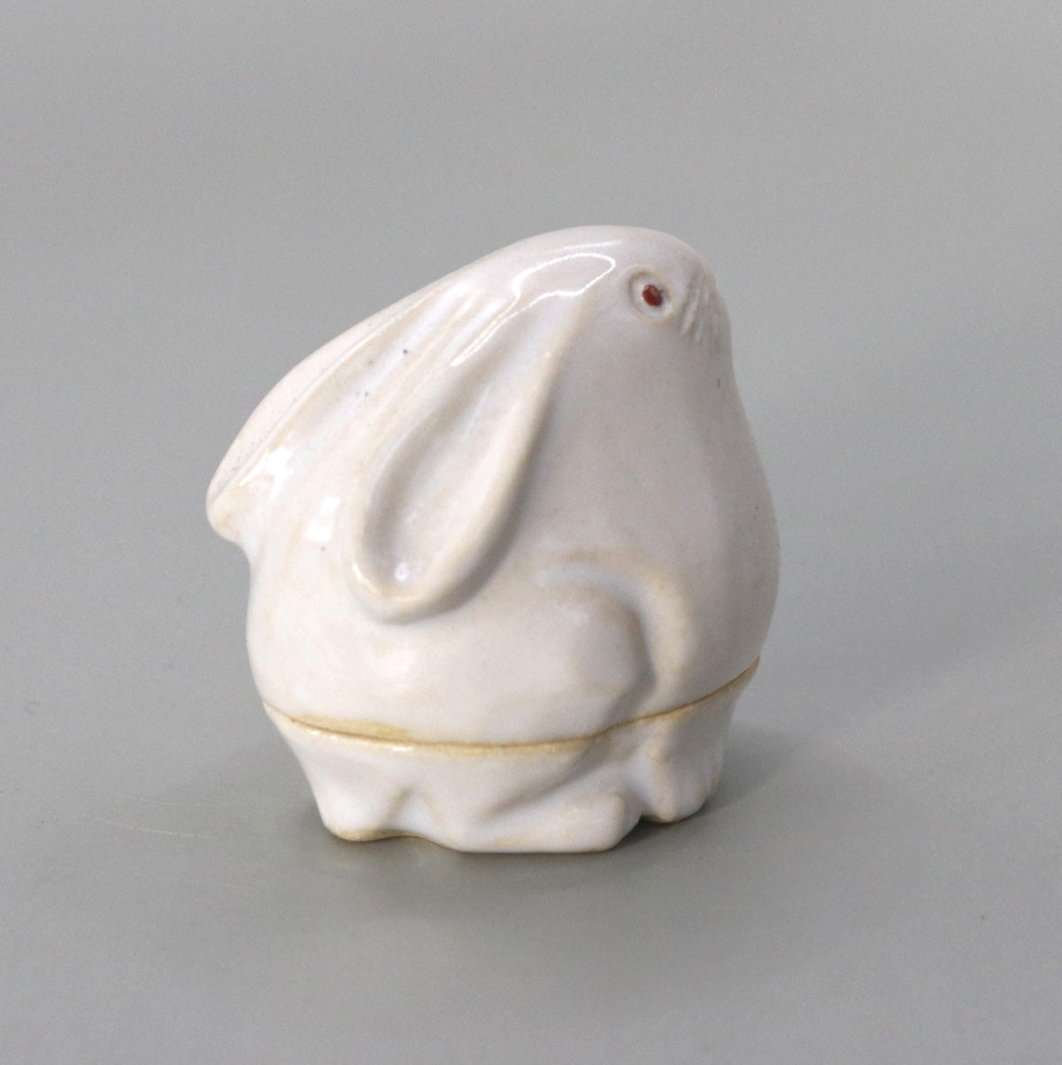 This is a rabbit-shaped incense container made by Yashiro Onishi Rakusai, a master craftsman of Akahada ware from Nara. Though it is a small piece, just over five centimeters in diameter, it is adorable with its plump body and round red eyes, and its two-part structure of the lid and body makes it practical for storing incense paste and pieces of aloeswood. The soft luster of the milky white glaze, combined with the faint pink color of the Akahada clay, makes this a graceful masterpiece reminiscent of a snow rabbit illuminated by moonlight.